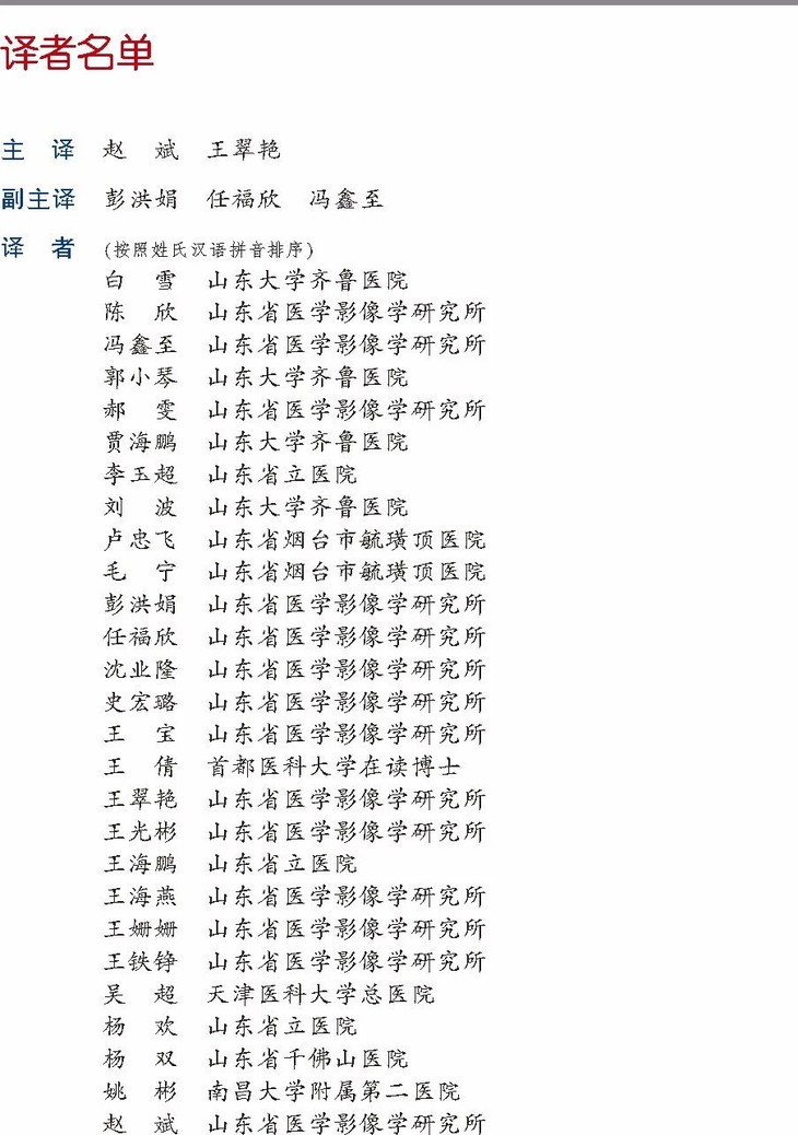 王翠艳,医学博士,主任医师,山东大学硕士生导师。美国得克萨斯大学MD安德森癌症中心访问学者。荣获“山东省十佳青年医师”。中华医学会放射学分会磁共振专业委员会心胸学组委员,中国研究型医院学会放射学分会青年委员,山东省医学会放射学分会乳腺学组副组长、青年委员会委员,山东省医学影像学研究会神经放射专业委员会委员兼秘书。主持省级课题2项,参与国家及省级课题10余项,获山东省医学科技进步奖三等奖1项。发表论文20余篇,其中SCI收录6篇。参编著作5部,参译著作4部,其中主译、副主译各1部。