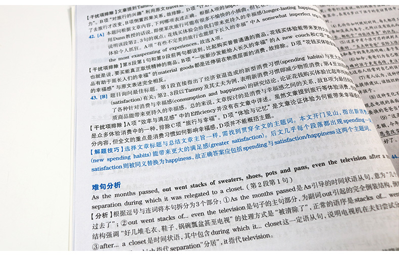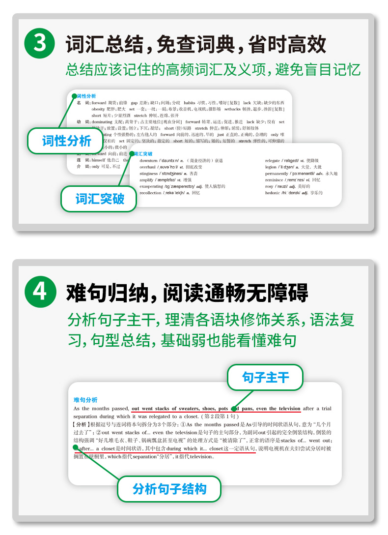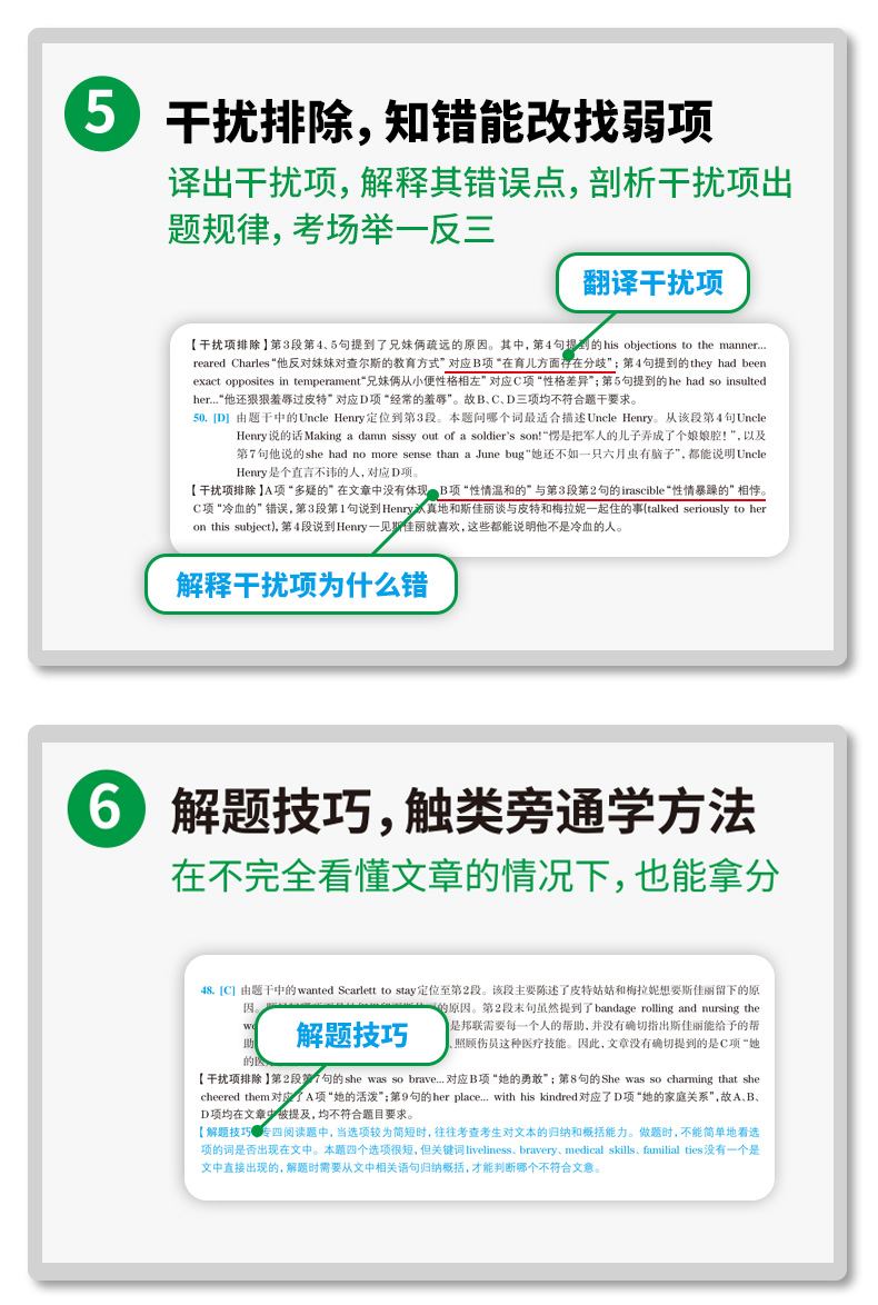 4. 真题淘金式详解6大模块,适合基础弱考生:听力双语字幕、全文翻译、难句归纳、词汇注释、解题技巧、干扰项排除;