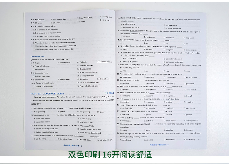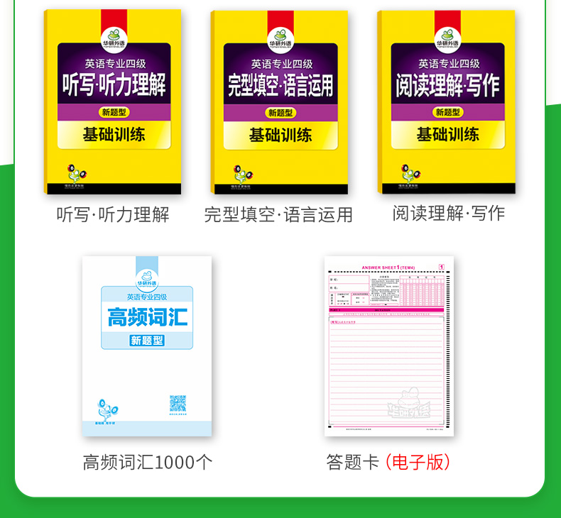 3. 大题量训练:10套真题+20篇听写+10篇讲座+16篇会话+10篇完型+10套语言运用+23篇阅读+10篇作文;
