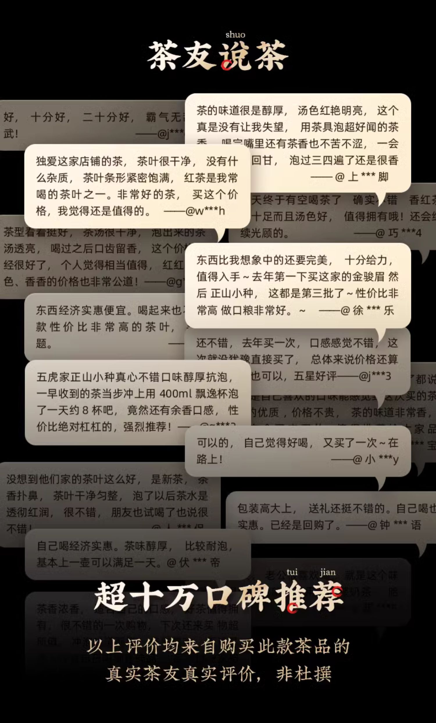 【品名】:五虎正山小种【规格】:600g【发货地 / 产地】:福建安溪、福建【包装方式】:纸箱,发圆通速递【不包邮区域】:新疆、西藏、甘肃、青海、宁夏、内蒙古、不包邮,港澳台不发货【温馨提示】周末照常发货,下单后安排打包发货,一般48小时内发货,到货时间约为2-4天 |