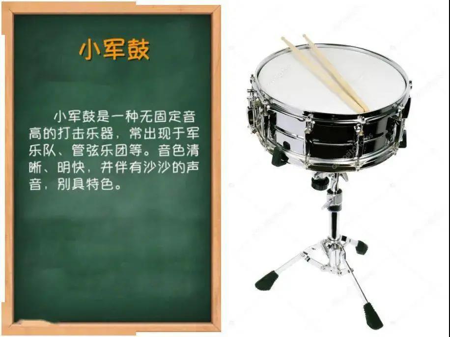 无固定音高,只能演奏出节奏和声音的变化。如小军鼓、三角铁、镲等。