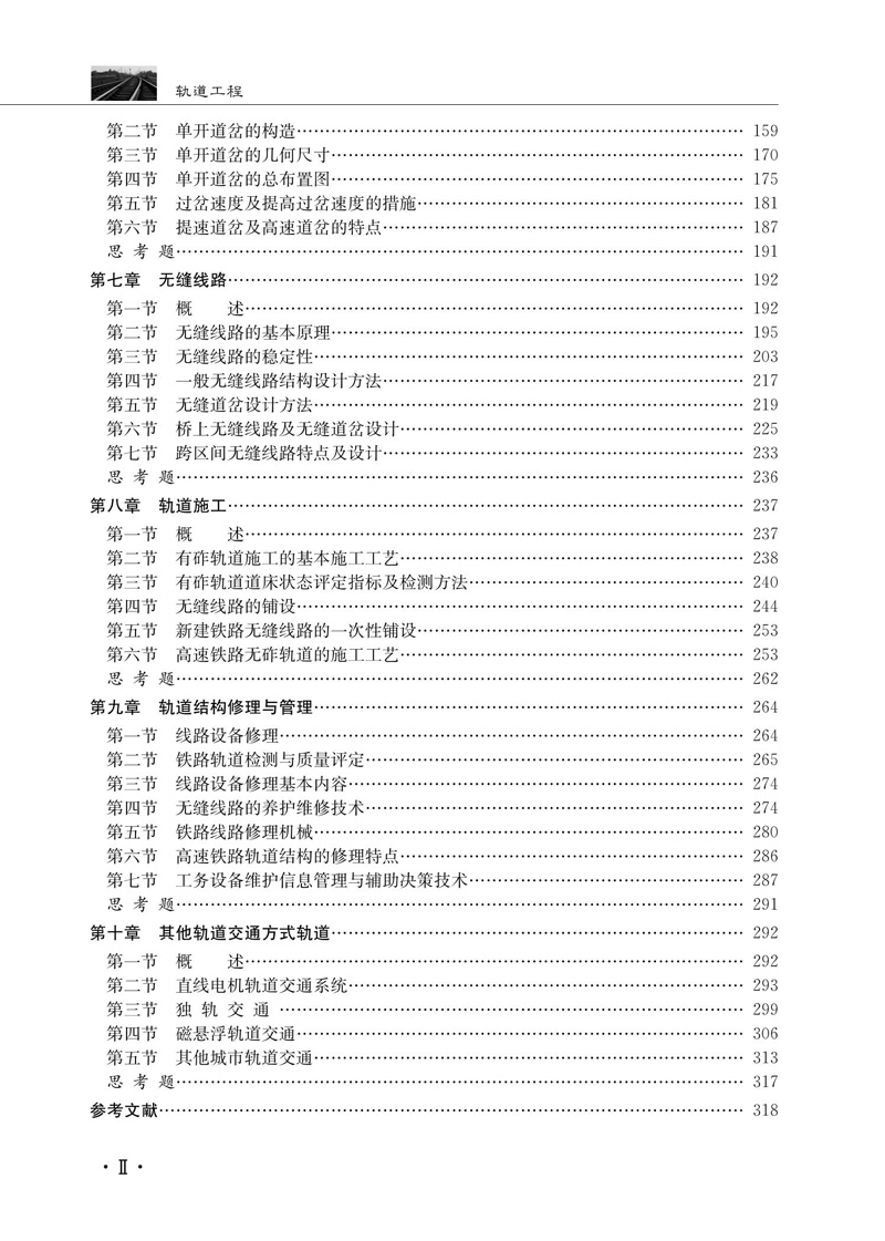 本书是;十二五普通高等教育本科国家规划教材、北京高等教育精品教材、普通高等学校铁道工程专业新编系列教材。全书共分十章,主要包括绪论、有砟轨道结构、无砟轨道结构、轨道几何形位、轨道结构力学分析、道岔、无缝线路、轨道施工、轨道结构修理与管理、其他轨道交通方式轨道。本书在系统介绍轨道基本知识的基础上,把全新的研究成果、工程实践融入其中。本书为铁道工程及相关专业本科生和相关专业研究生的学习用书,也可以供相关专业技术人员参考。