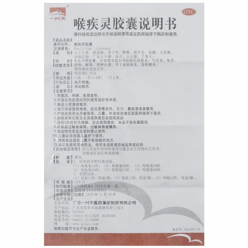 一片天 喉疾灵胶囊24粒/瓶 消肿止痛 急慢性咽炎扁桃体炎清热解毒