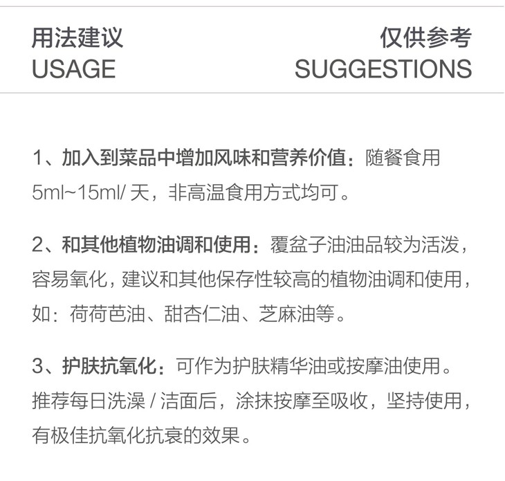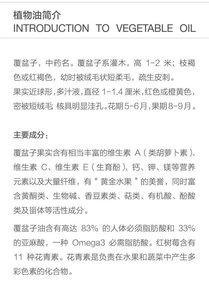 覆盆子油上脸肤感滋润,并不会很油腻,瞬间恢复饱满。覆盆子油还有卓越的保湿性能、舒缓效果、无刺激性,加上全天然的特性,可以镇定炎症肌肤,轻盈而温和的保湿修复,不会堵塞毛孔,反而能促进细胞自然水分的保留,有效减少细纹和皱纹的产生。不挑肤质,都可以用,非常安全!尤其是经常有湿疹、红疹困扰的老粉,冲!