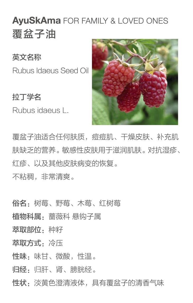 Ayu又上架新的油油了,是珍贵的覆盆子油,几年了,才出这一次,量还巨少!覆盆子油在植物油中真的算蛮金贵的存在了,肤感也确实非常惊人,很适合用来做脸部的直接护理,甚至连眼周这么脆弱的地方都能用,是非常好的天然精华油!就是,库存太少啦,感兴趣的老粉不要犹豫,每人限购2瓶,植物油,从来是不做活动的,大家懂!