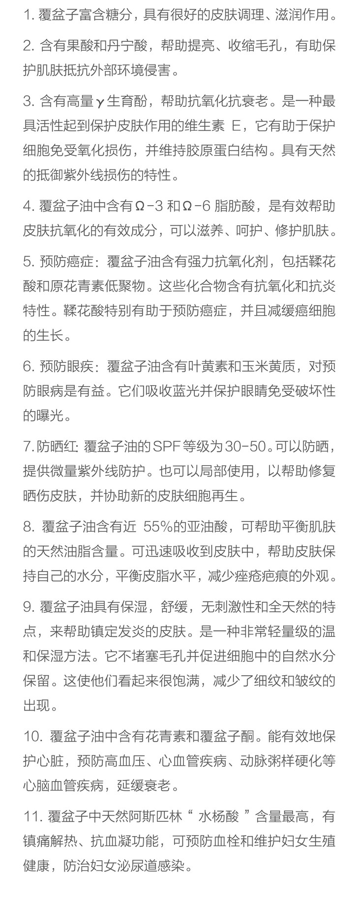 其实,覆盆子油也非常适合口服,因为含有花青素和覆盆子酮,能有效保护心脏,预防高血压、心血管疾病、动脉粥样硬化等心脑血管疾病,还能延缓衰老,再加上天然阿斯匹林"水杨酸"的含量很高,镇痛解热、抗血凝,是可以预防血栓和一些妇科问题的,只是,量少,又贵,成本巨大呀!