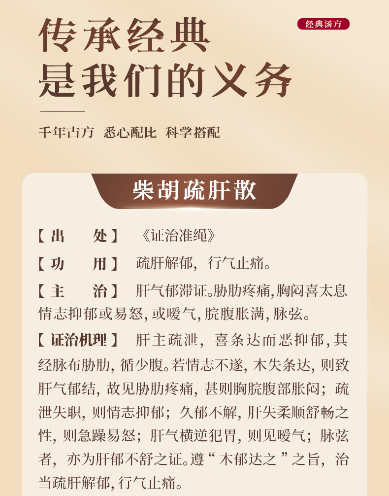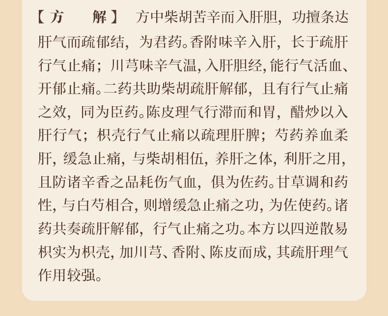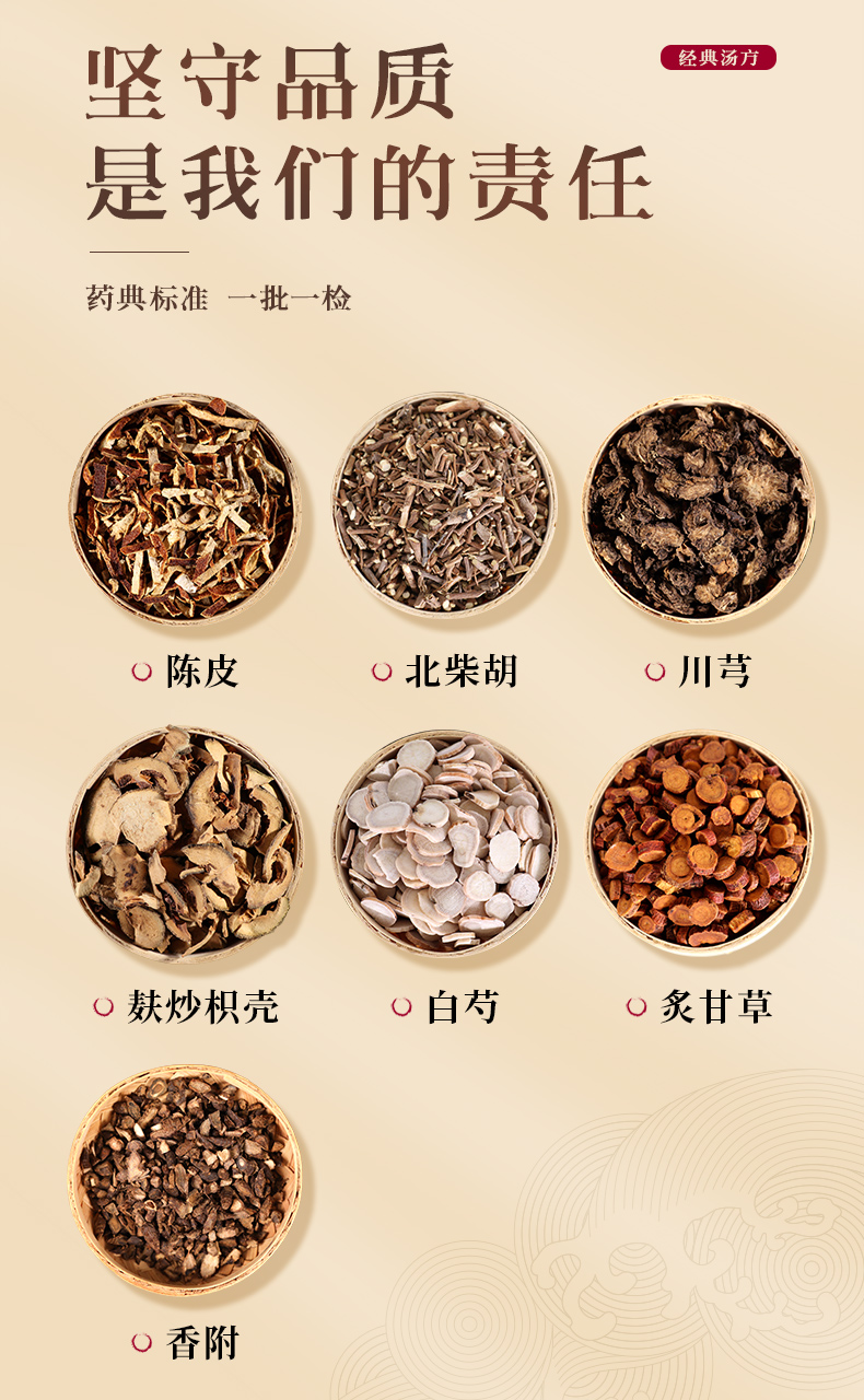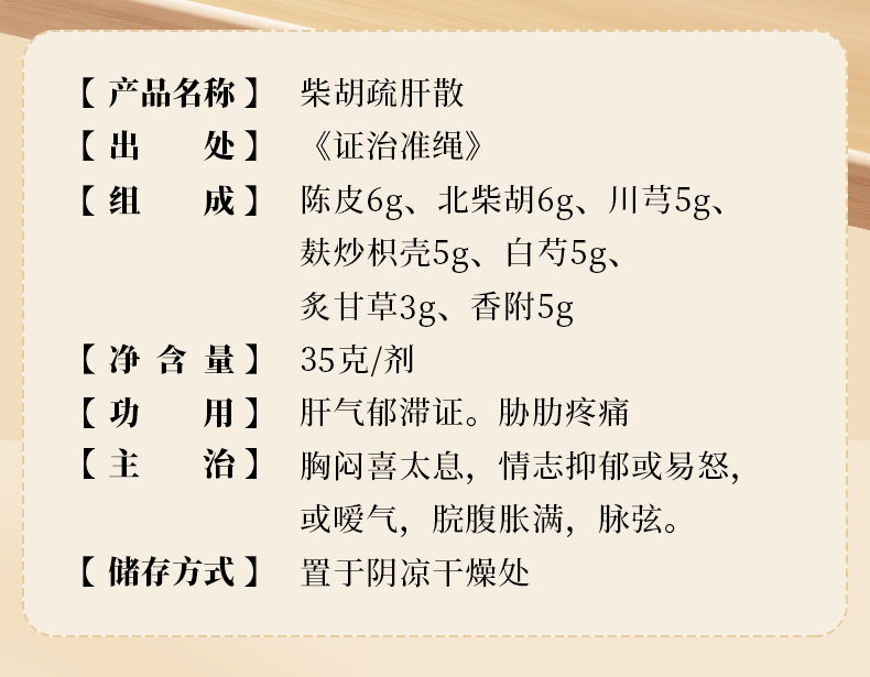 柴胡疏肝散35g/剂(陈皮/柴胡/川芎/麸炒枳壳/白芍/炙甘草/香附) 出自《证治准绳》