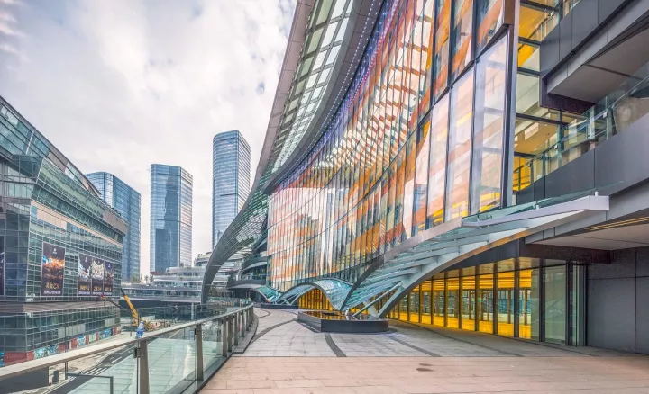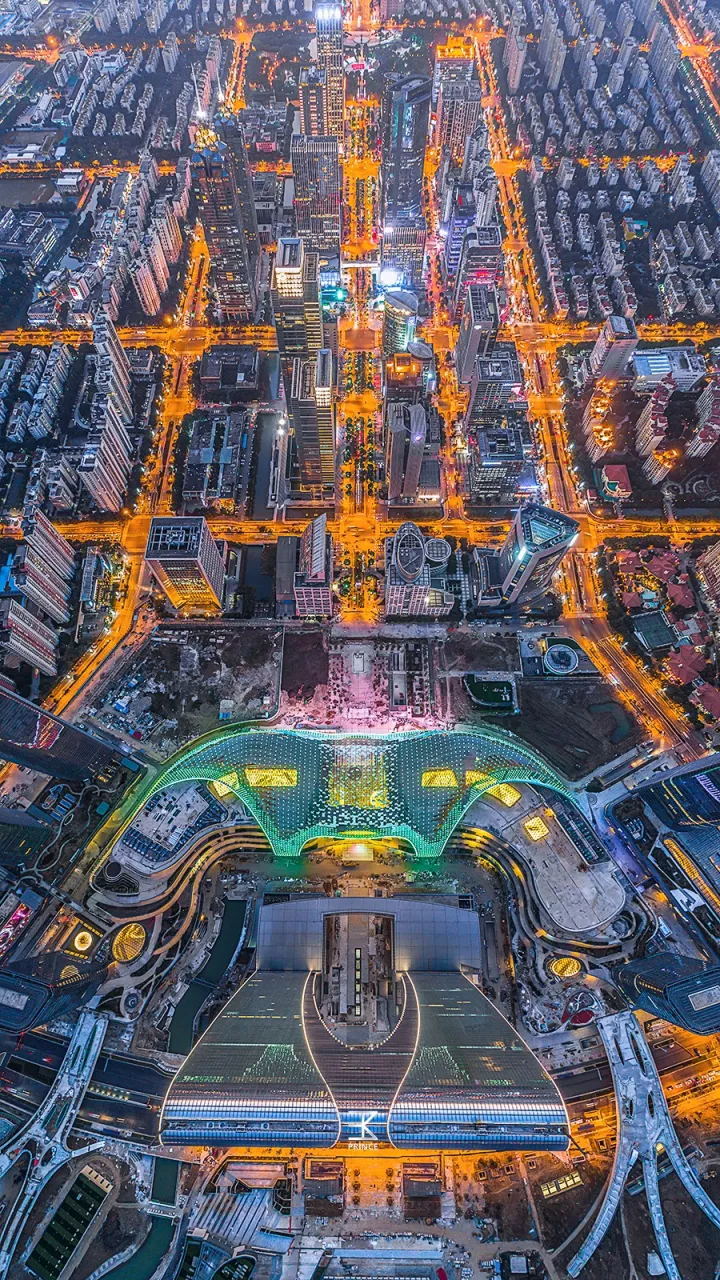 ▲由6,947块曲面玻璃组成的标志性屋顶“未来之翼”,总面积达36000平方米,是世界上最大的曲面屋顶。