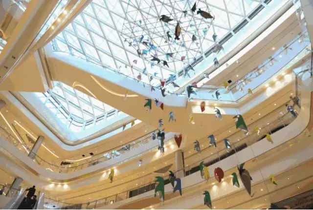 ▲在位于3楼的半开放式中庭“凤园”,总面积达1600平方米!两块全球罕见的百叶窗式巨型LED屏幕,以及独具特色的树状结构观光电梯,可从6楼直通地下1楼。