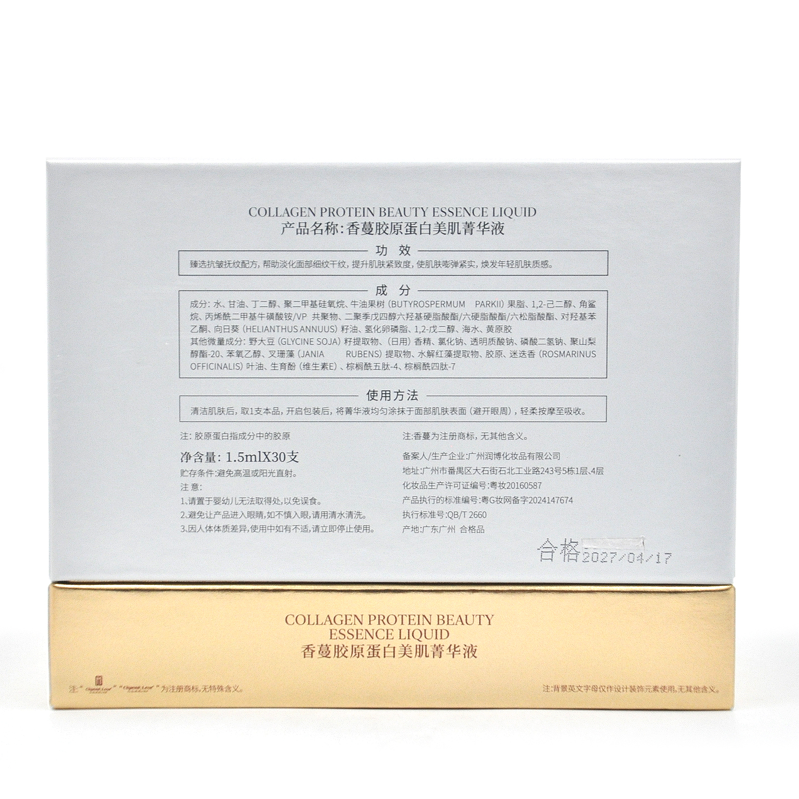 使用方法:清洁肌肤后,取1支本品,开启包装后,将菁华液均匀涂抹于面部肌肤表面(避开眼周),轻柔按摩至吸收。
