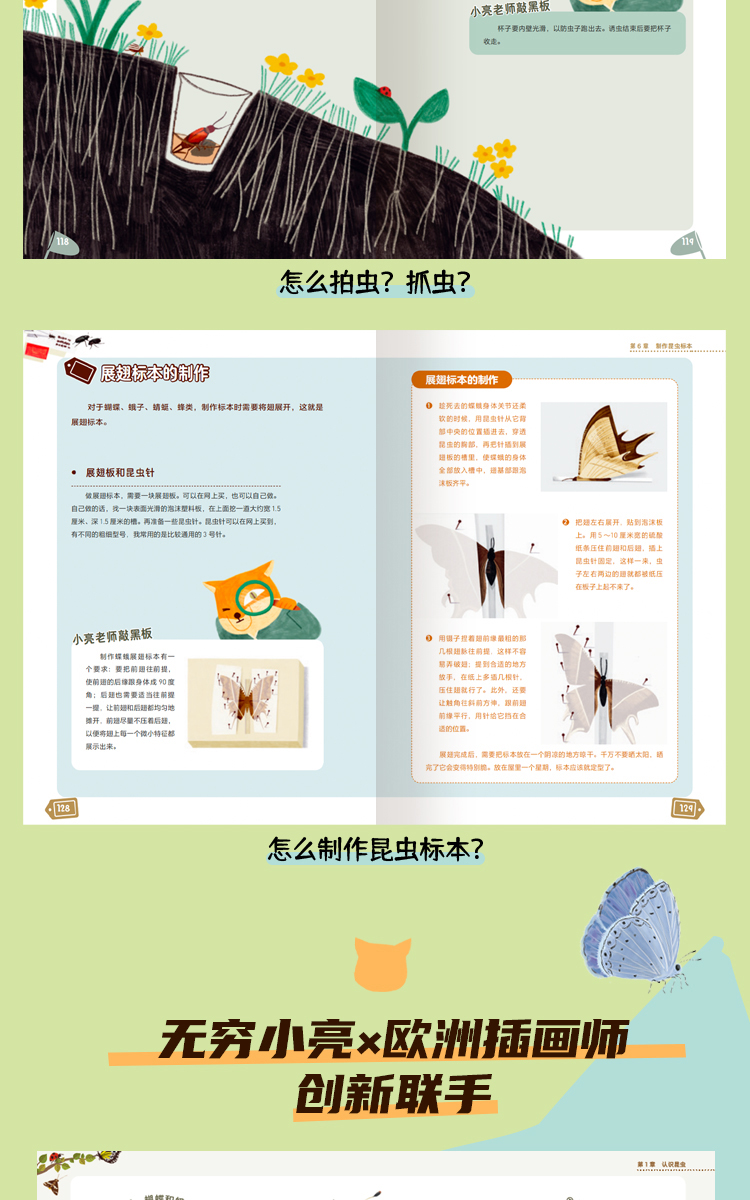 此外,小亮老师倾心传授多年“玩虫心法”,分享了大量实用的户外探索技巧,从寻找昆虫到拍摄昆虫、做昆虫标本……深入浅出的讲述、独特的亮式幽默以及穿插其中的科研花絮,让你一窥昆虫学者的科研日常,带领读者从“小小”的昆虫看到未来“大大”的可能性。