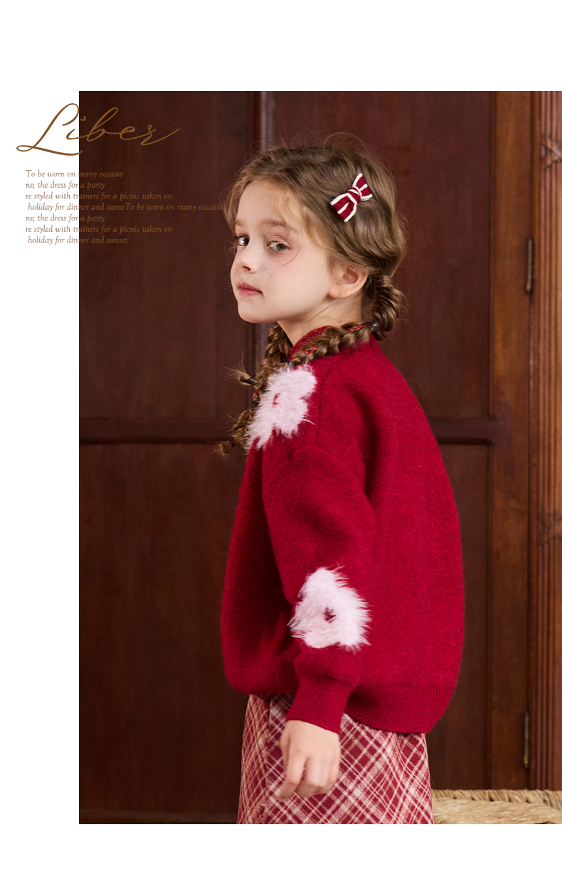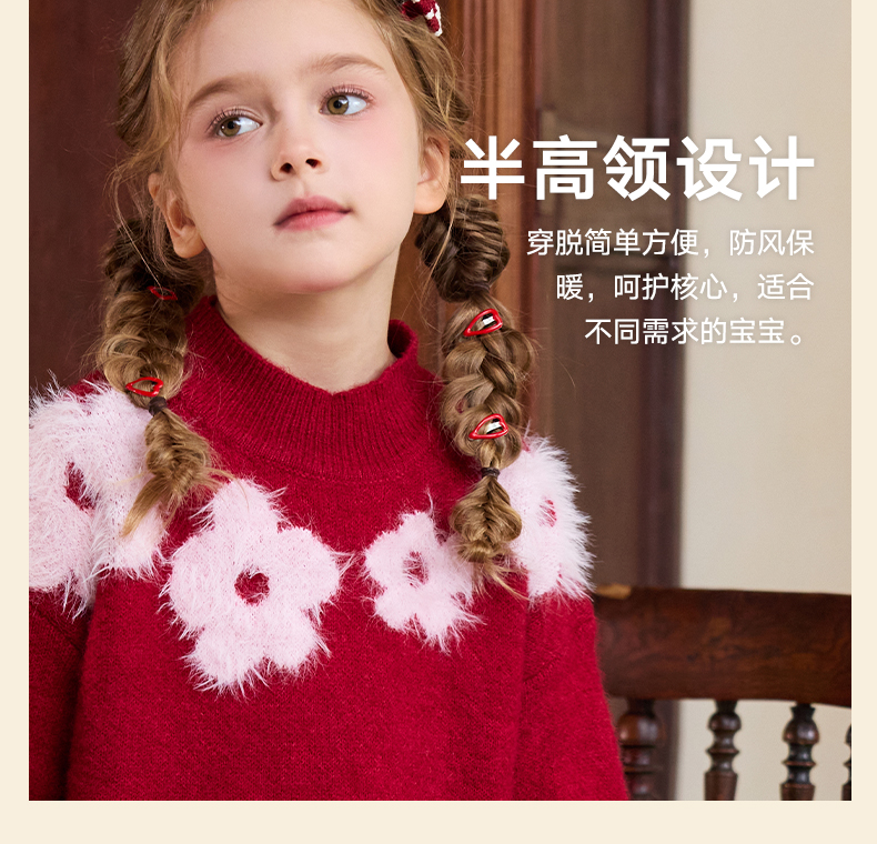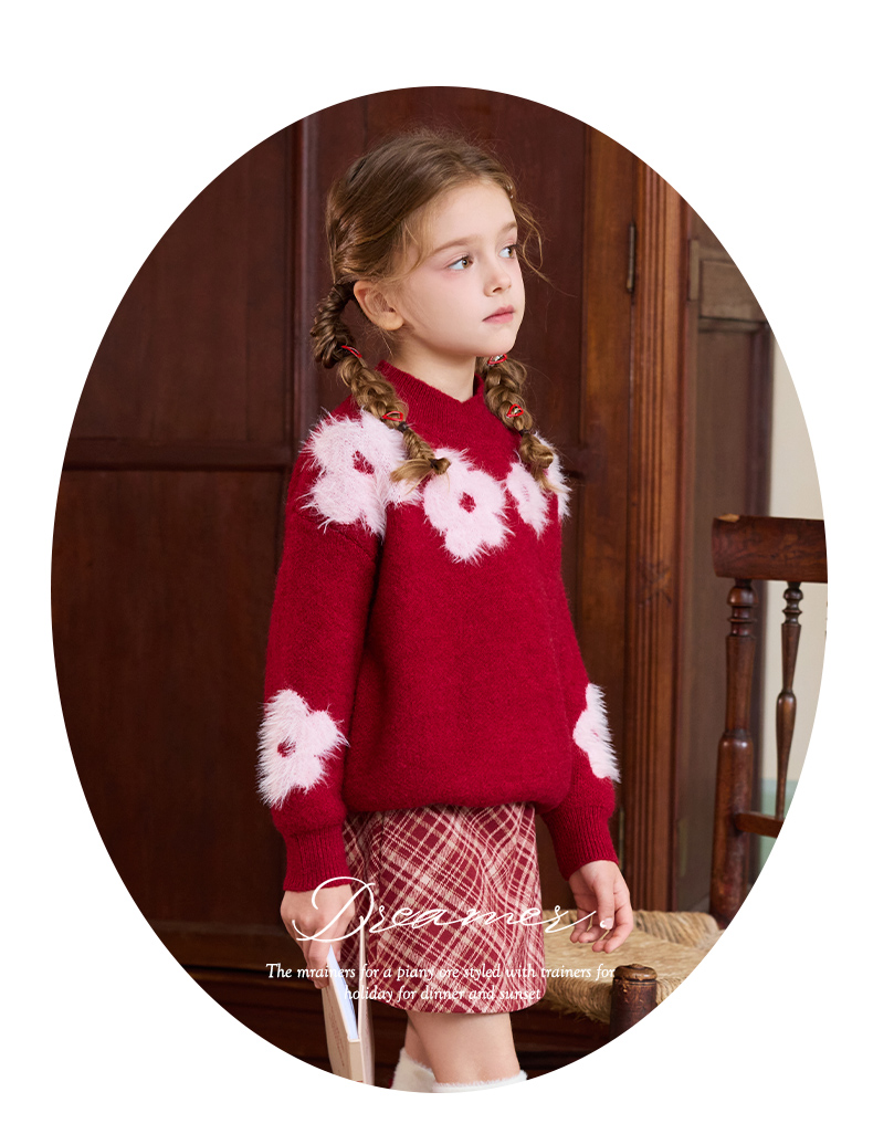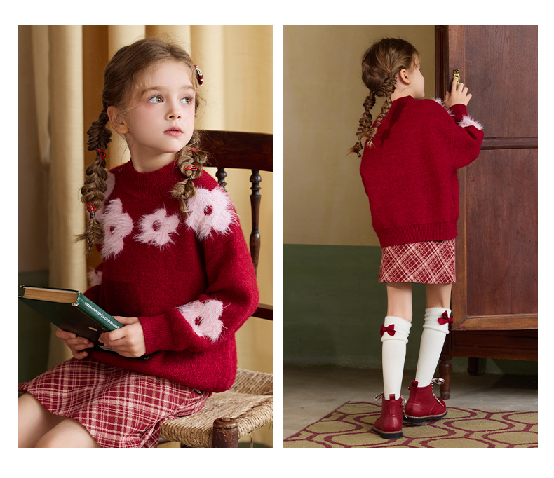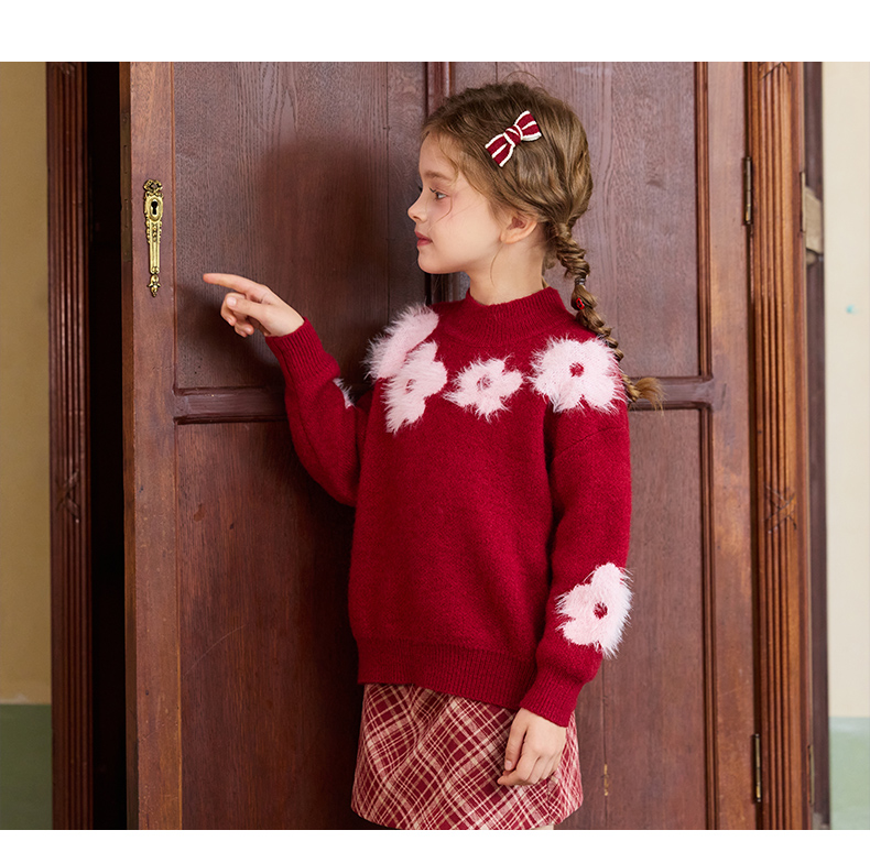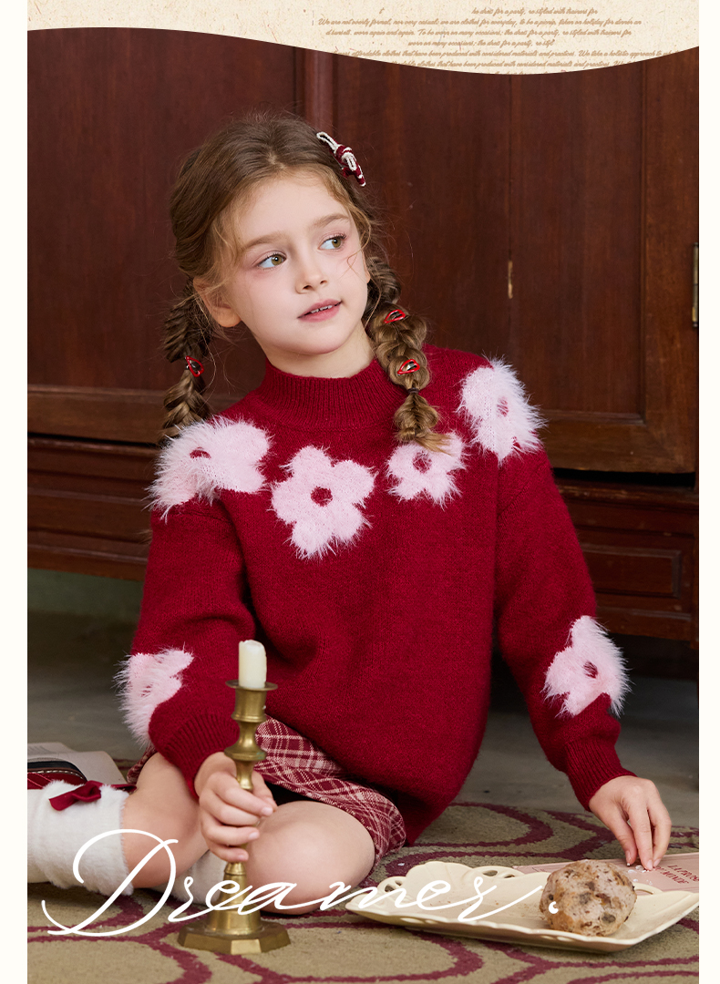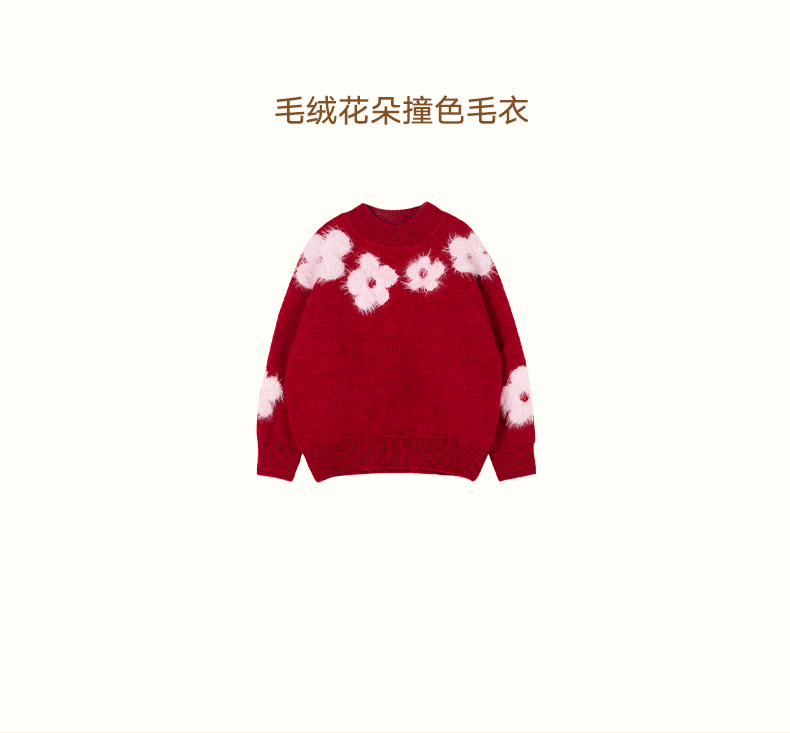 LittleNaive儿童圣诞红色毛衣冬新款毛绒花朵线衣女童新年针织衫