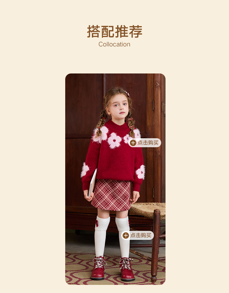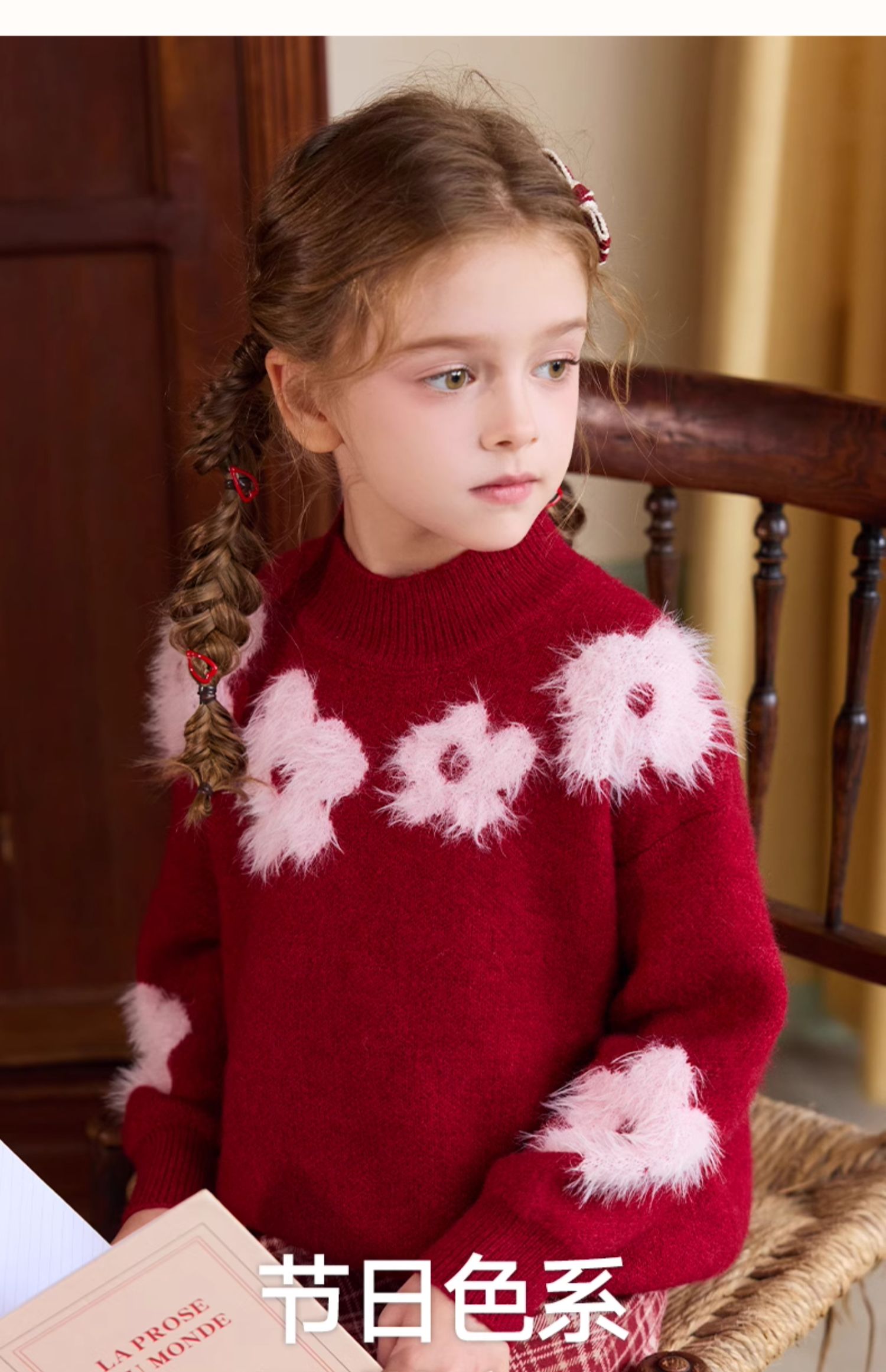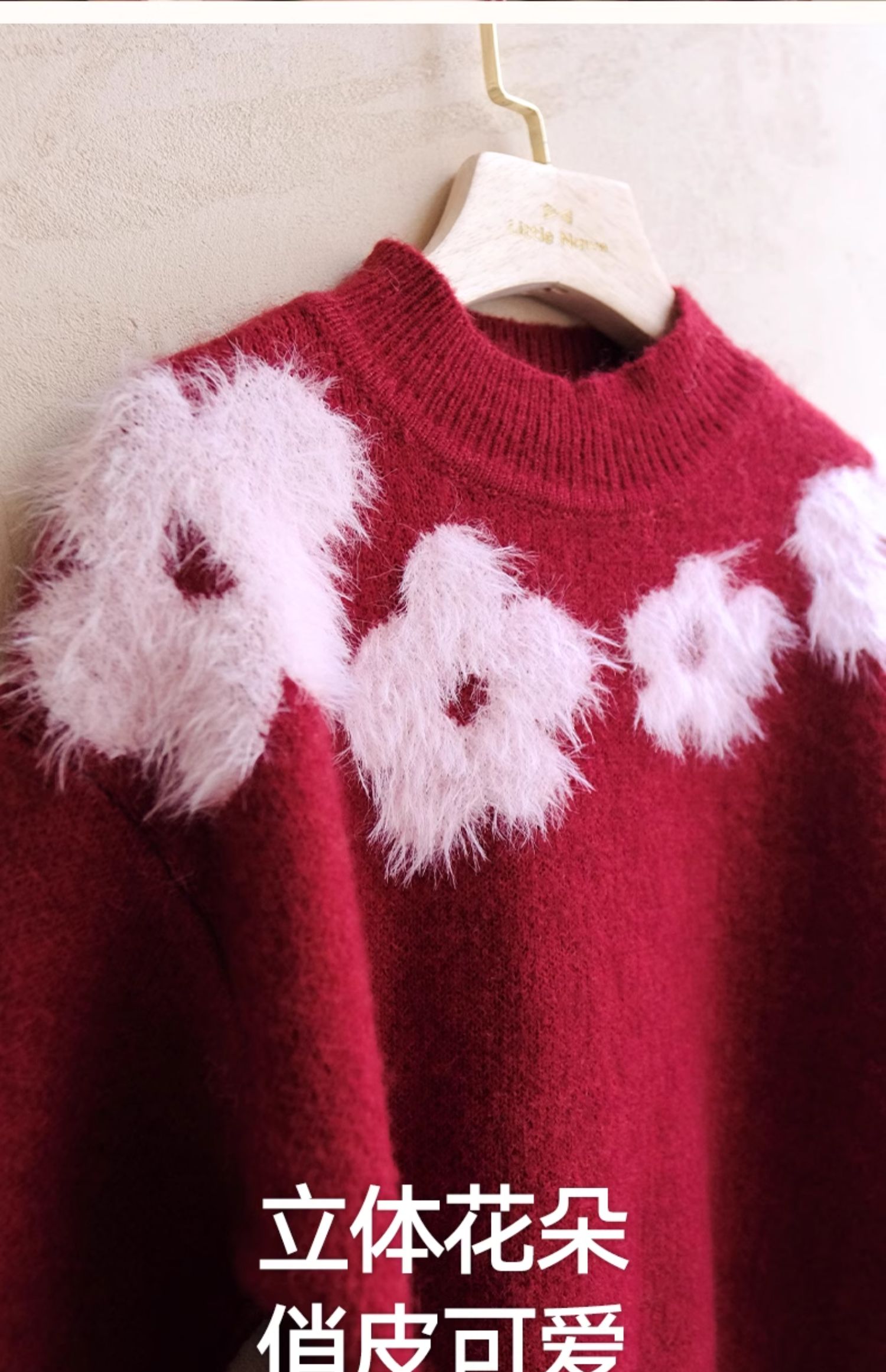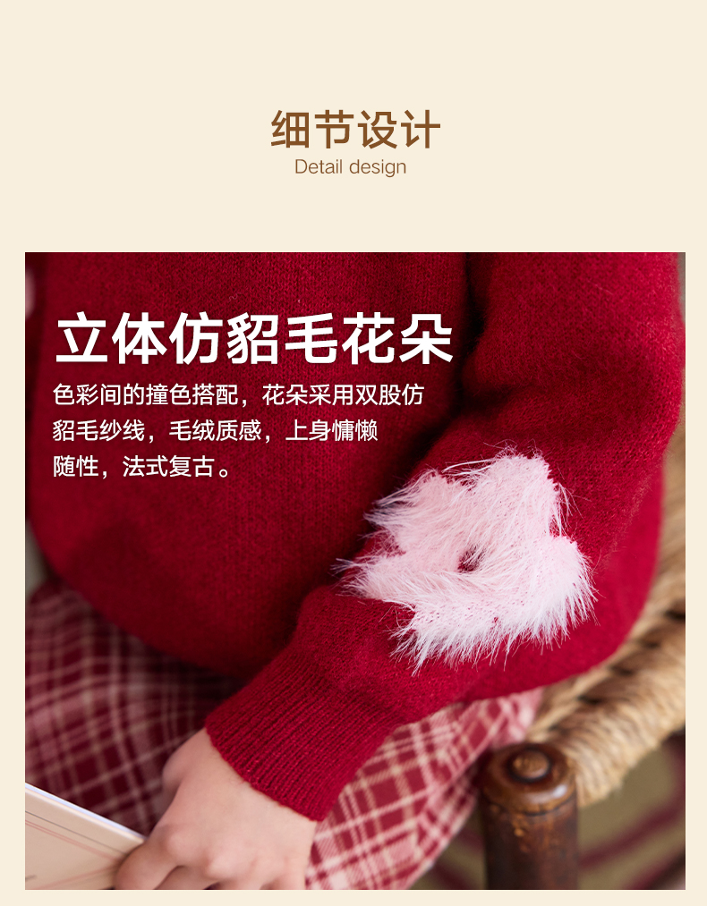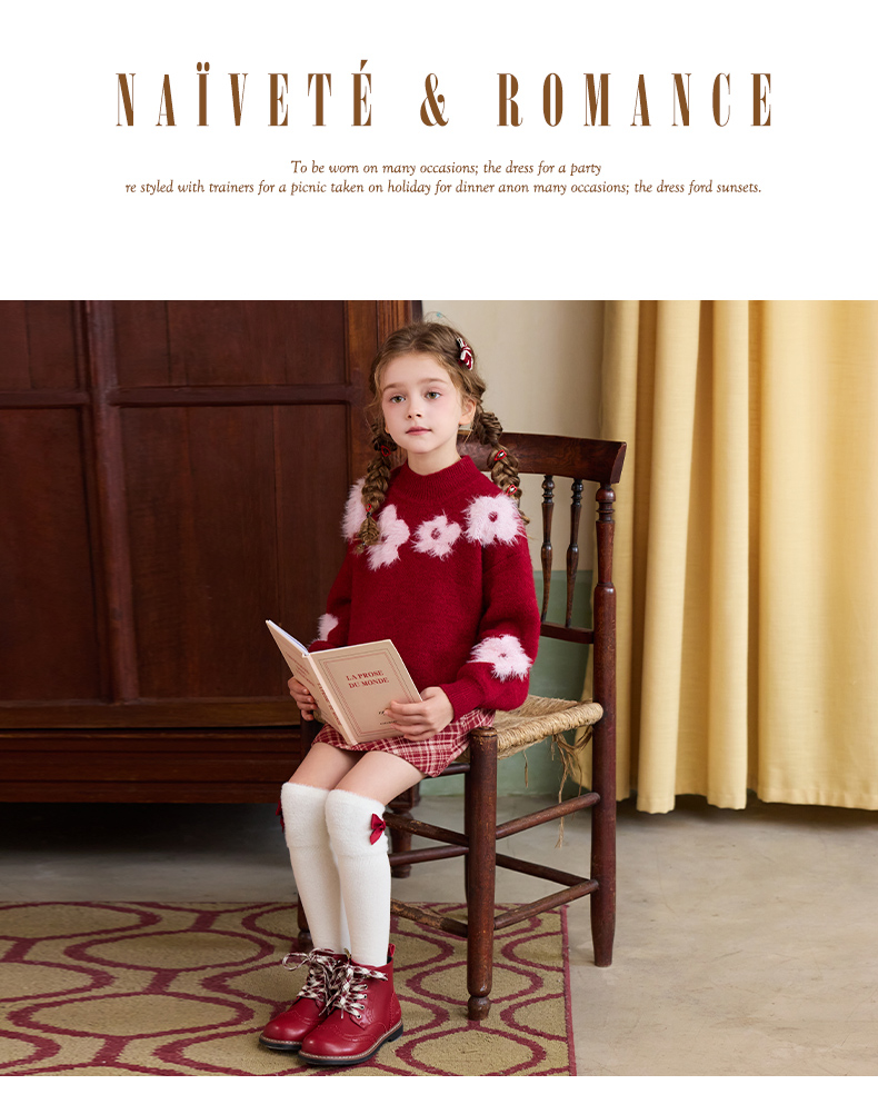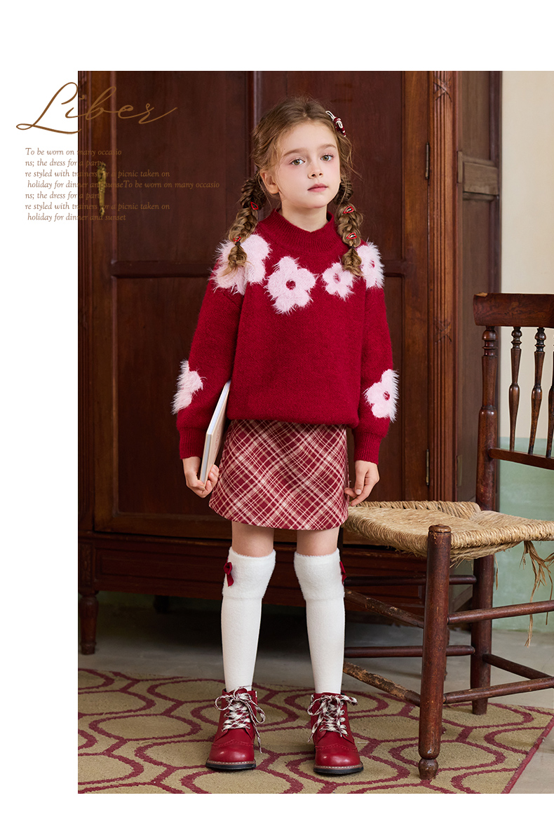 LittleNaive儿童圣诞红色毛衣冬新款毛绒花朵线衣女童新年针织衫