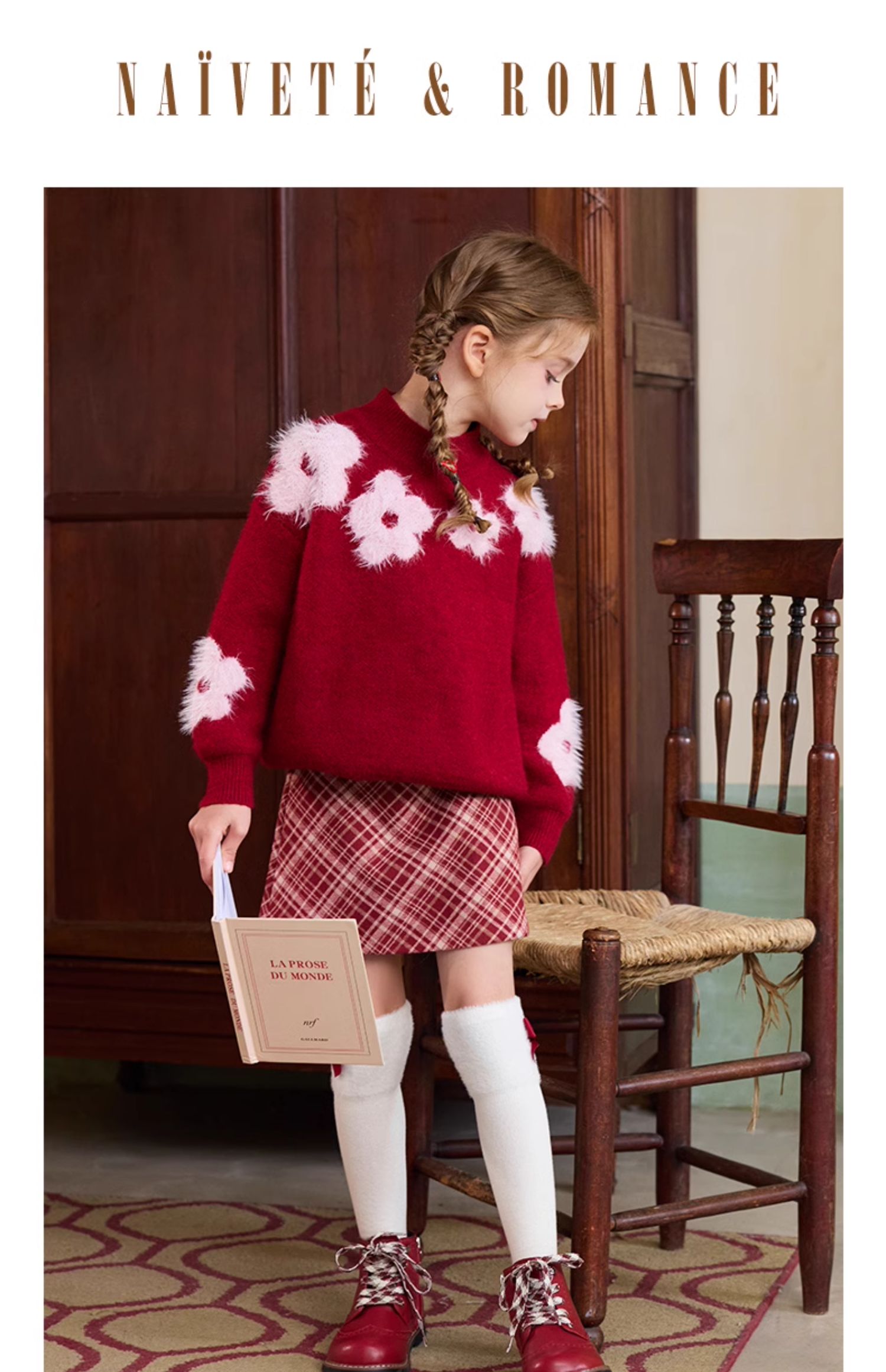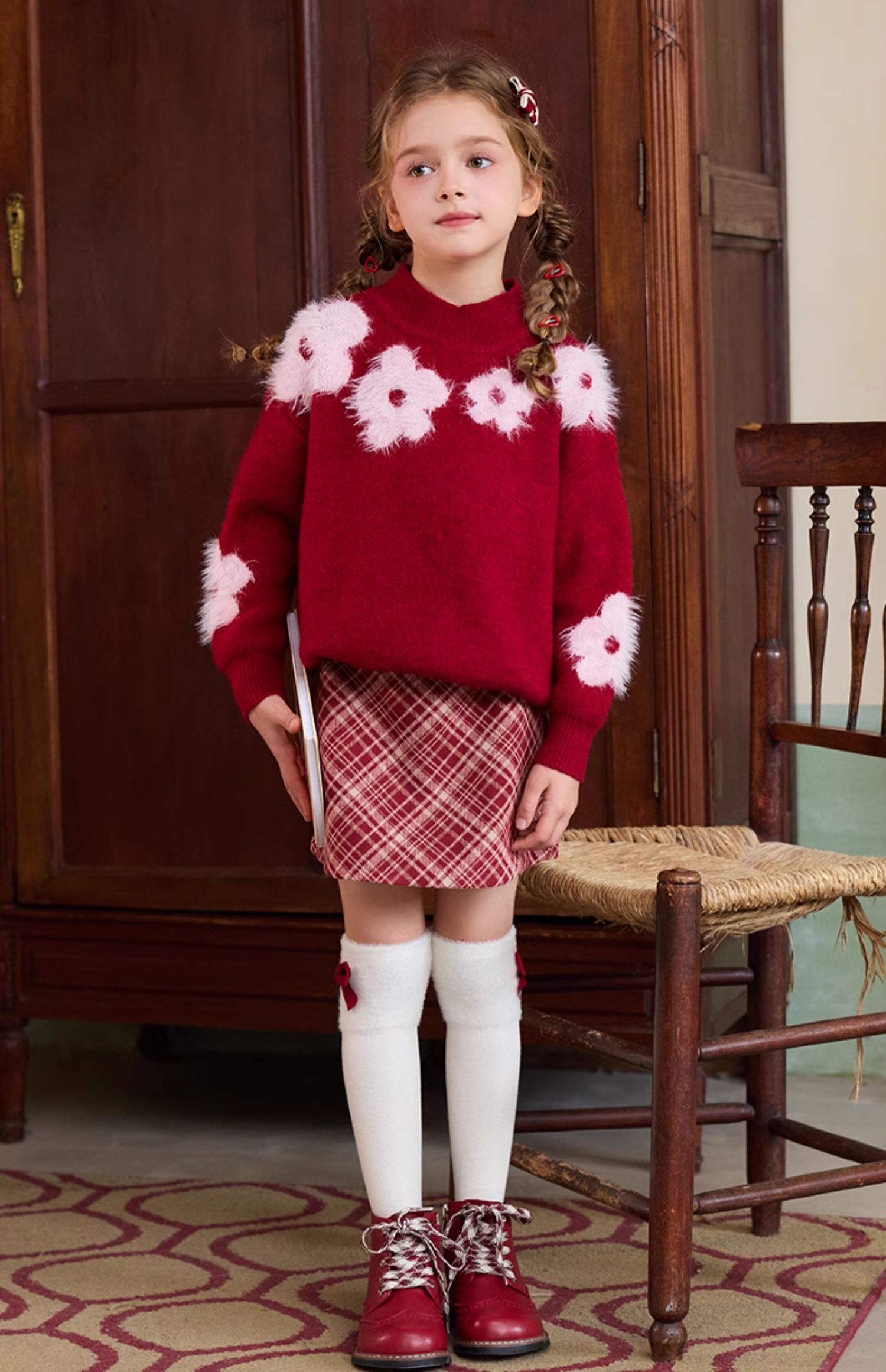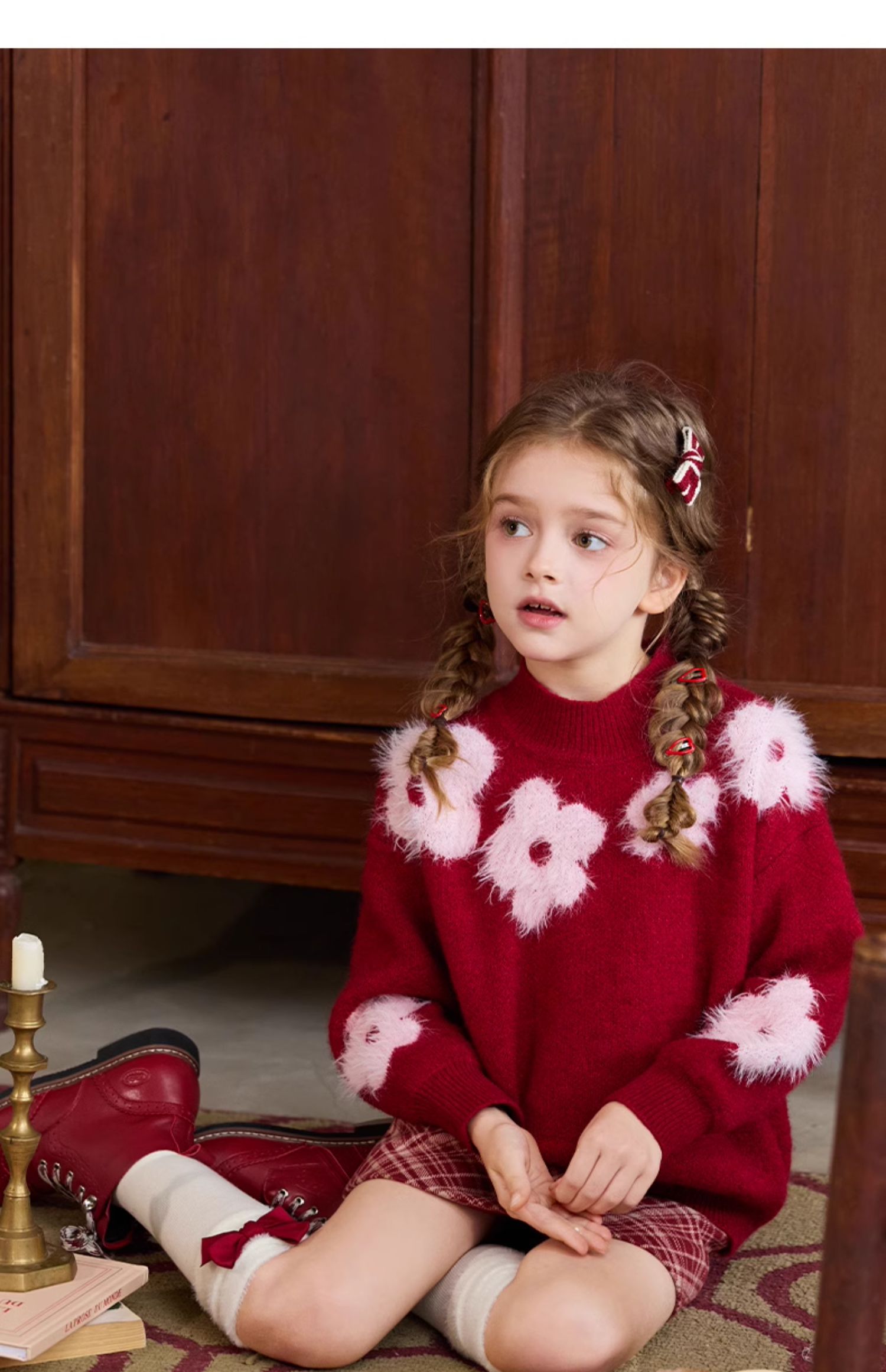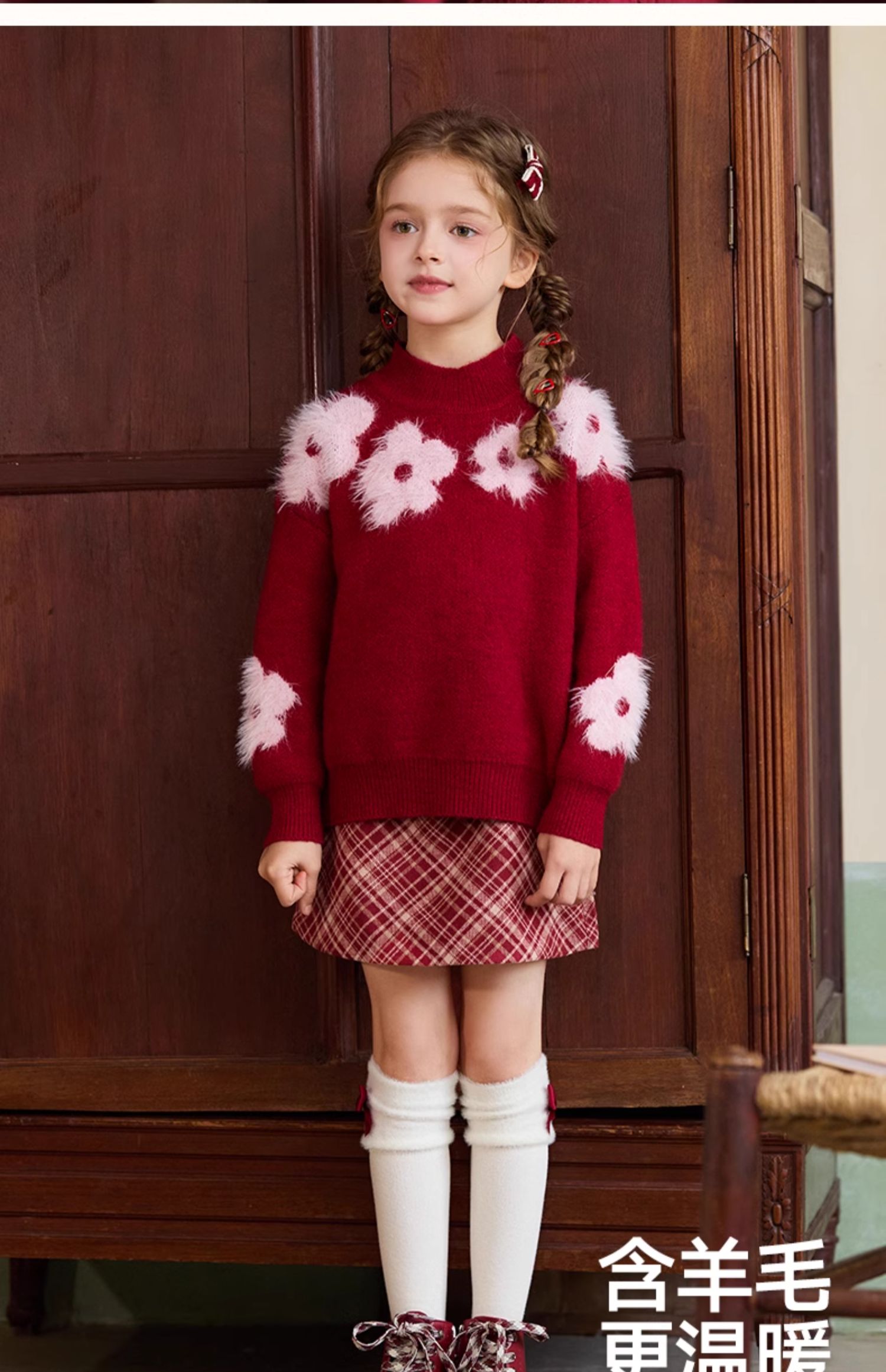LittleNaive儿童圣诞红色毛衣冬新款毛绒花朵线衣女童新年针织衫