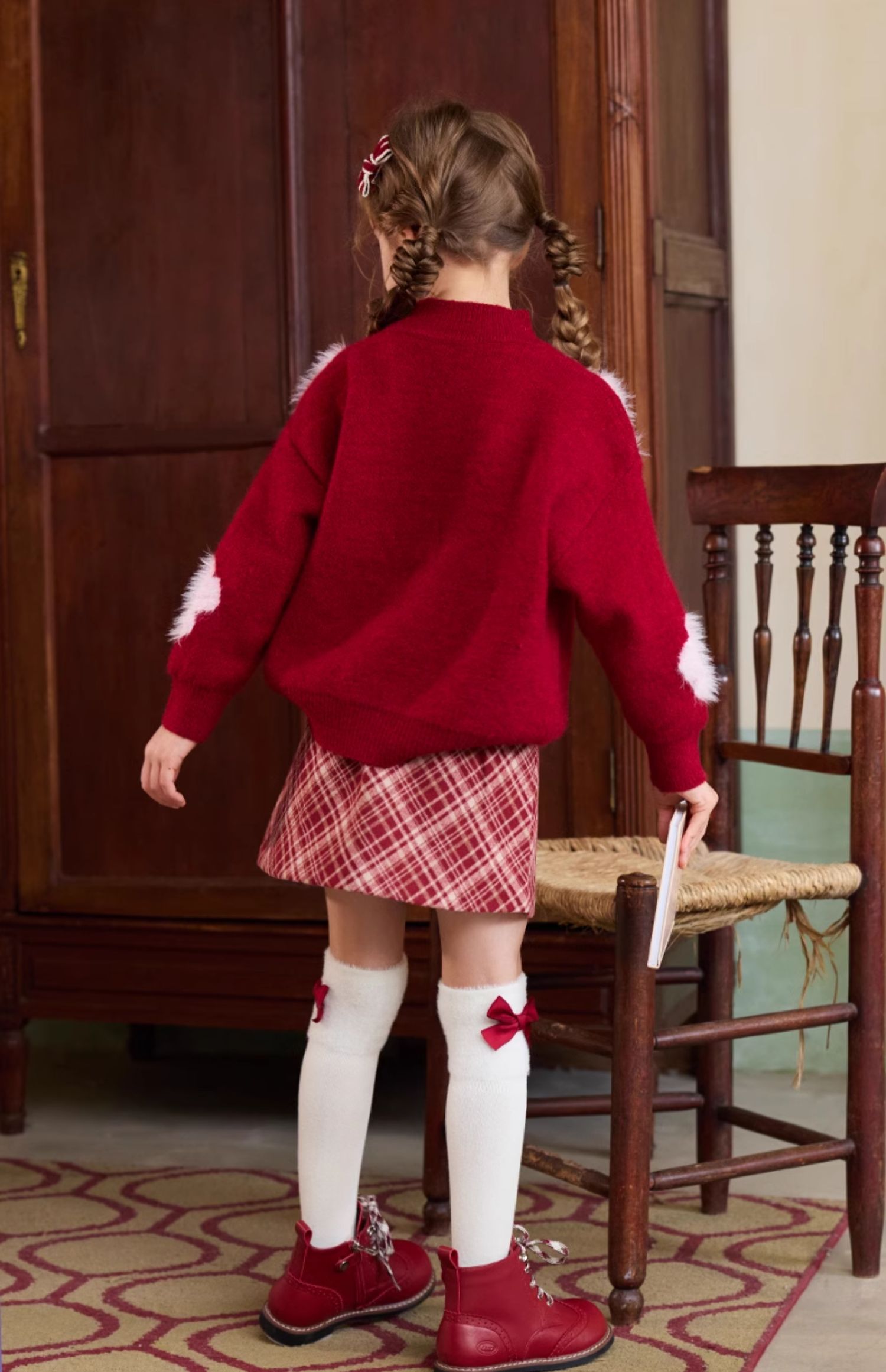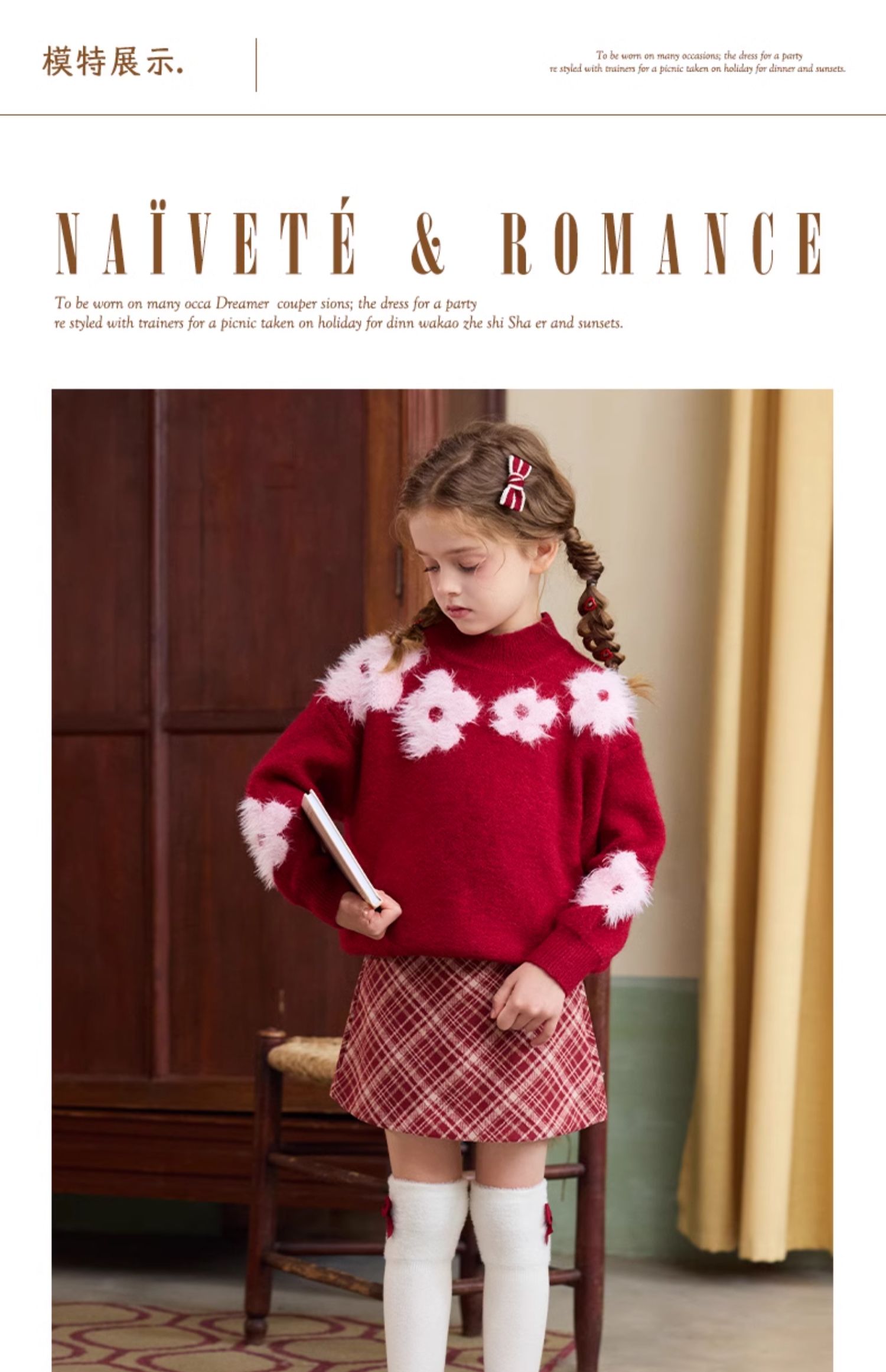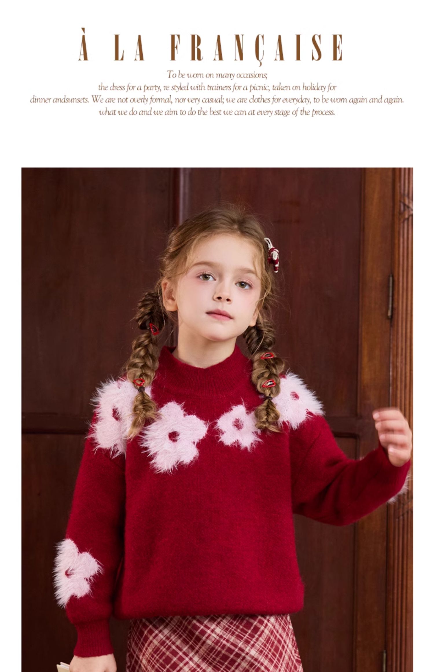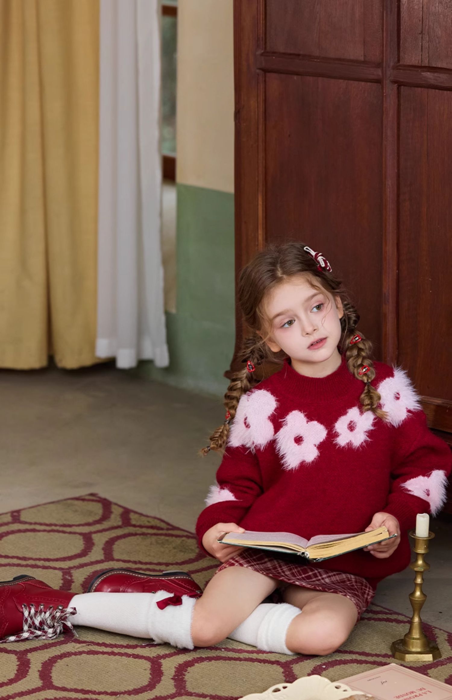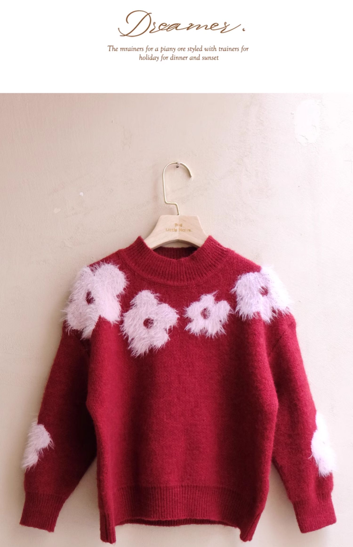 LittleNaive儿童圣诞红色毛衣冬新款毛绒花朵线衣女童新年针织衫