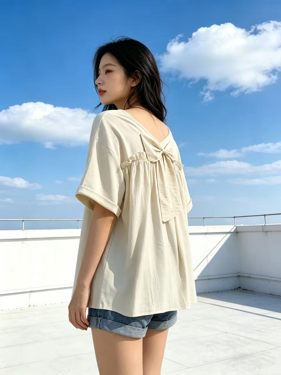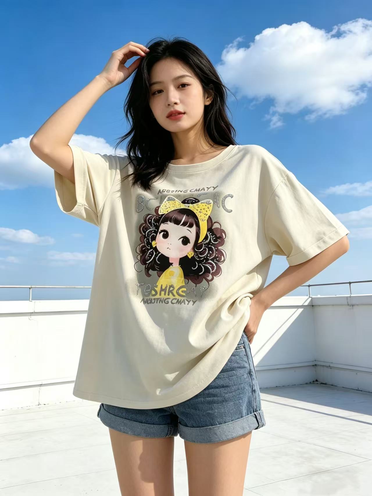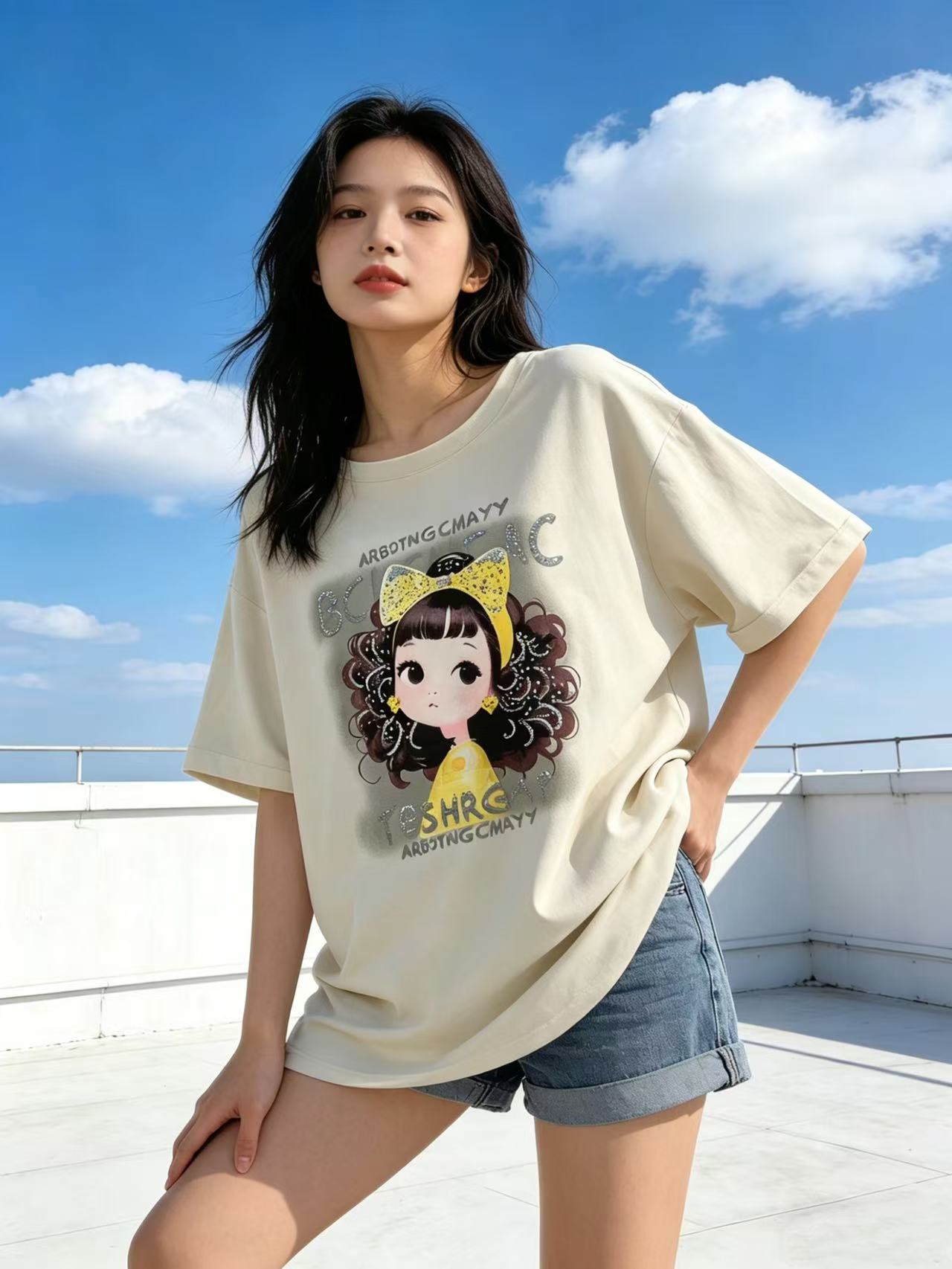 大版【自营】工艺/重工!亮片字母➕可爱女孩印花!后背网纱蝴蝶结宽松设计感中长短袖T恤-喜出
