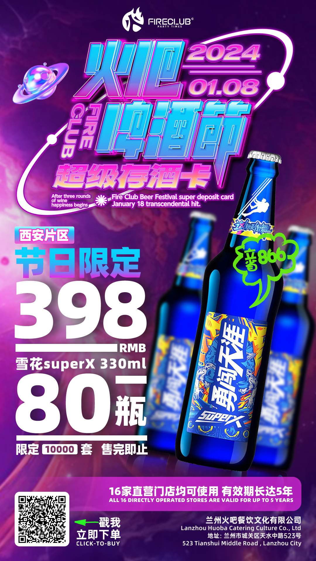 【西安通用】1月8日火吧啤酒节—超值存酒卡—398元80瓶雪花SuperX330ml