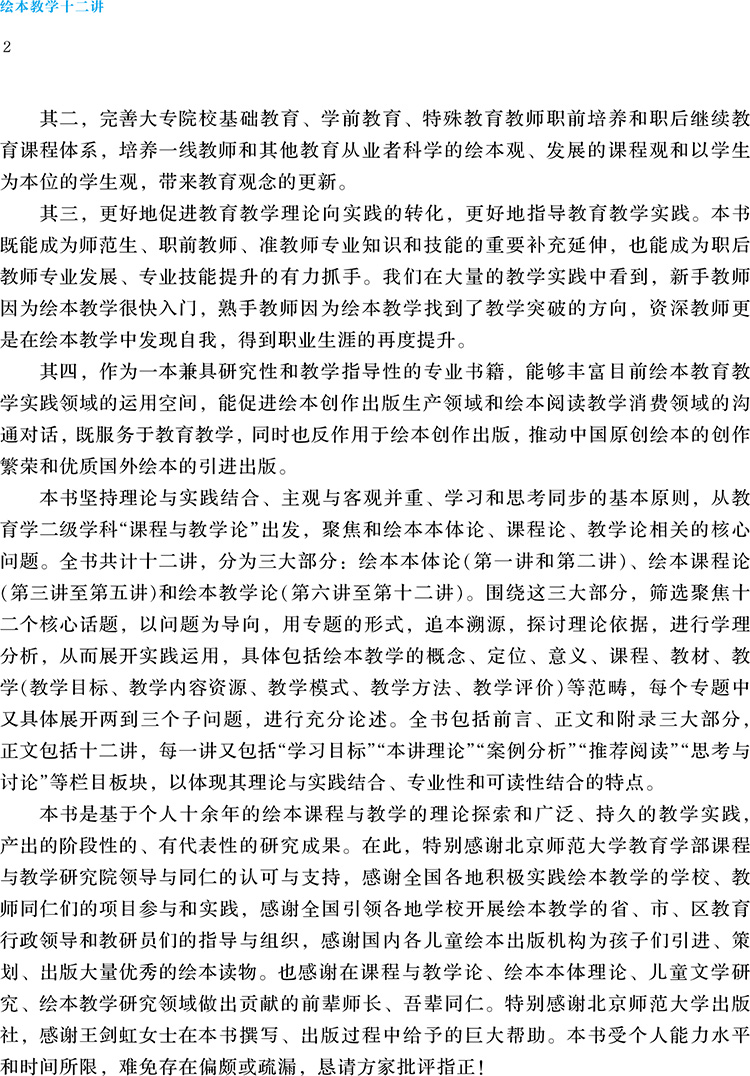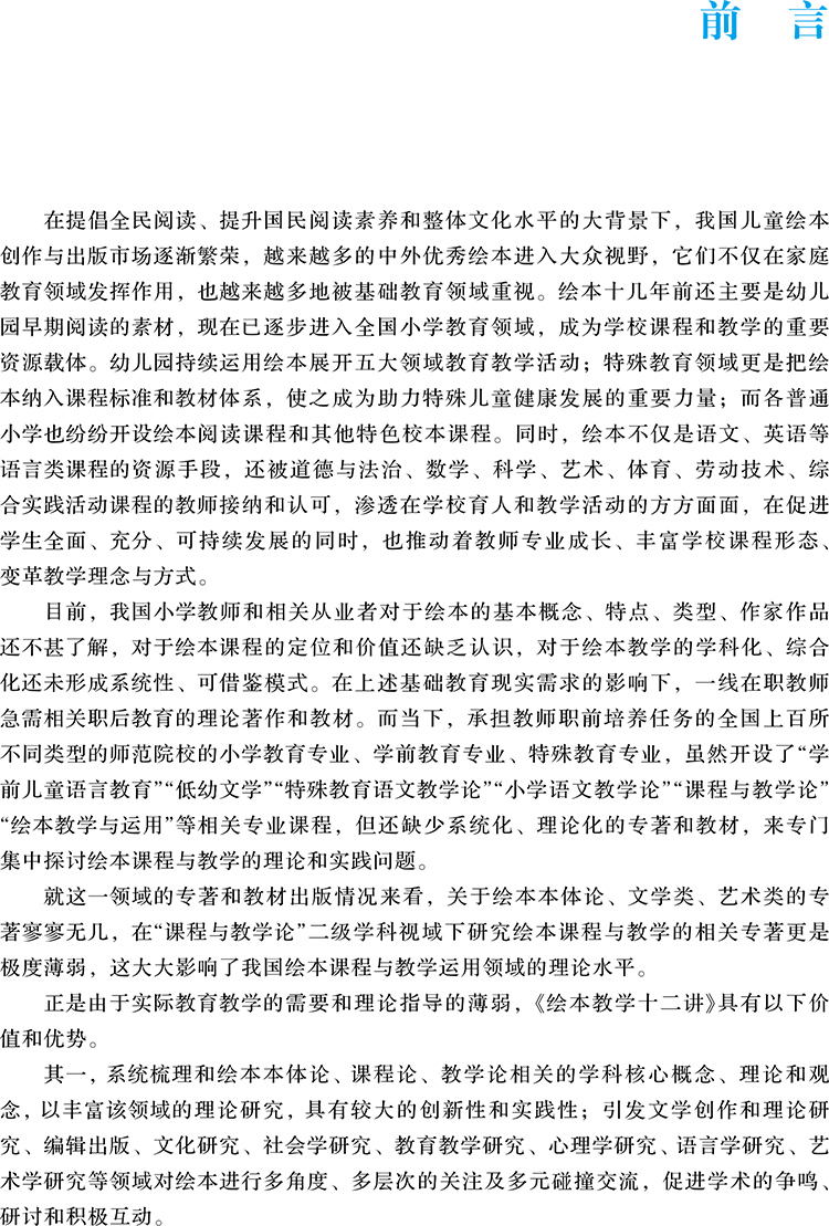在全民阅读、提升国民阅读素养和整体文化水平提升的大背景下,目前我国儿童绘本创作与出版市场非常繁荣,越来越多中外优秀绘本进入大众视野,它们不仅仅在家庭教育领域发挥作用,也越来越被基础教育领域重视。基于此,作者带领自己的团队编著此书。本书坚持理论与实践结合,主观与客观并重,学习和思考同步的基本原则,聚焦和绘本本体论、课程论、教学论相关的核心问题,分三大部分:绘本本体论篇、绘本课程论篇和绘本教学论篇。围绕这三大部分,分解出20个从实践层面产生的具体问题,以问题为导向,追本溯源,探讨理论依据,进行学理分析和实践运用。就当前这一领域的图书市场来看,相关对于绘本本体论、文学类、艺术类的专著就已寥寥无几,和课程教学论相关的专著更是极度匮乏,大大影响了我国绘本课程与教学运用领域的理论水平。基于此,本书的出版能大大填补理论、实践和市场的空白。