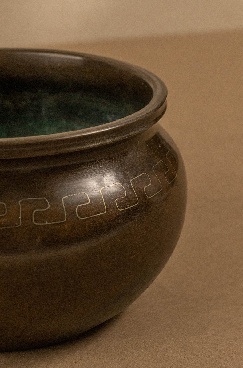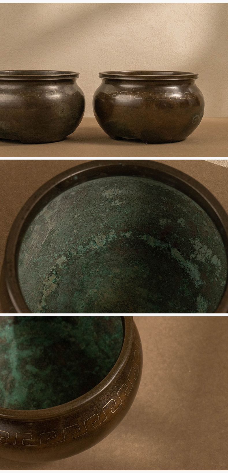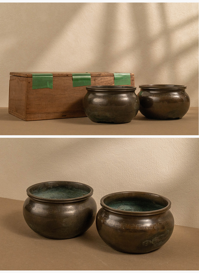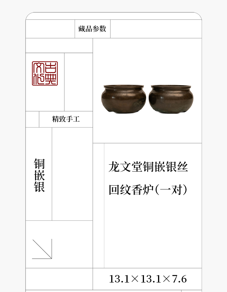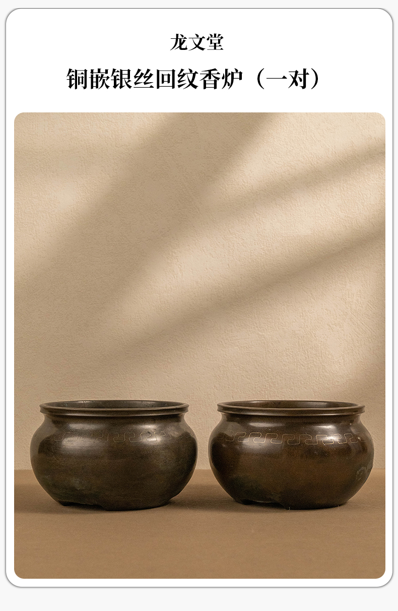 龙文堂铜嵌银丝回纹香炉(一对)