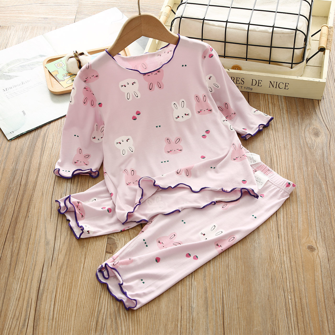 【可爱兔子印花,宝贝们的喜爱!】女童新款夏季睡衣套装 卡通可爱兔子女宝宝家居服两件套 中大童潮流-QQ