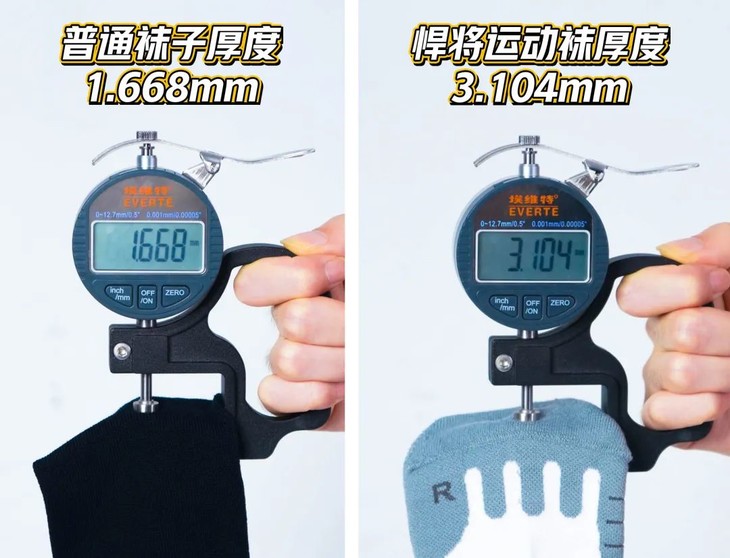尤其是在相对薄弱的脚尖处,悍将运动袜比普通袜子厚了约一倍,防护更到位。