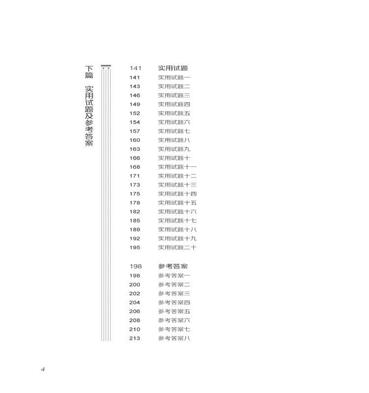 各章后均附有对应的习题,让学生有针对性的练习重点、难点知识,并通过习题掌握各章的重要内容,使学生的理论知识和应用能力得以提高。下篇的实用试题部分是按照乐理课程的考试形式和要求编写的,共20套,其题量大、题型丰富、内容全面、针对性强。每套试题都附有详细的参考答案,是检验学生对内容掌握程度的好方法。通过这些试题,学生可查漏补缺,进一步强化巩固乐理知识,提高音乐素养,牢固掌握音乐基础理论。