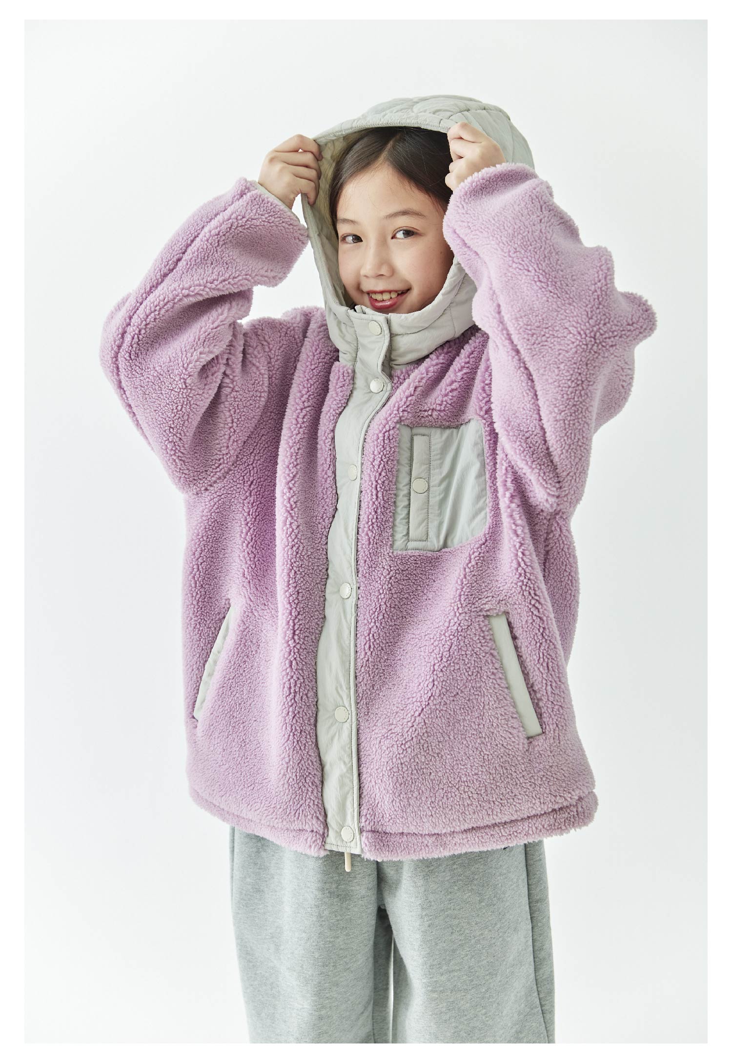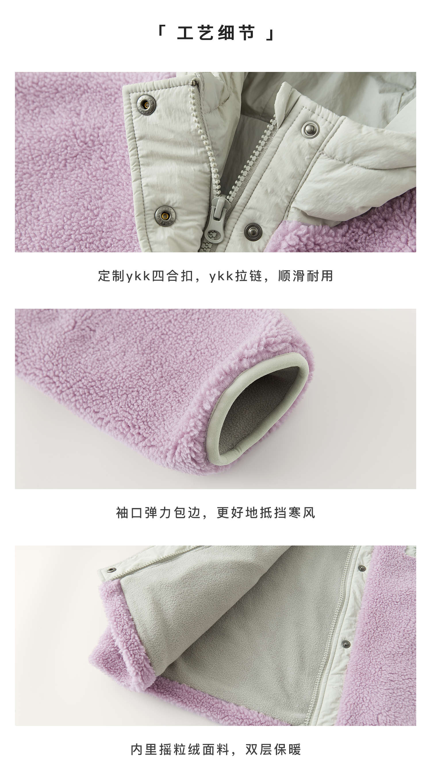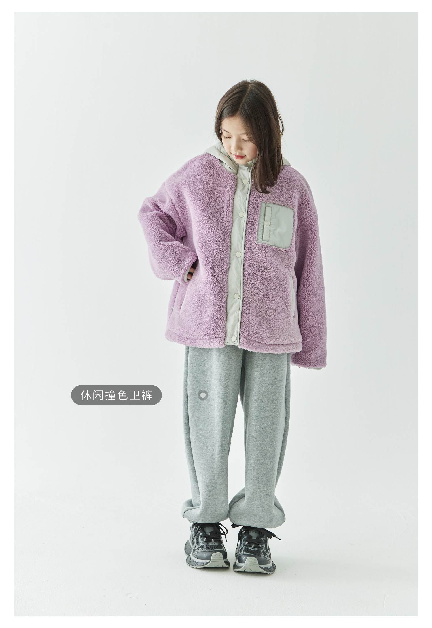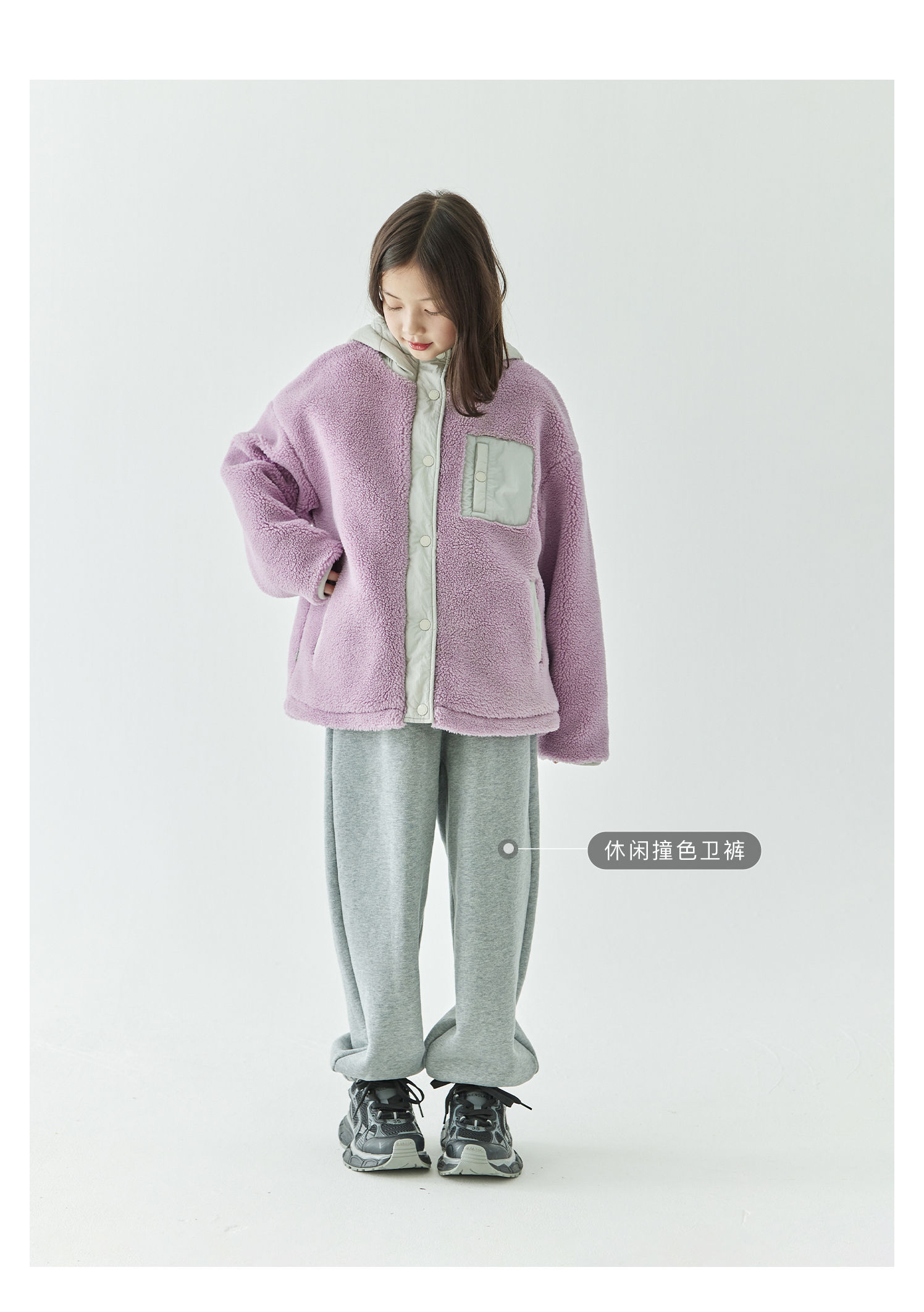 棵初24年冬季新款儿童仿羊羔毛外套亲子撞色拼接保暖宽松连帽上衣
