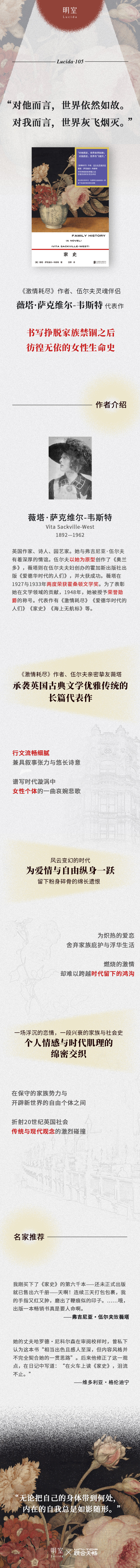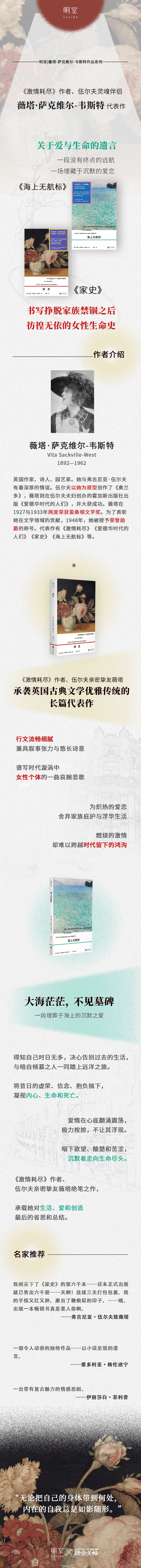作者薇塔·萨克维尔-韦斯特是20世纪英国文坛的传奇人物,不仅因其畅销小说家的身份广受赞誉,更因她与伍尔夫的深厚友谊而成为文学史上的焦点。两人的关系深刻影响了彼此的创作——伍尔夫的名作《奥兰多》便以薇塔为原型,而薇塔的《家史》同样展现出她对性别、社会与历史的敏锐洞察。作为一位在男性主导的文学界脱颖而出的女作家,薇塔的独立精神与文学成就至今仍极具话题性。