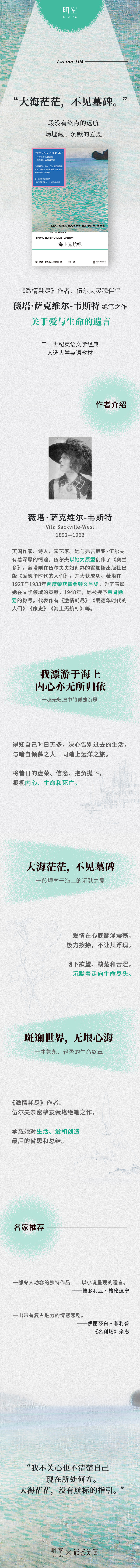 本书作者薇塔·萨克维尔-韦斯特是英国著名作家、诗人,一生作品丰硕,曾被授予皇家荣誉勋爵称号,是伍尔夫小说《奥兰多》的原型。《海上无航标》是薇塔生前创作的zui后一部小说,长篇小说集大成之作,地位经典。本书也是薇塔关于爱与生命的告白,富有自传色彩的总结之作,承载其对生活、情感和创作的审视和沉思。本书节选被收入大学《高级英语》教材,广为流传。