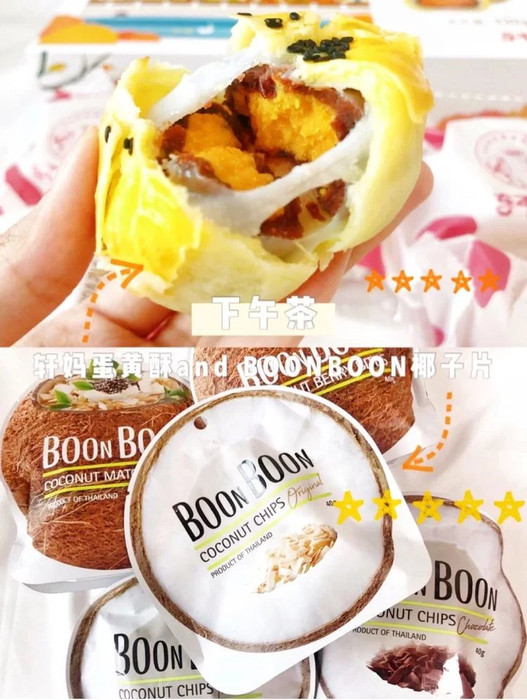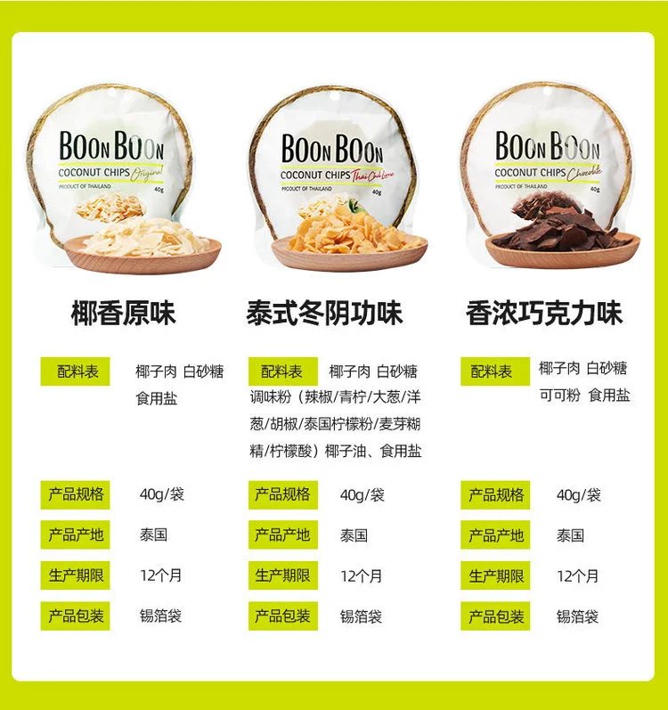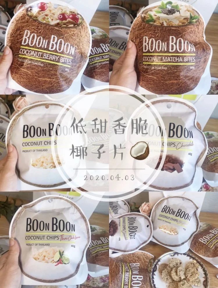椰子味儿的小零食,在我zui喜欢的食物味道中 绝对能排到前三名的❗️ 只要看到椰子味儿的小零食,我就忍不住要尝一尝 我zui近发现了一个超级好吃的椰子零食 ———就是泰国BOONBOON椰子片 原产国是泰国哟!味道还蛮多的 他们家的椰子片吃起来又脆又好吃 除了椰子香还有淡淡的奶香 慢火烘烤至浓香酥脆,唇齿留香,清爽美味