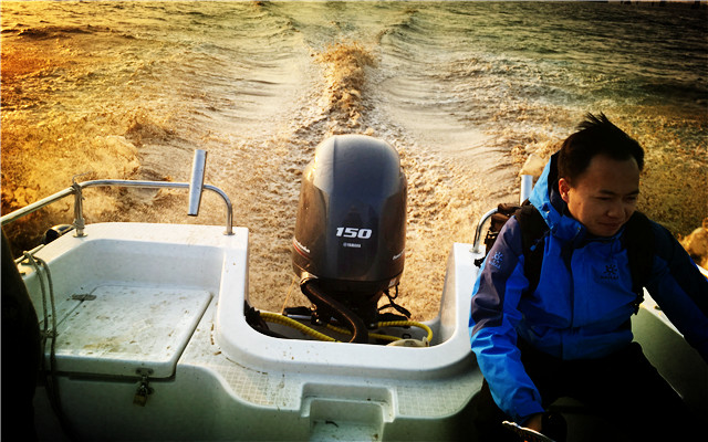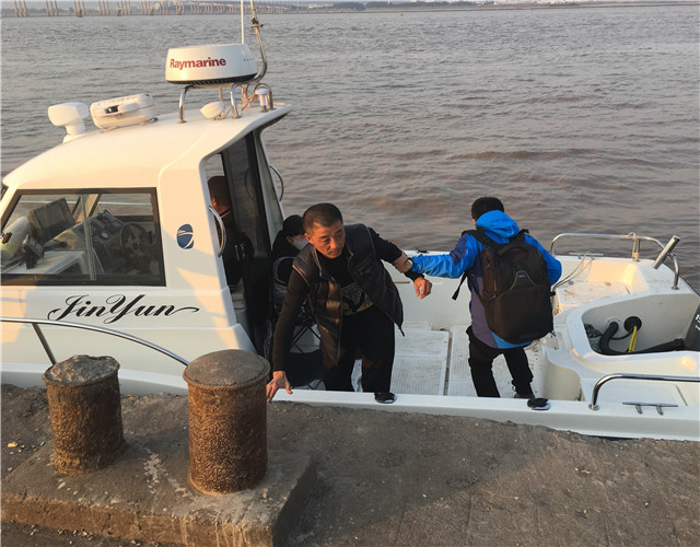 (上图)经过长途跋涉,栏目组在舟山岛屿码头登陆,上了一艘快艇后,迅速驶离。