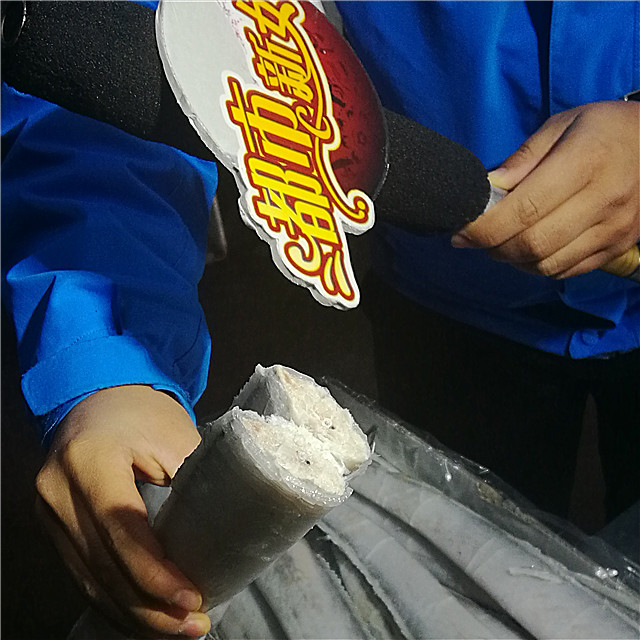 (上图)我们抽检了一箱,将一条带鱼折断,在横切面看到白嫩的肉质。