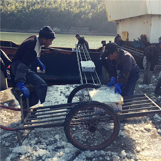 (上图)靠岸后的渔船,渔民没有时间休息,需要尽快将船舱里的冷冻带鱼卸上岸,这种简单自制的铁管滑车上,整筐的带鱼顺船而下,弧形优美、心情美好。