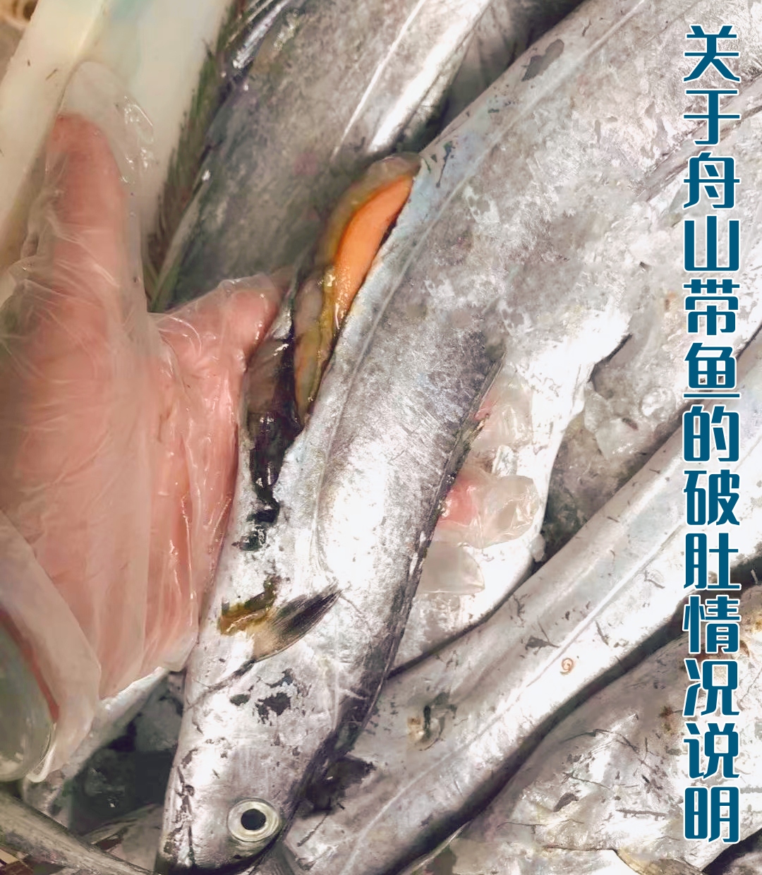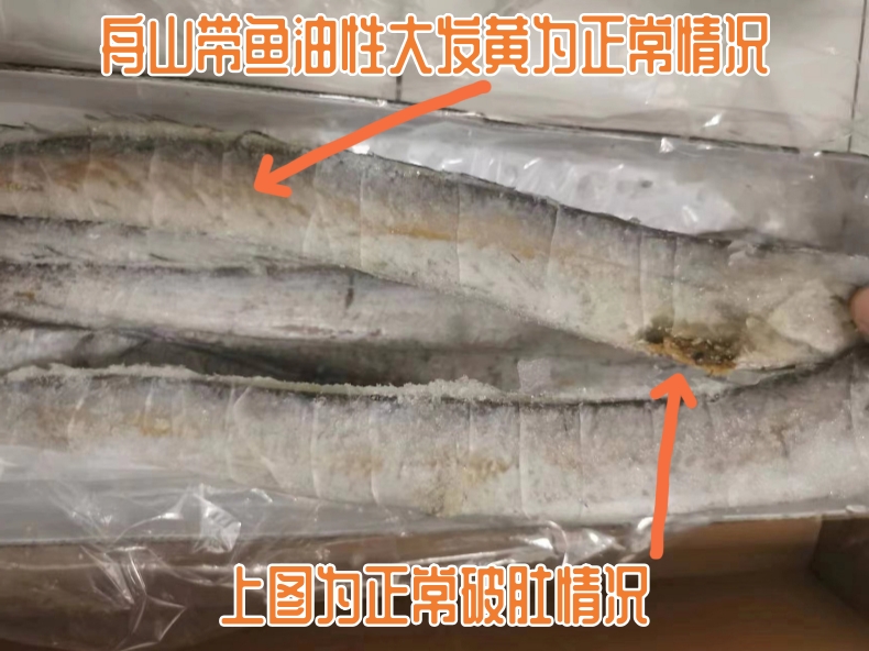 鱼身发黄和鱼头下方的破肚都是舟山带鱼进入12月-1月捕捞的正常现象。