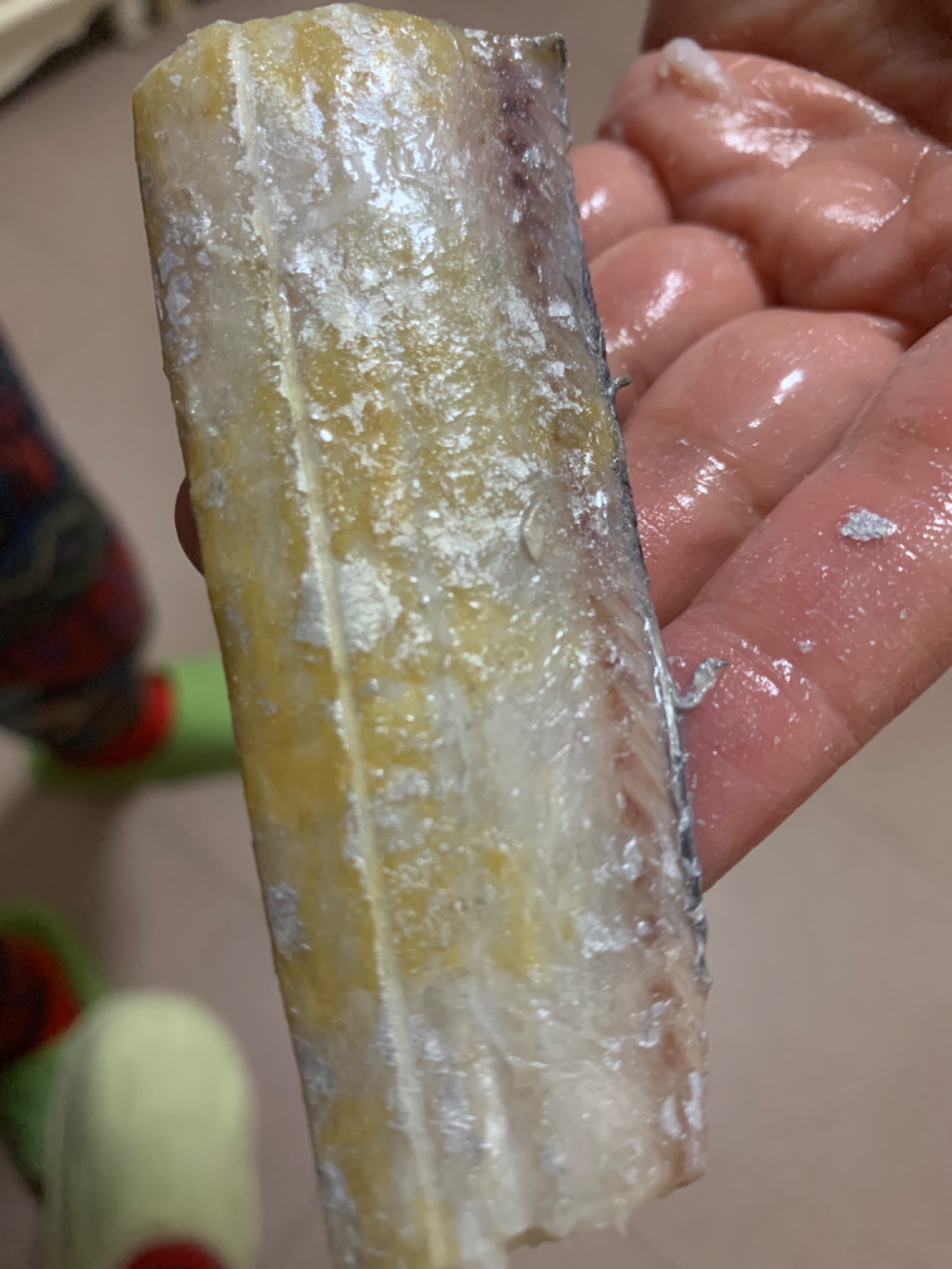 (上图)上图是咱们一名老观众在2023年12月12日收到的今年新鲜捕捞的冬捕带鱼,通过20项放射性监测,绝对才给大家发货的。冬带鱼的特征是油性大,鱼鳞已经挂不住了,鳞格不好不是不新鲜,而是油性增大带鱼到了最肥美的特征。