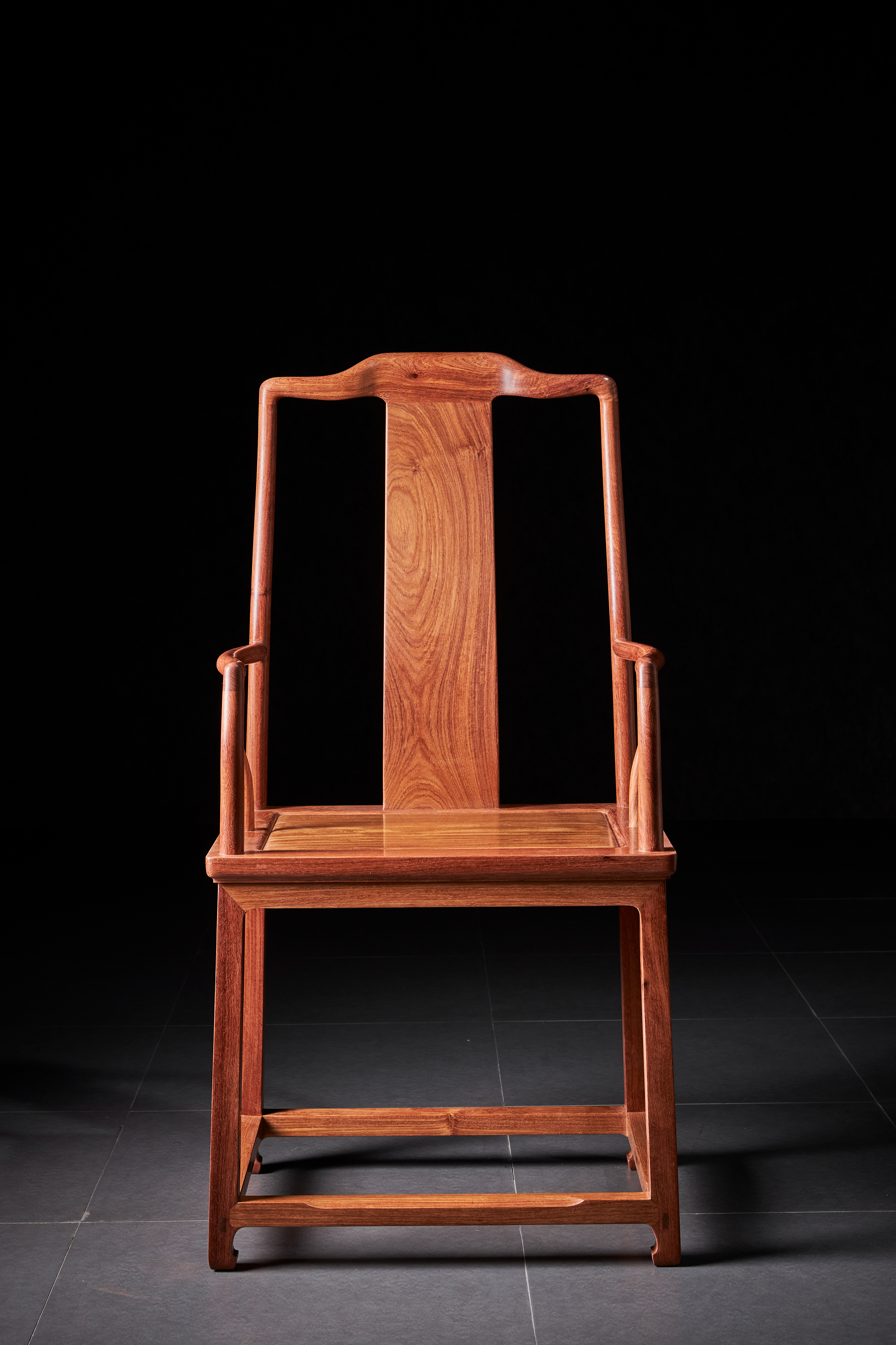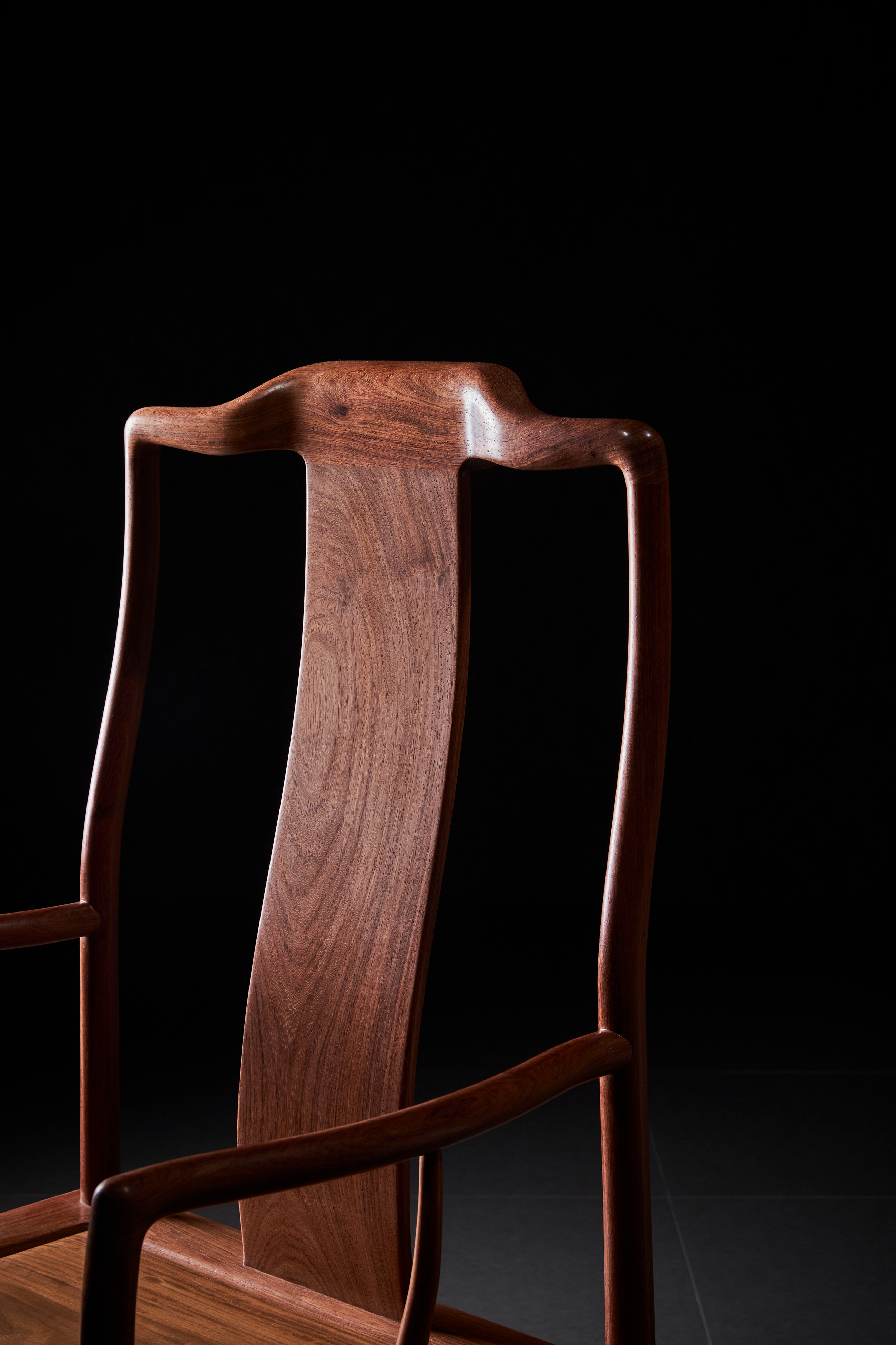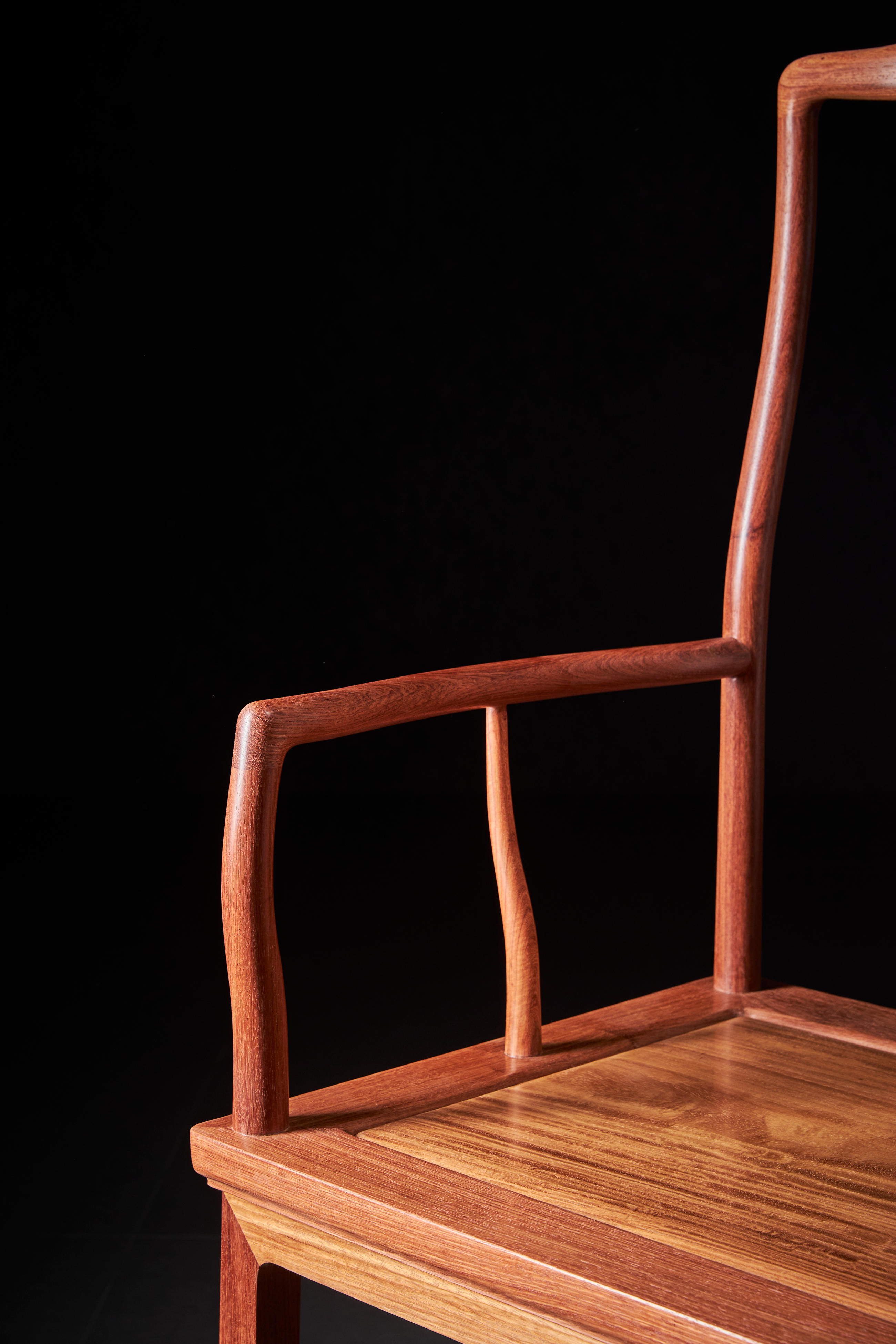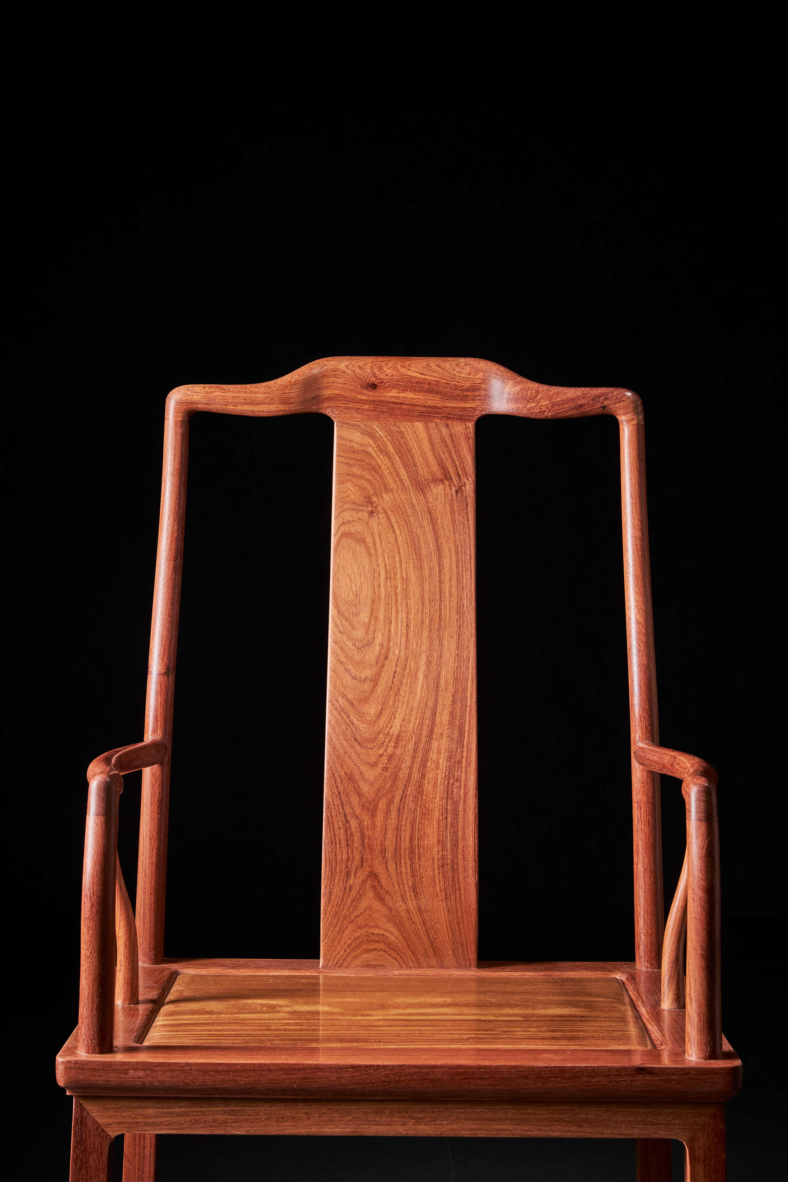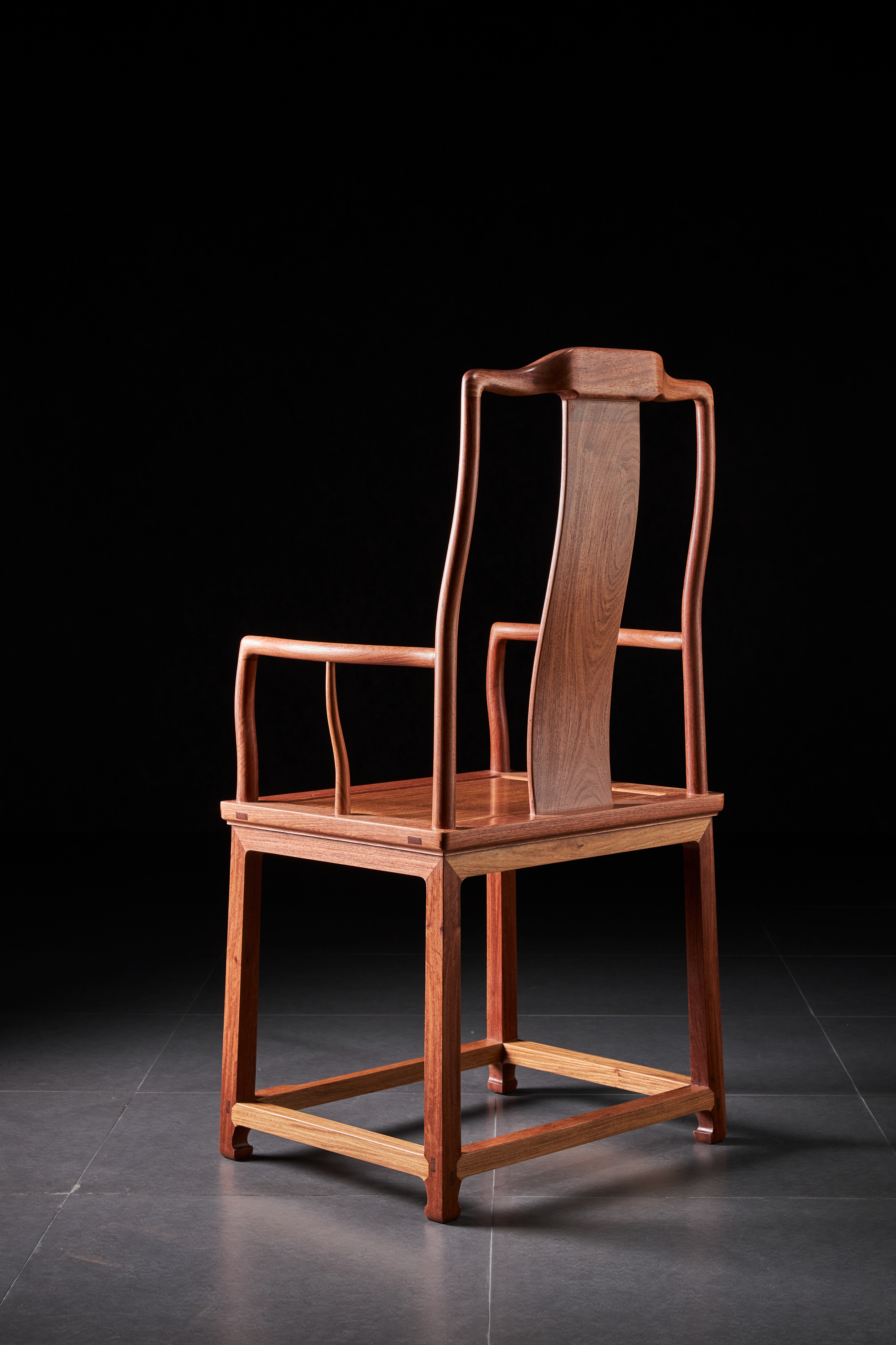 此椅原型出自香港洪建生旧藏的黄花梨高靠背南官帽椅,系安思远为洪氏把关的器物,收录于安氏编写的《洪氏所藏木器百图》上册。近例可参考香港攻玉山房叶承耀及前加州中国古典家具博物馆的旧藏。