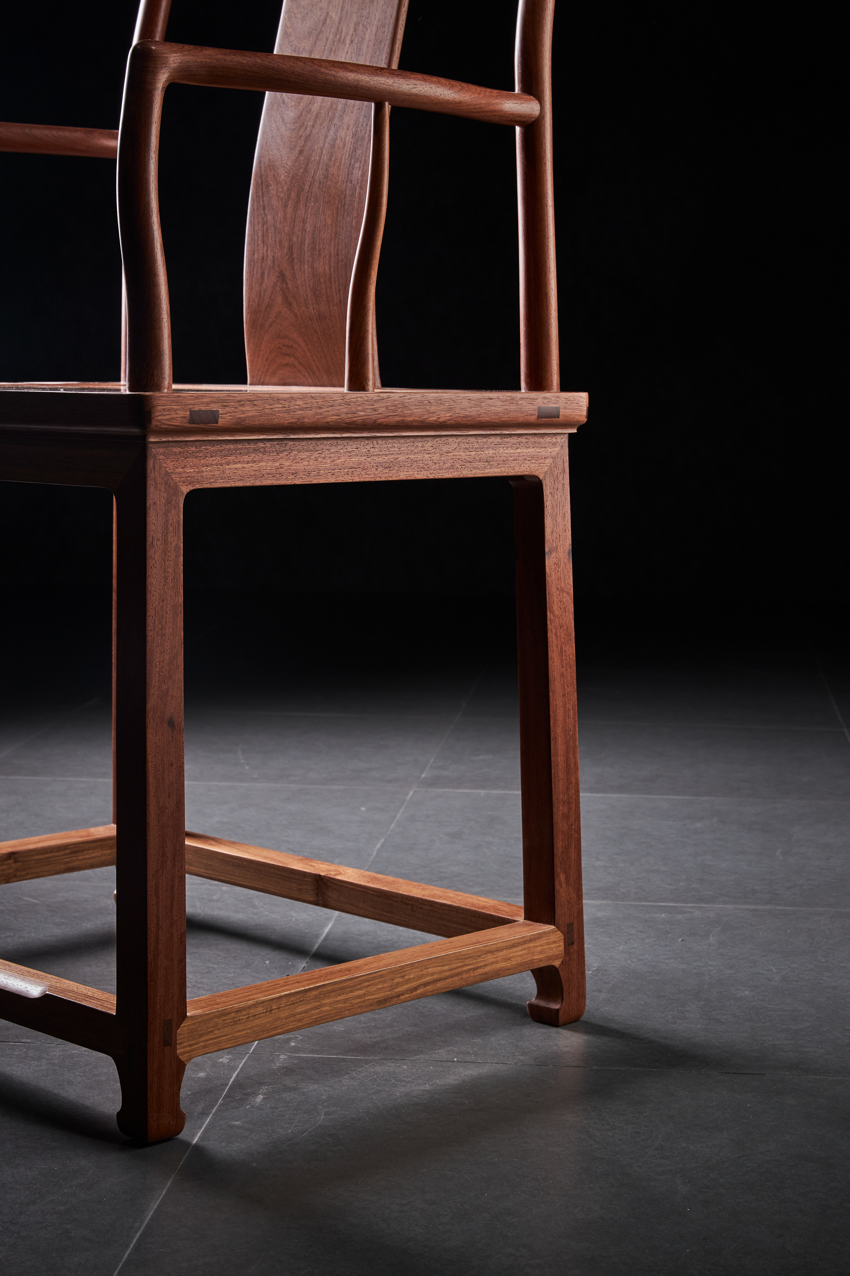 椅盘面上均用圆材,椅盘面下则用方材,形成了天圆地方的寓意,牙条紧贴椅盘面,四足内翻兜转有力的小马蹄,管脚枨并不是常见的步步高形式,而是齐平造法,因而用合掌而非格角的方式与腿足相交,以规避榫眼过分集中造成的开裂风险,踏脚枨也削出一段弯弧,有如经年使用形成的天然磨损。