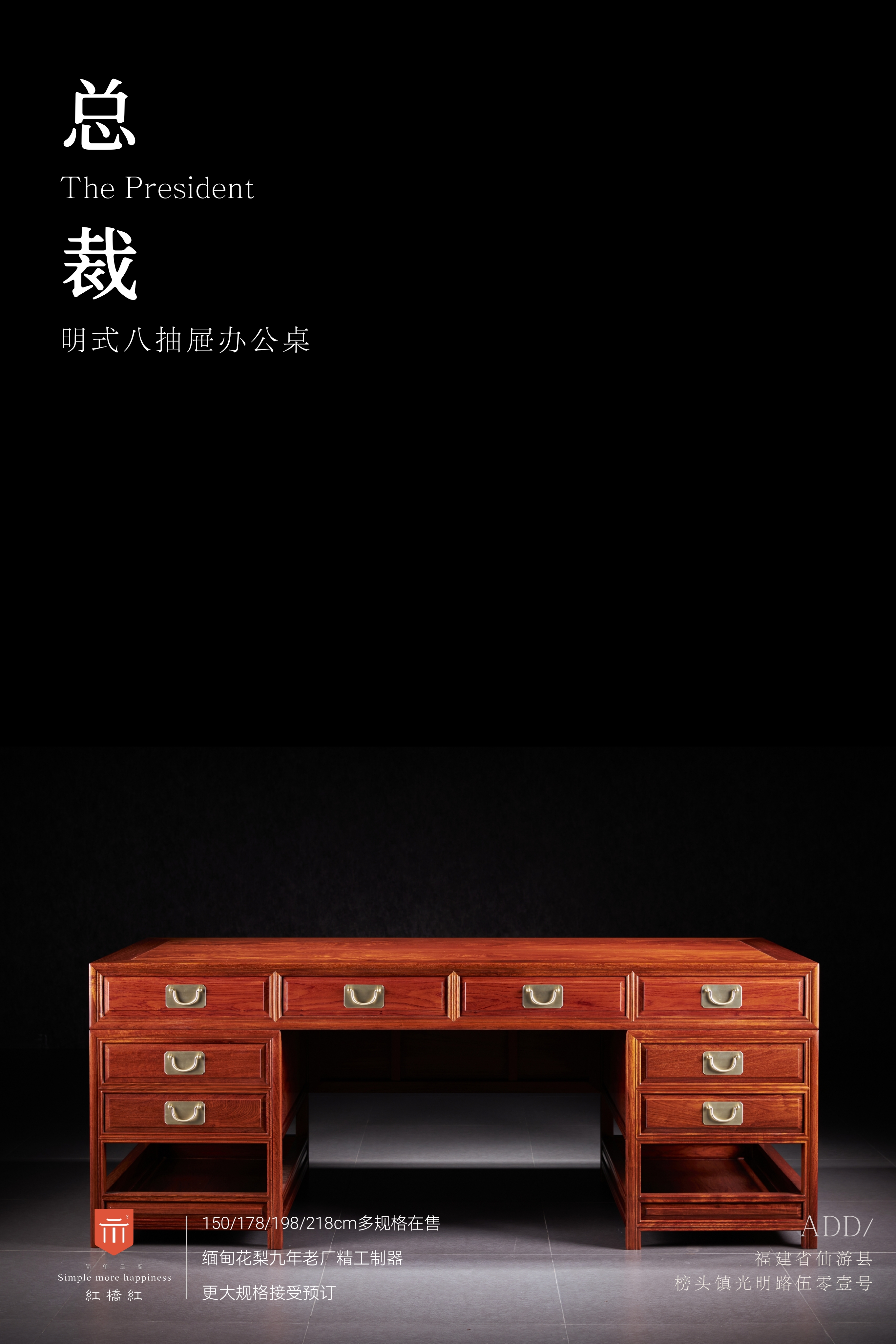 红桥红 家具严选 缅甸花梨(大果紫檀) 【150/178/198/218 八抽屉 线条素工 办公桌】