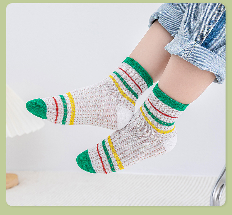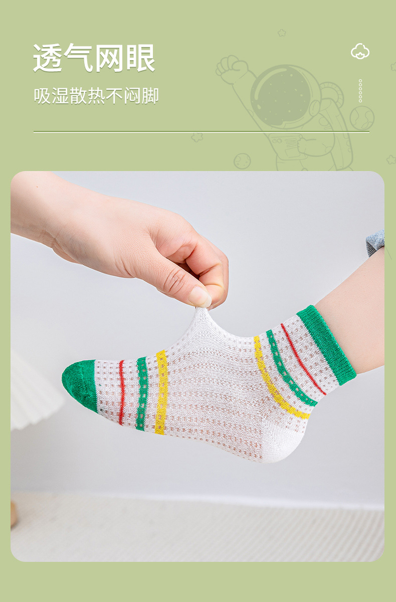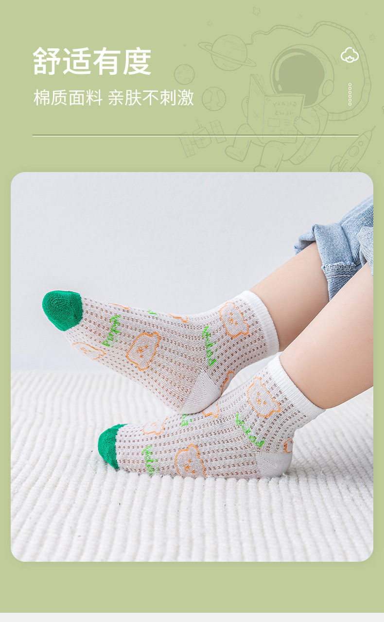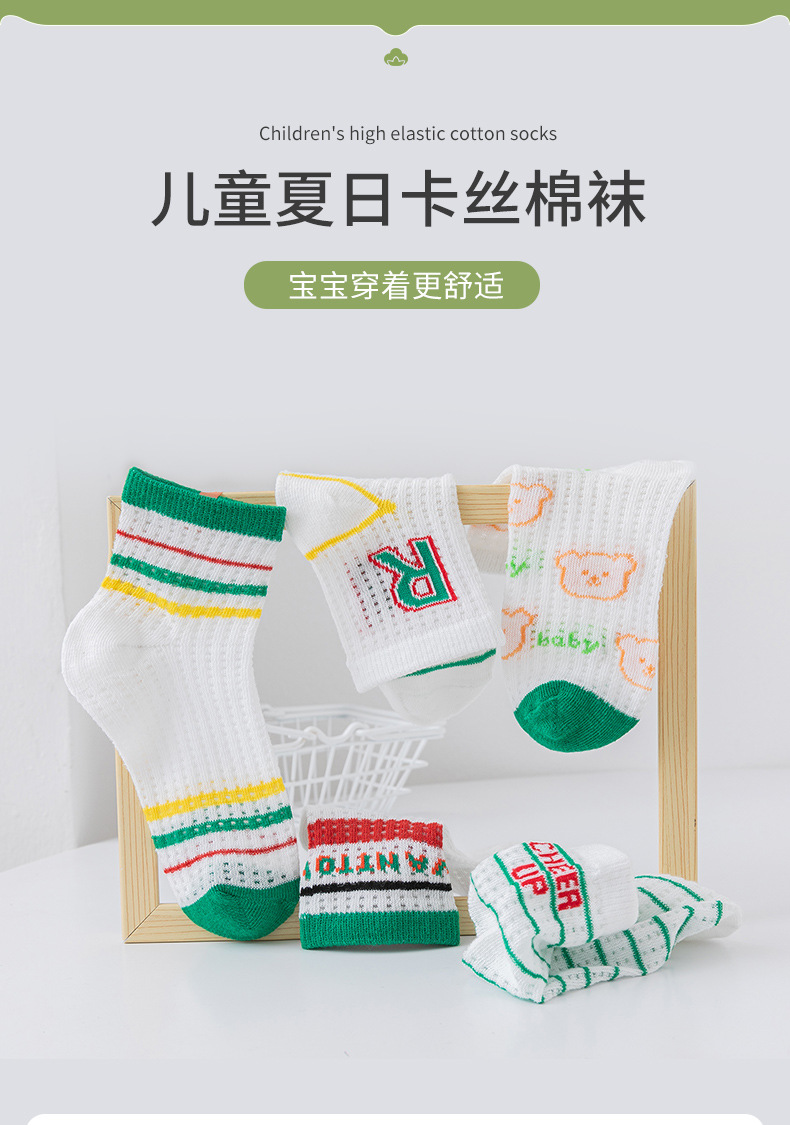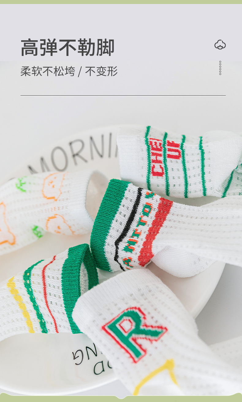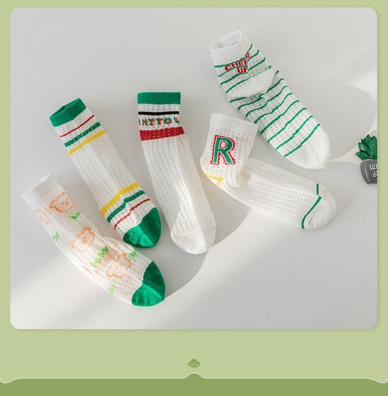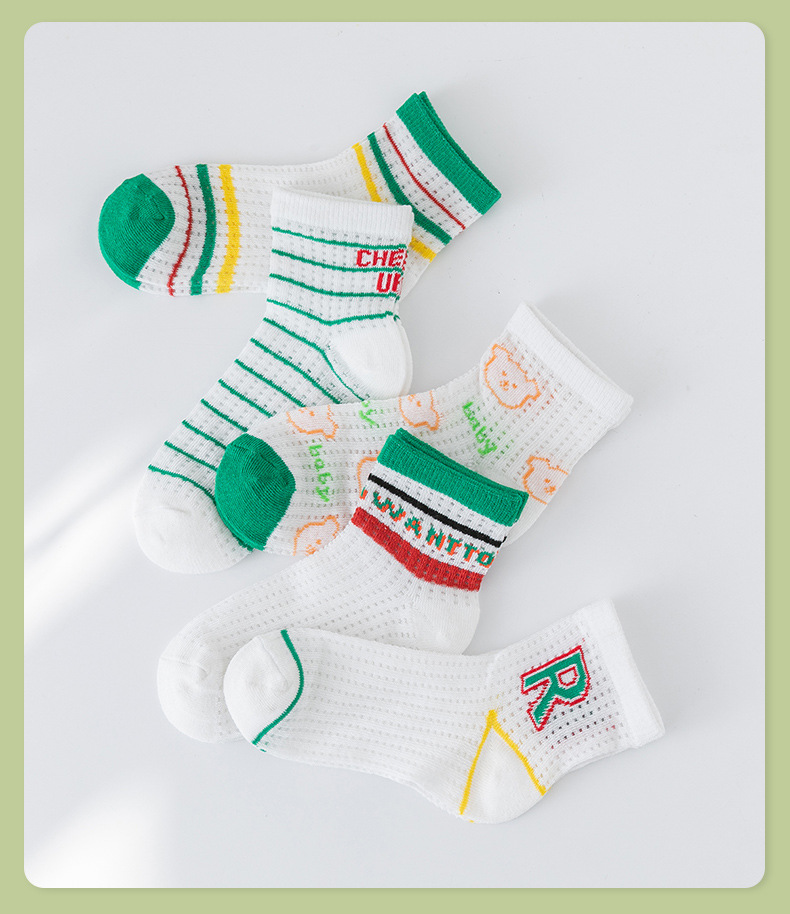 【透气卡丝网眼设计,卡通宝宝图案】五双装!儿童袜子夏天薄款 男童女童网眼袜 卡通字母运动宝宝中筒袜a类-QQ