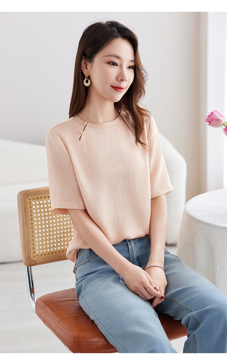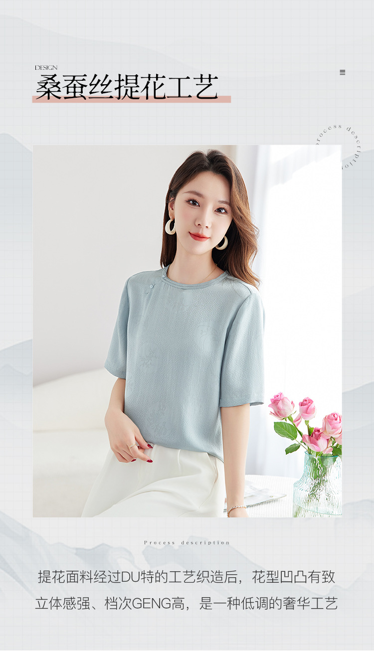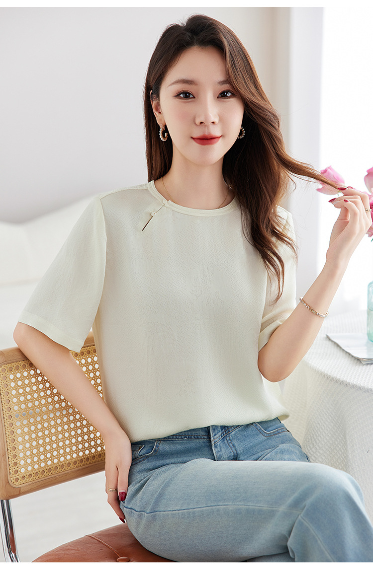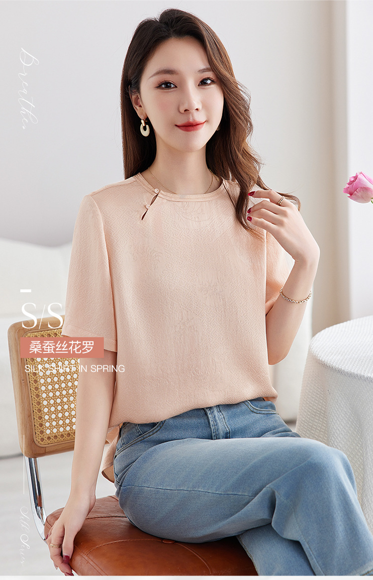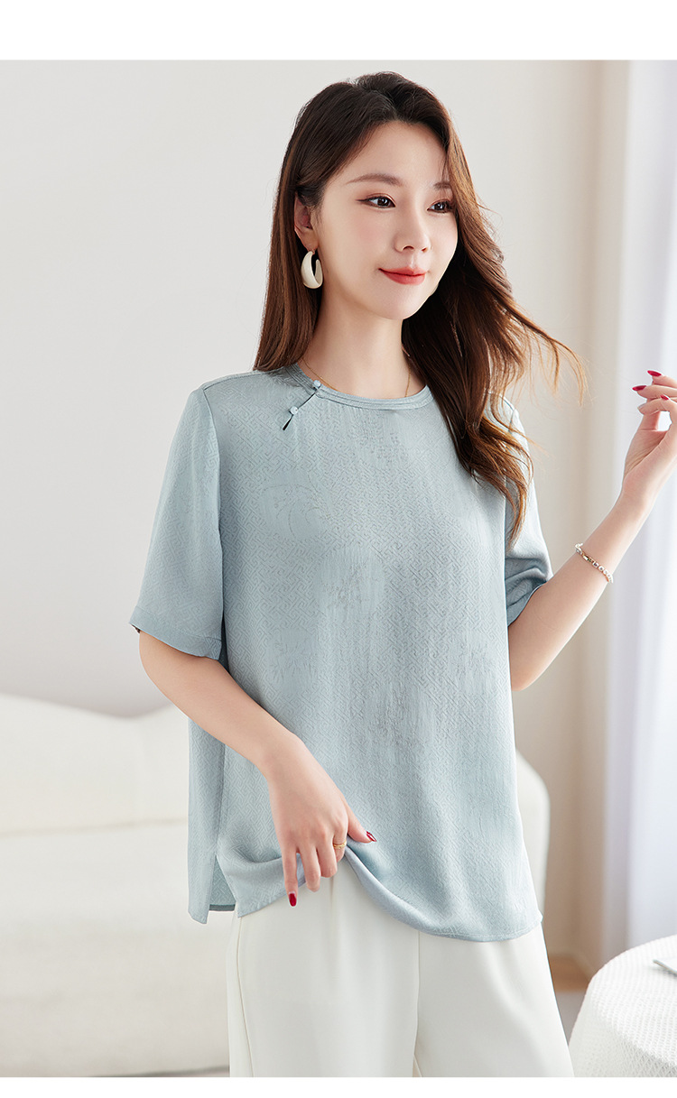 丁摩 【100%桑蚕丝花螺】新中式国风圆领小衫女纯色宽松短袖T恤女5ZF-9662