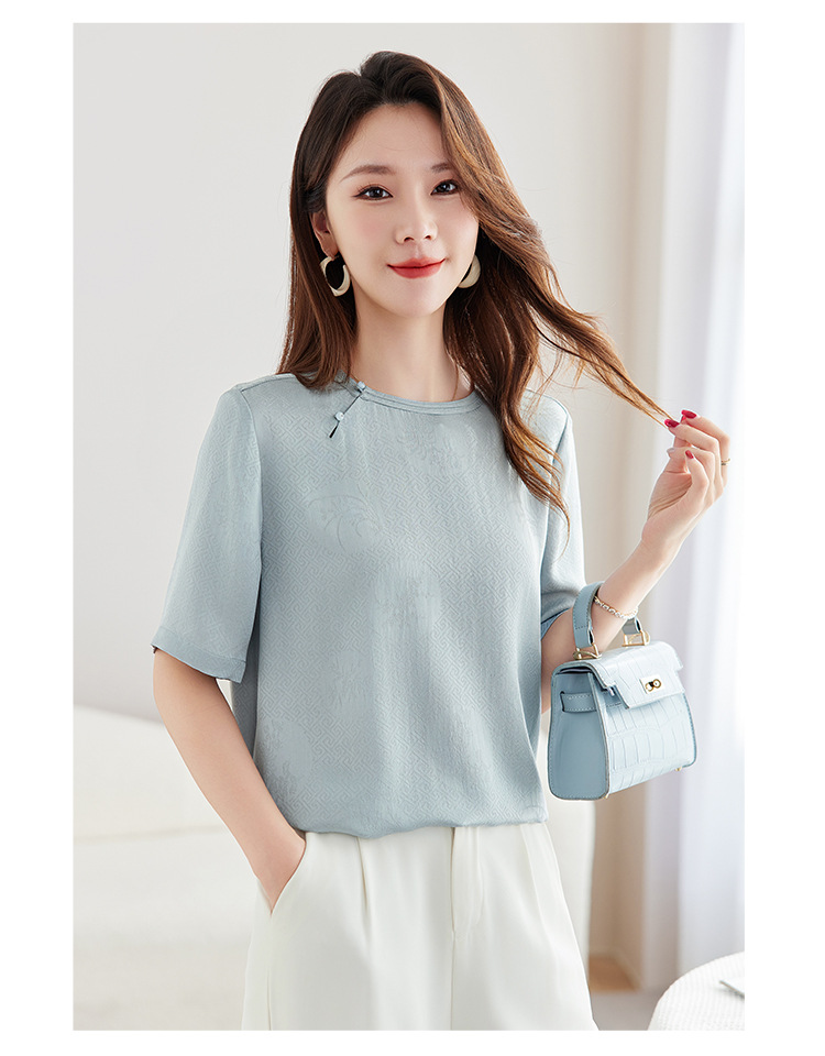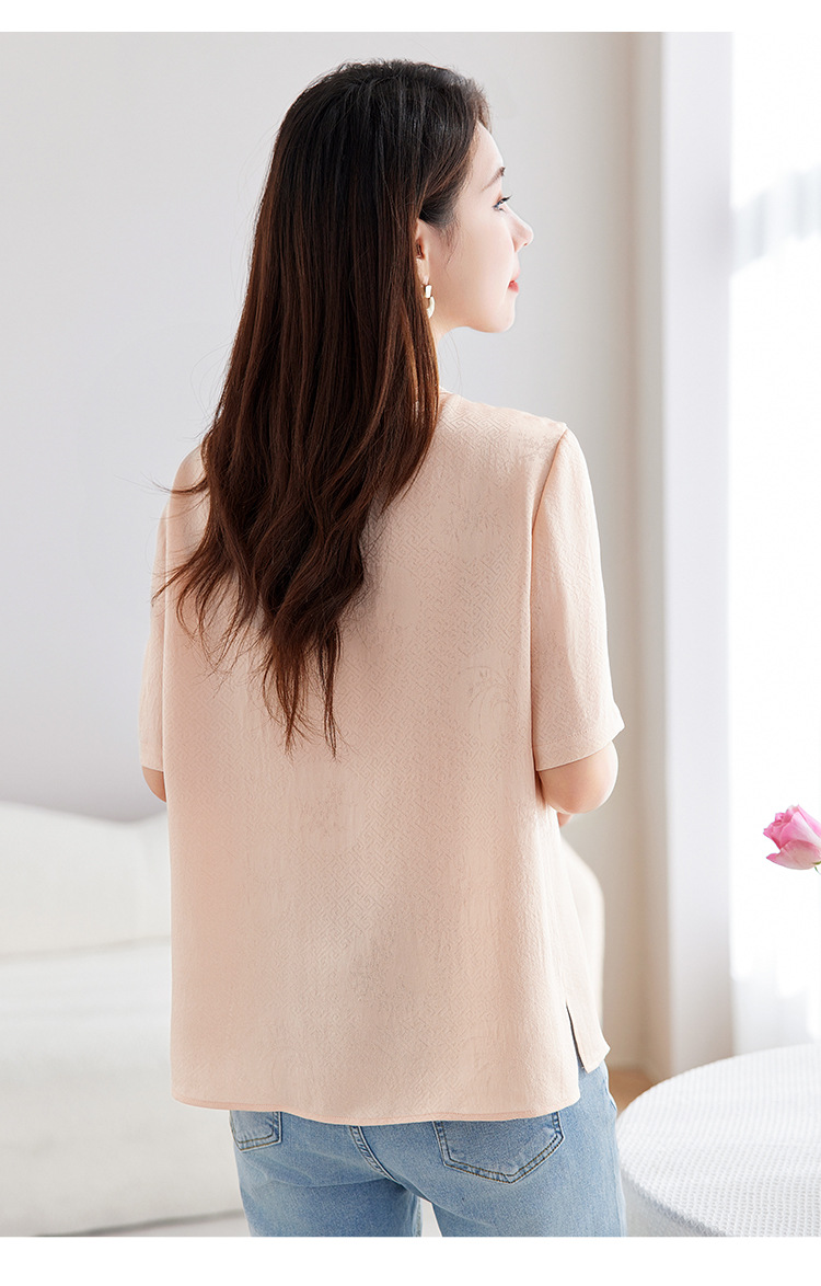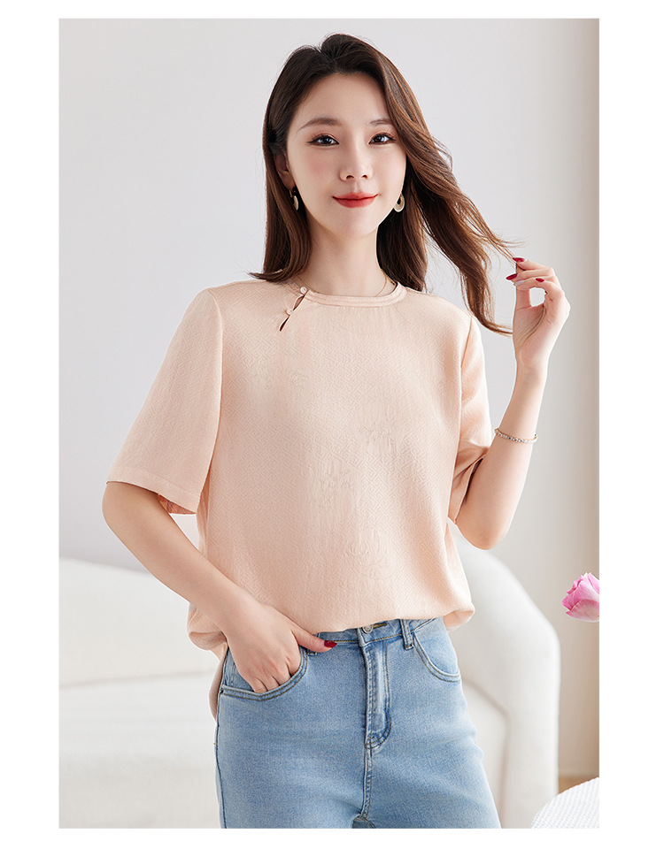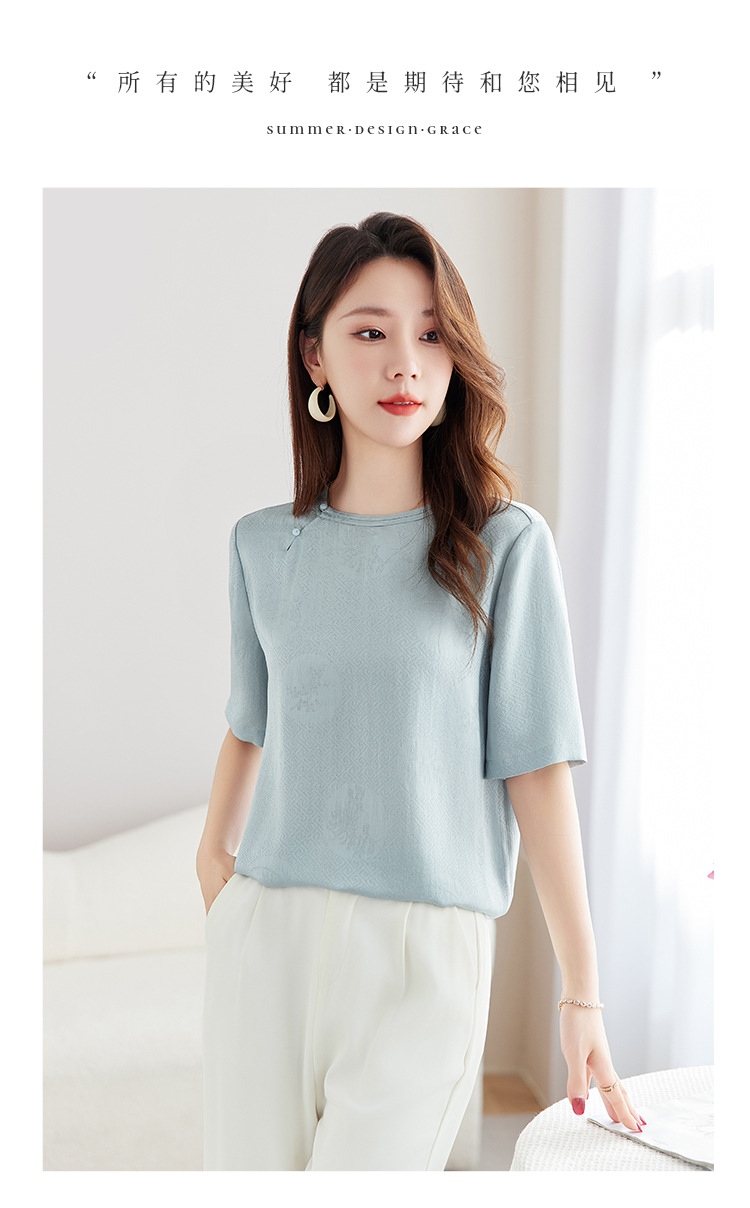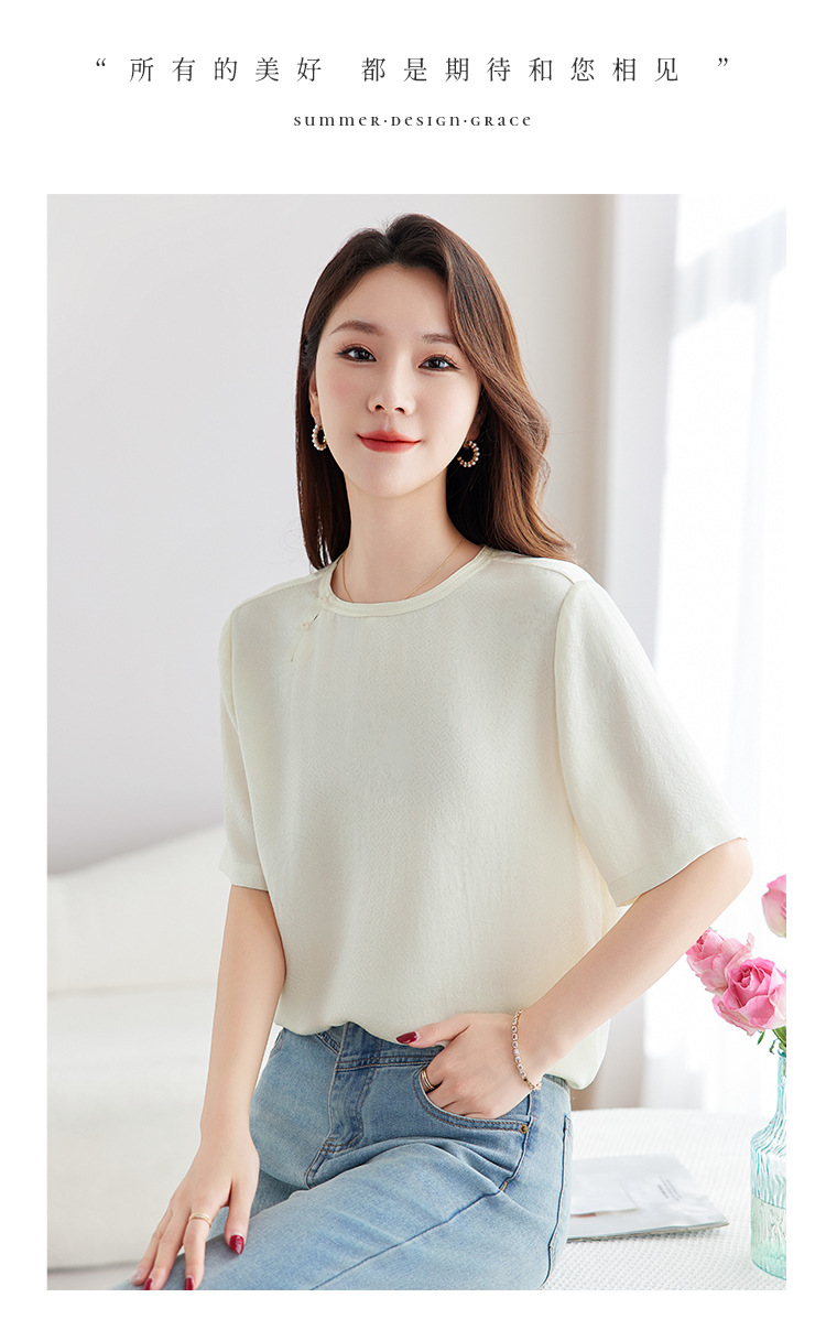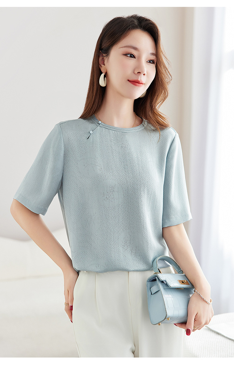 丁摩 【100%桑蚕丝花螺】新中式国风圆领小衫女纯色宽松短袖T恤女5ZF-9662