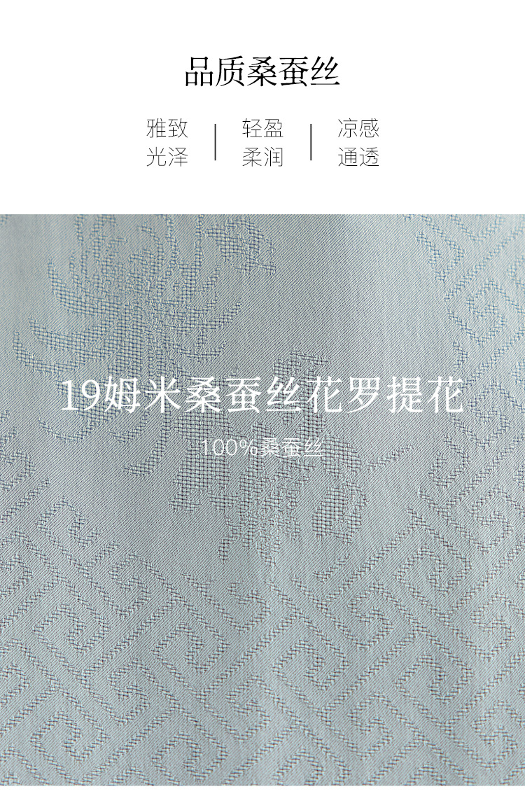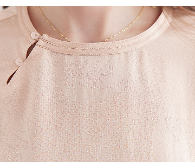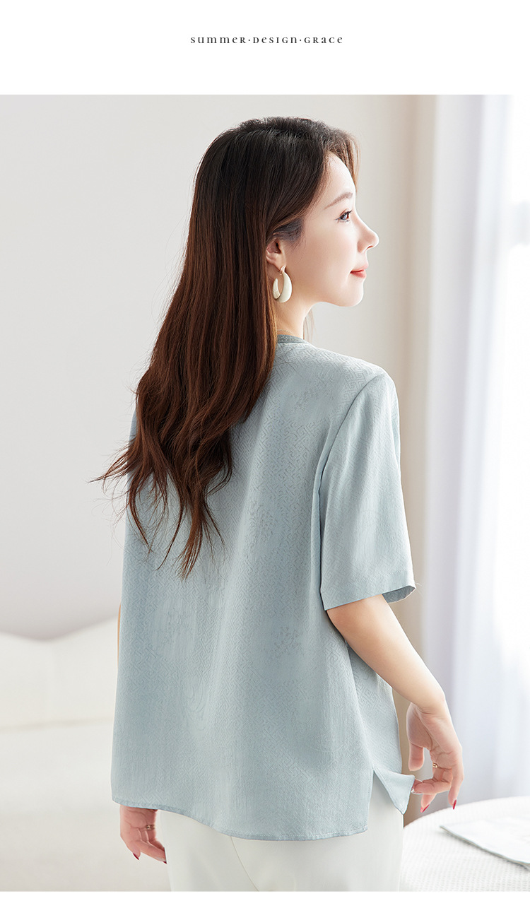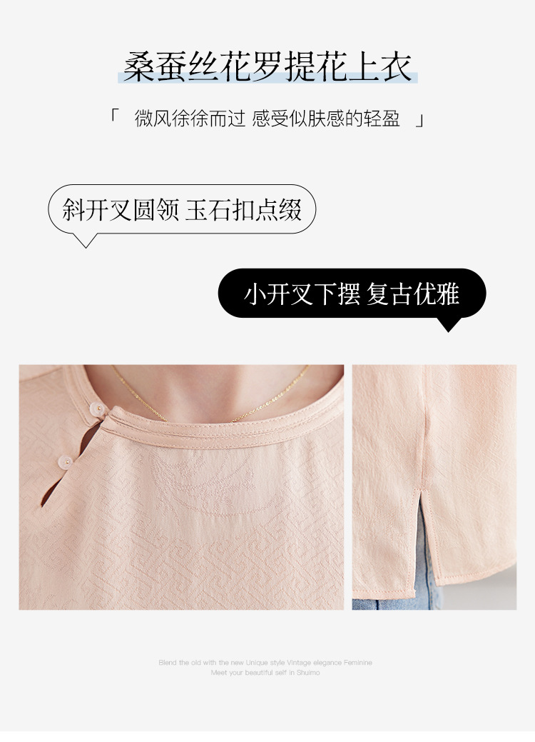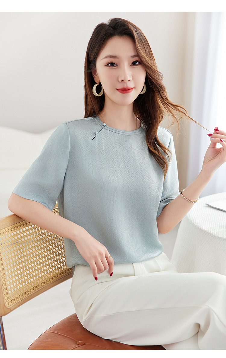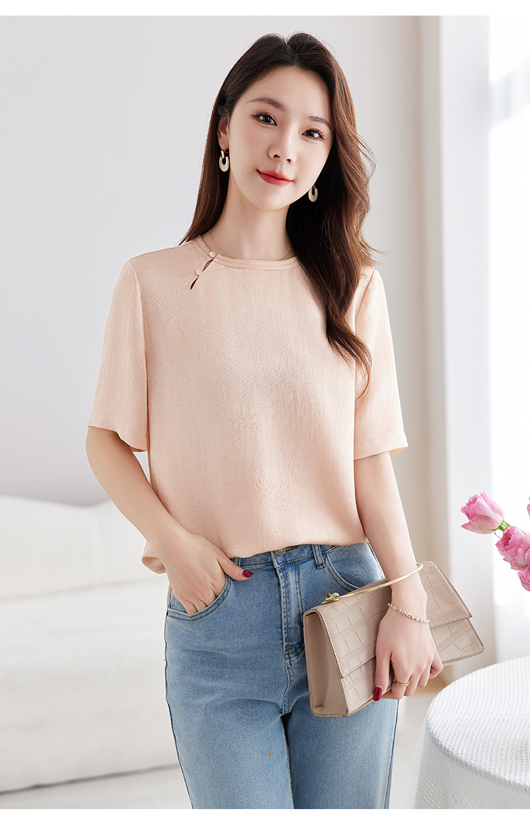 丁摩 【100%桑蚕丝花螺】新中式国风圆领小衫女纯色宽松短袖T恤女5ZF-9662