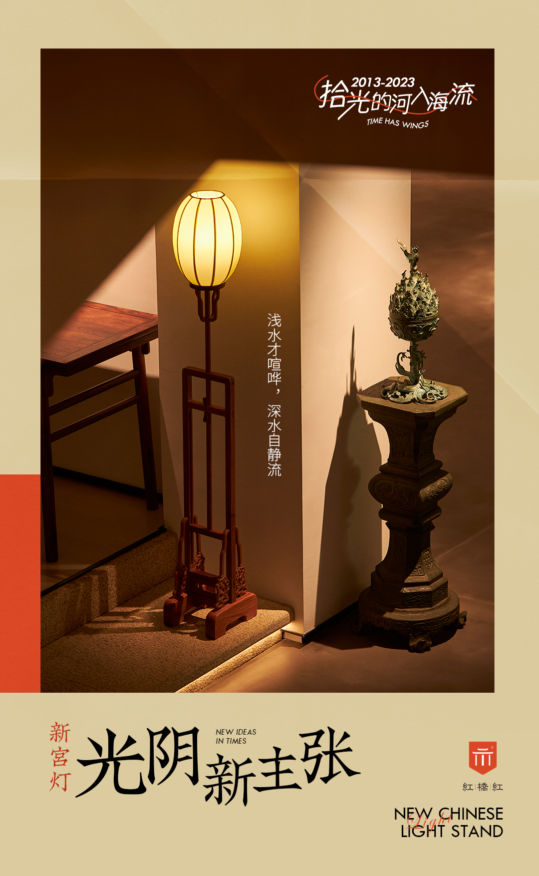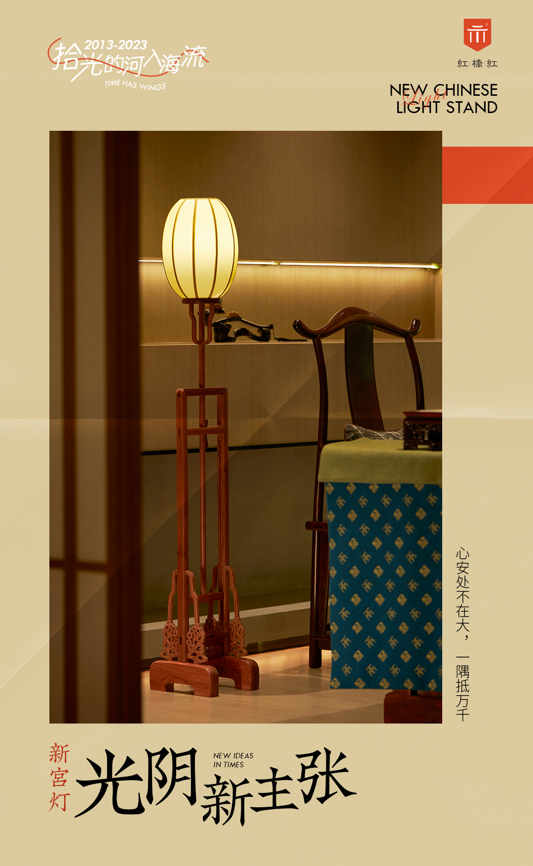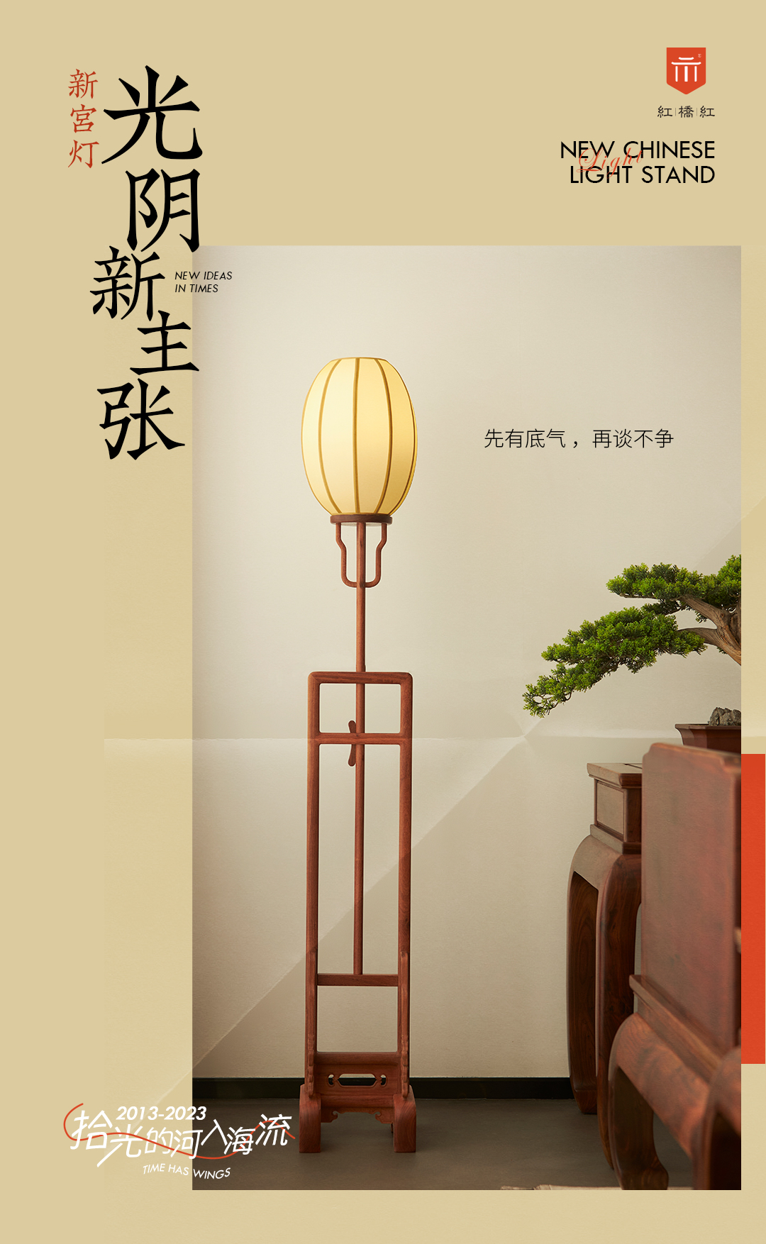灯台底座用素墩木,质朴稳定;墩木上立柱两旁站牙,用灵芝蟠错成纹,设计绝妙,在传统家具纹饰形态中亦属少见。墩木间以横枨嵌夹透雕绦环板,颇似高束腰香几,所开之禹门洞形态。灯台赏面皆作素混,以手摩挲,可体验细磨功夫,转角处处倒圆。由灯罩、挂牙、灯杆、立柱、站牙,一路向下,比例协调,圆融至深。