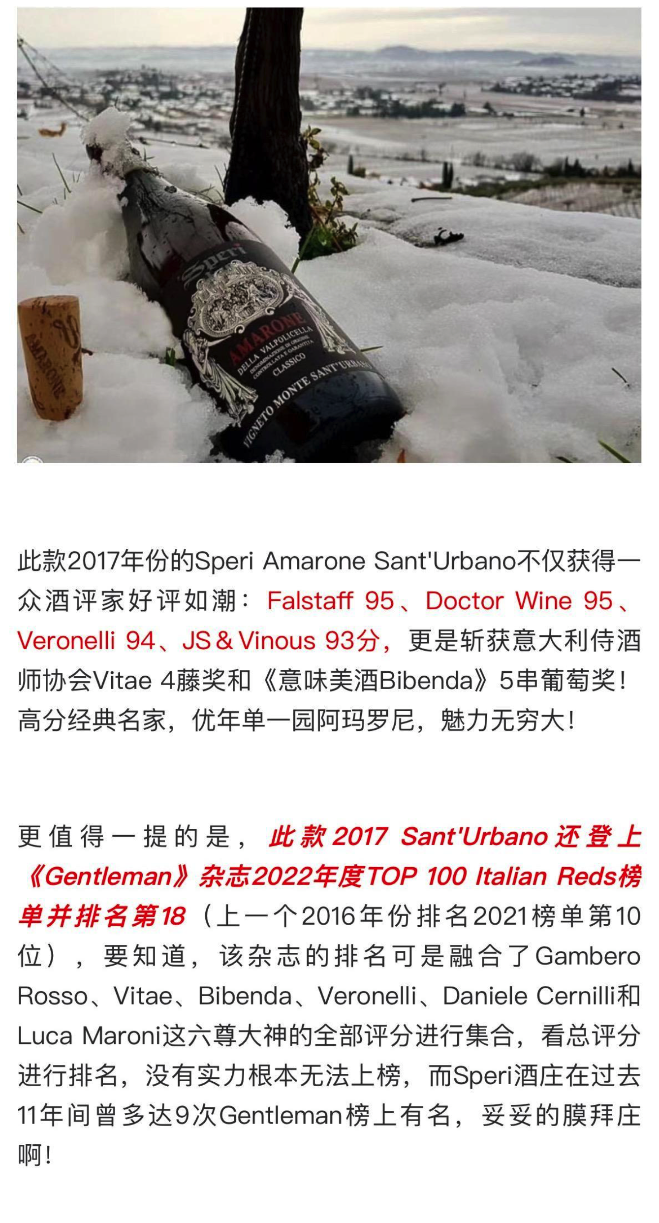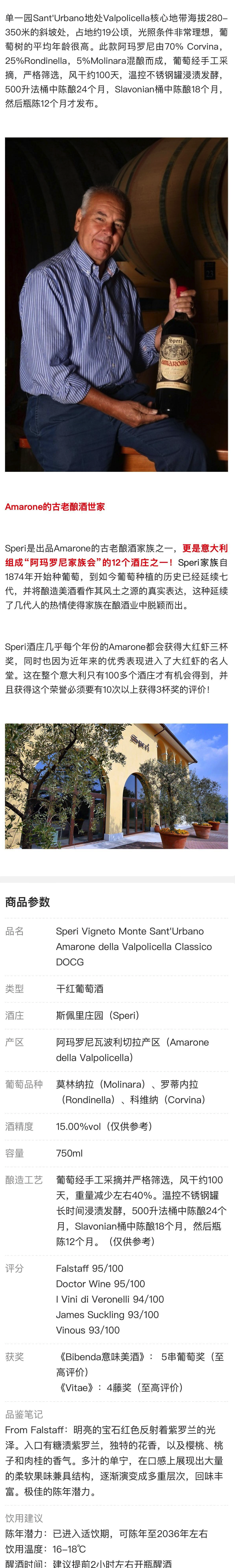 丝柏宁圣乌巴诺园经典阿玛罗尼红葡萄酒,意大利 Viticoltori Speri Amarone Classico Vigneto Monte Italy Sant'Urbano