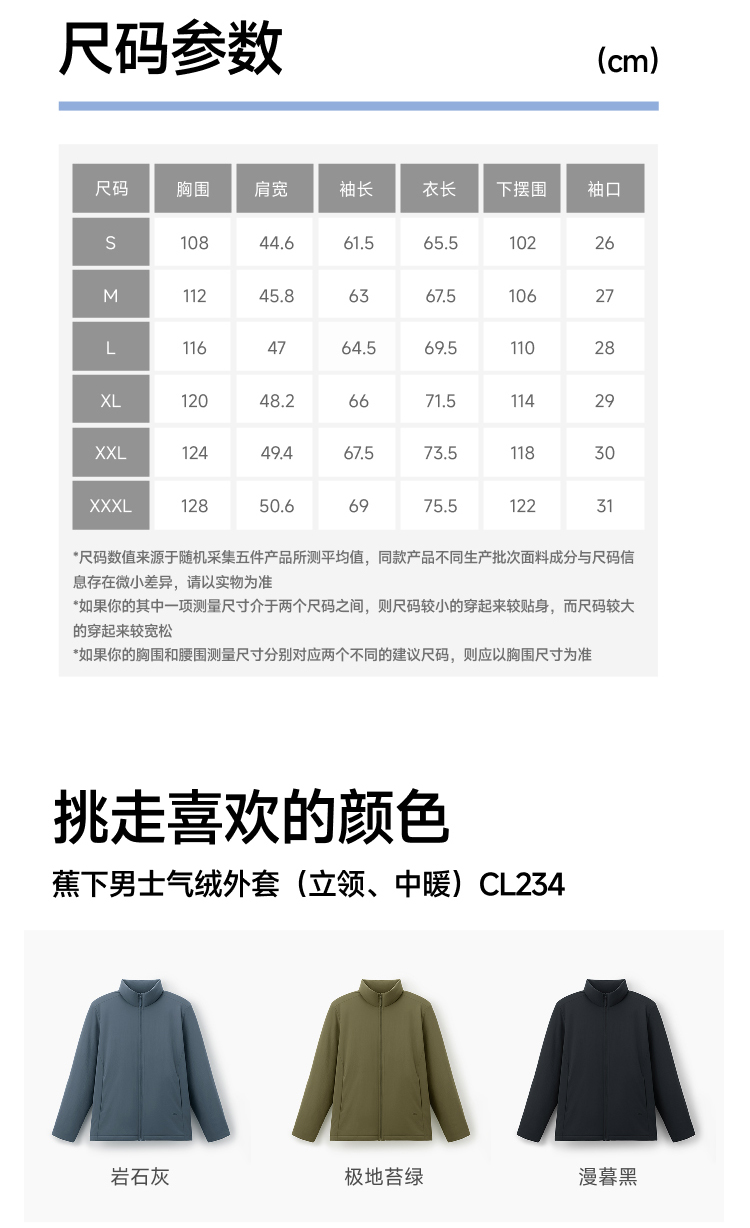 【蕉下精选】蕉下男士气绒外套(立领、中暖)CL23425