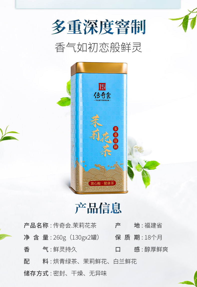 传奇会茶叶 茉莉花茶福建茶叶花草茶2罐装共260g