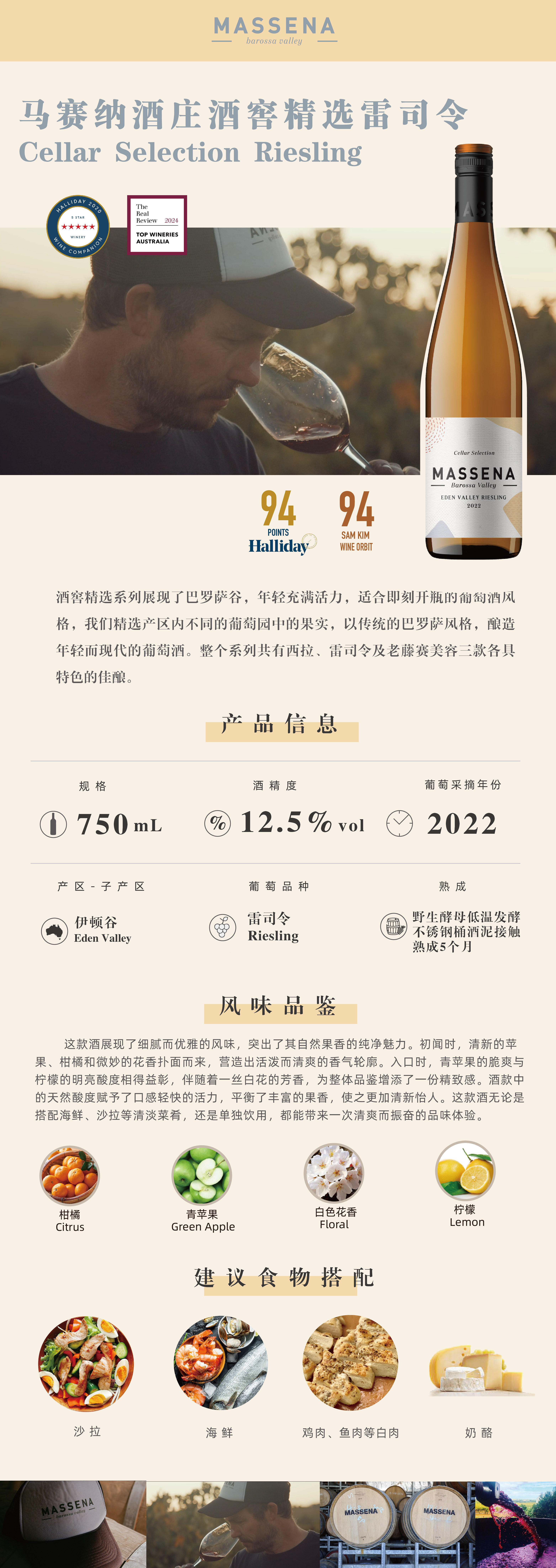 【损标清仓 不退不换】马赛纳酒窖精选雷司令干白葡萄酒 "Massena Cellar Selection Eden Valley Riesling损标产品拍下后不退不换! 介意勿拍哦"