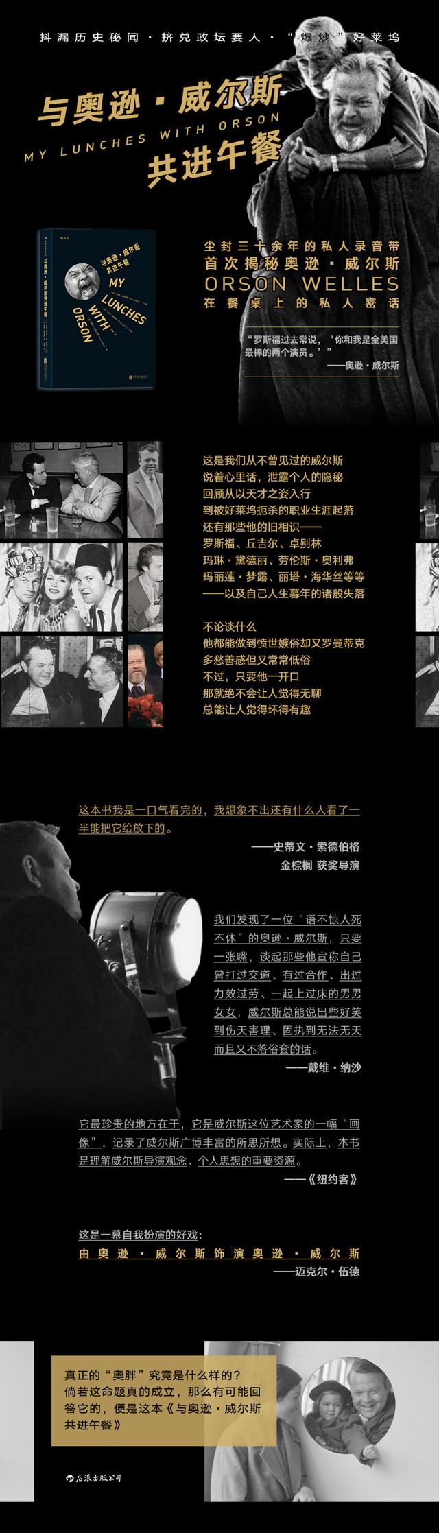 “太棒了!终于能轻松窥见威尔斯脑子里在想什么了!书中充满了辛辣的言论,所论话题包括电影、戏剧、导演、演员、政治以及讲故事的核心原则。《与奥逊·威尔斯共进午餐》可能是这位讲故事领域的巨巨蕞后蕞伟大的作品!”