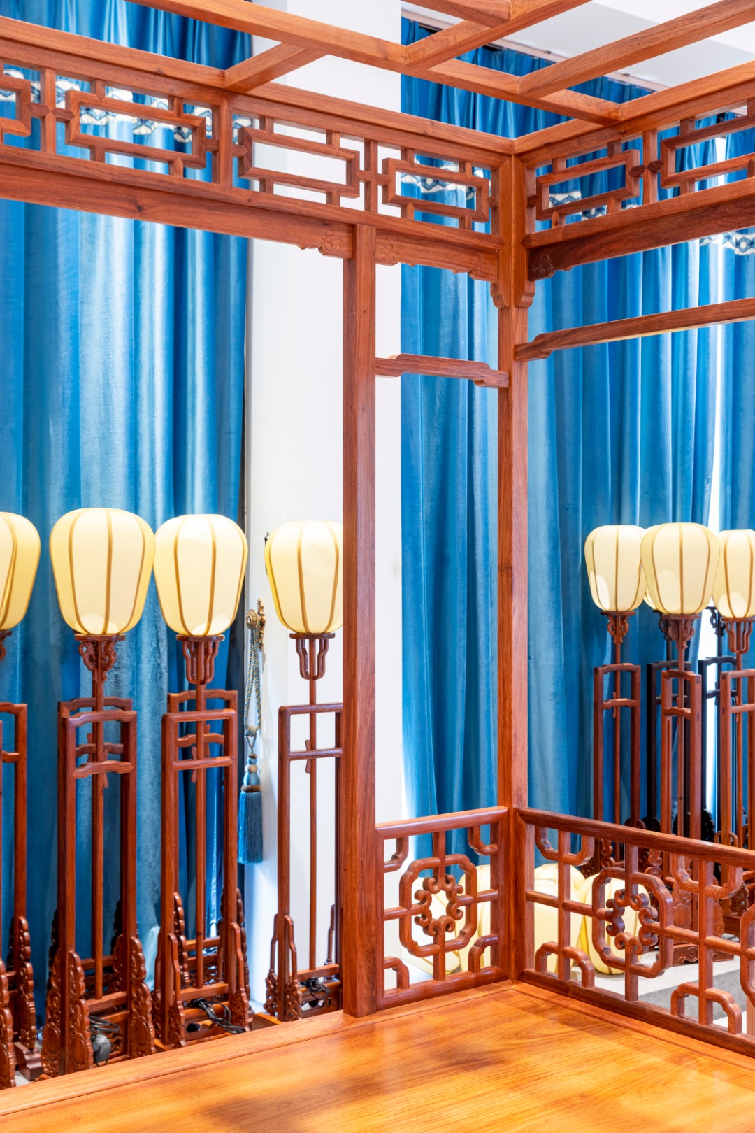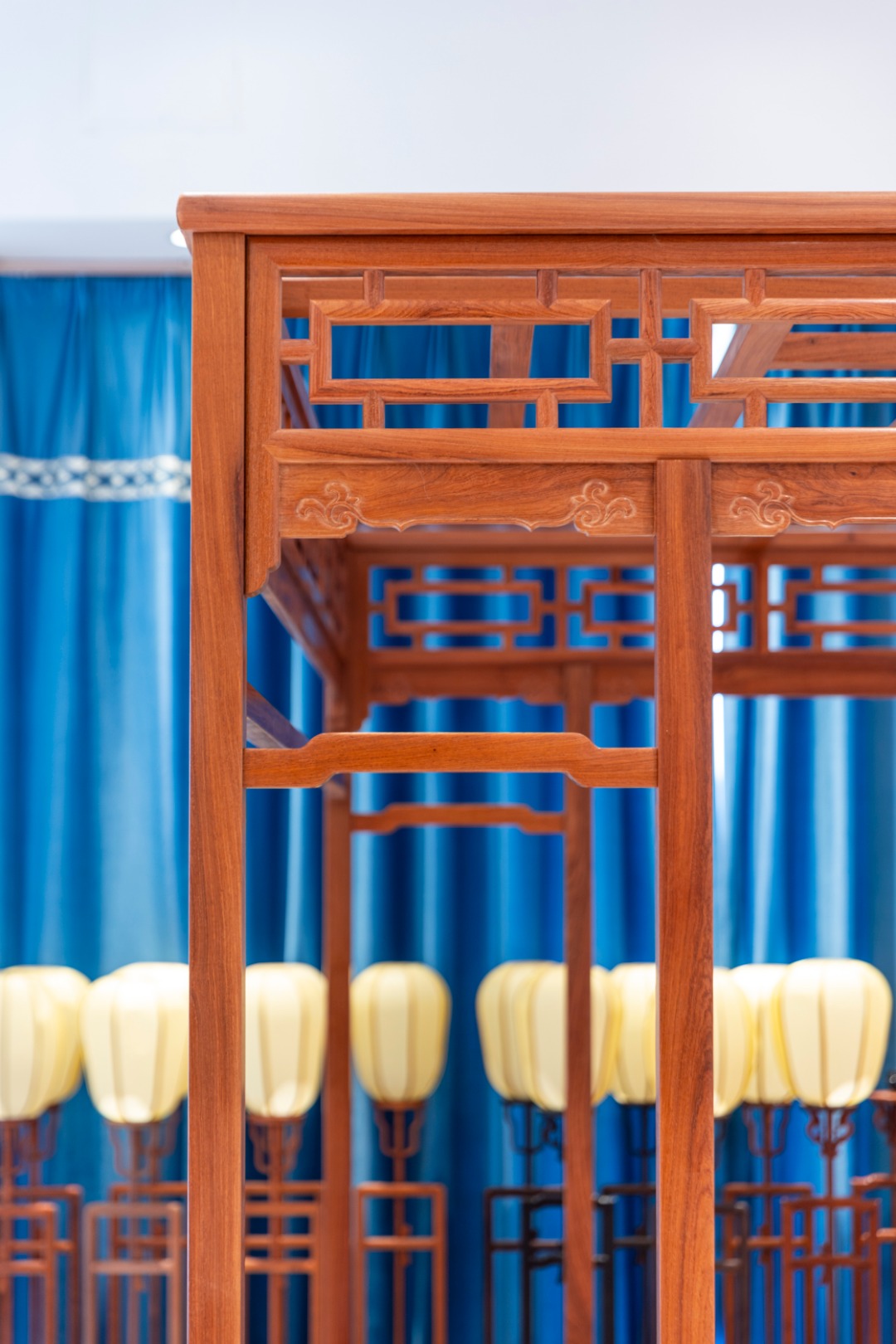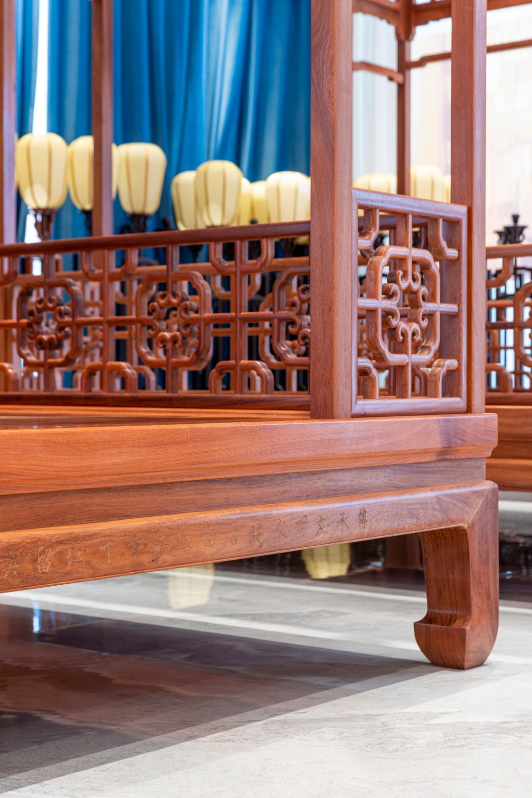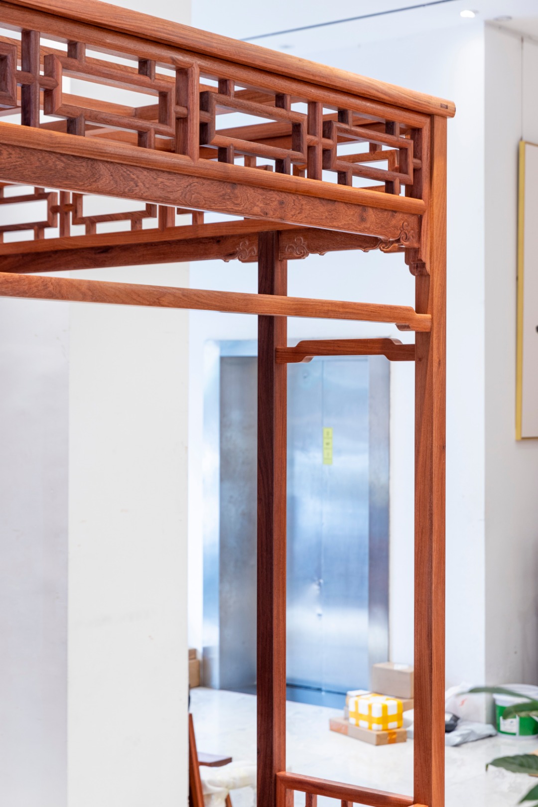 此床尺寸宽大,四面有工,每个角度皆可观可赏。围板采用攒接和斗簇两种手法造成,十字连委角方格,格内八卷相抵构成四簇云纹,也称灯笼锦图案,是稀有而经典的攒接案例。刚直劲挺的马蹄,六柱支撑的屋宇结构,各结合部位便于分解组合的活榫衔接,都是经典而鲜明的明式符号。