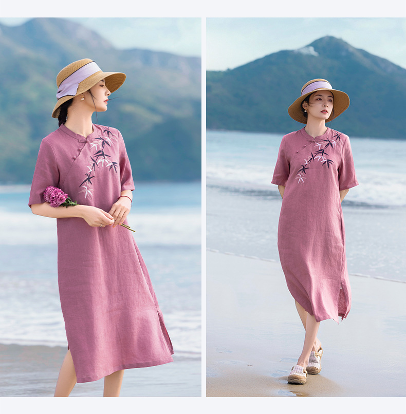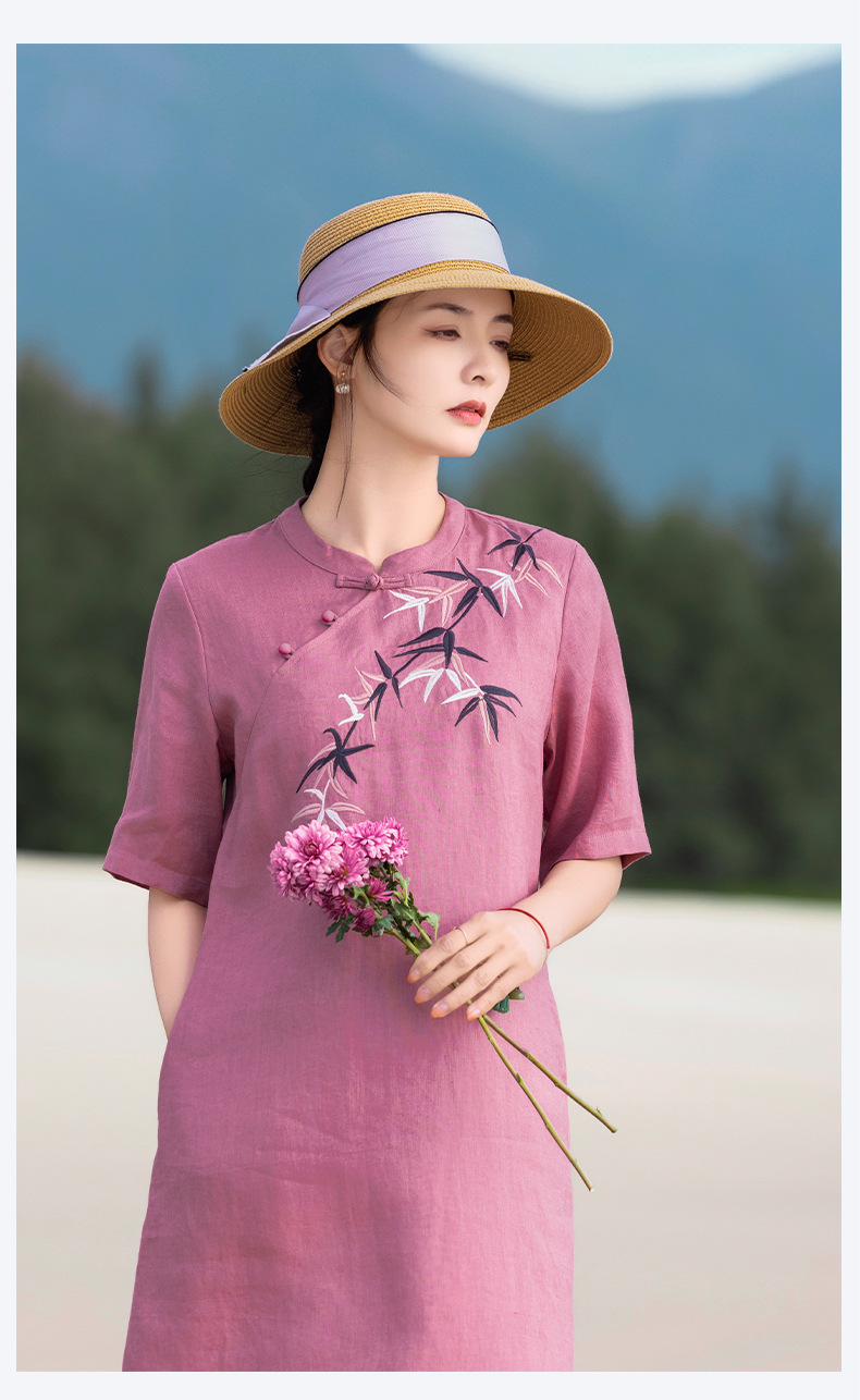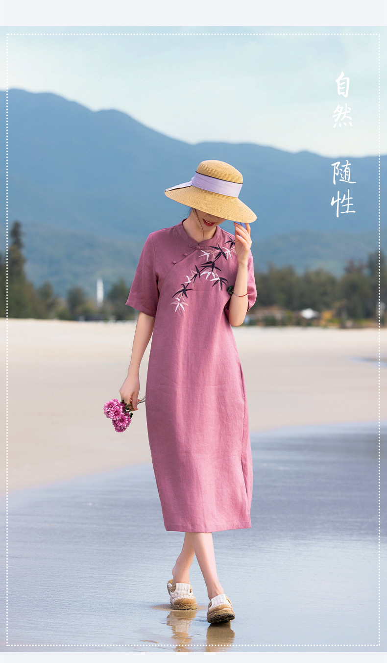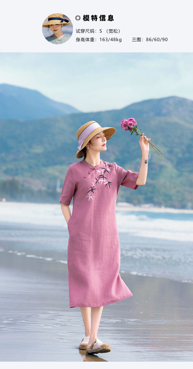 丁摩 亚麻国风立领盘扣改良式旗袍裙中袖连衣裙S511